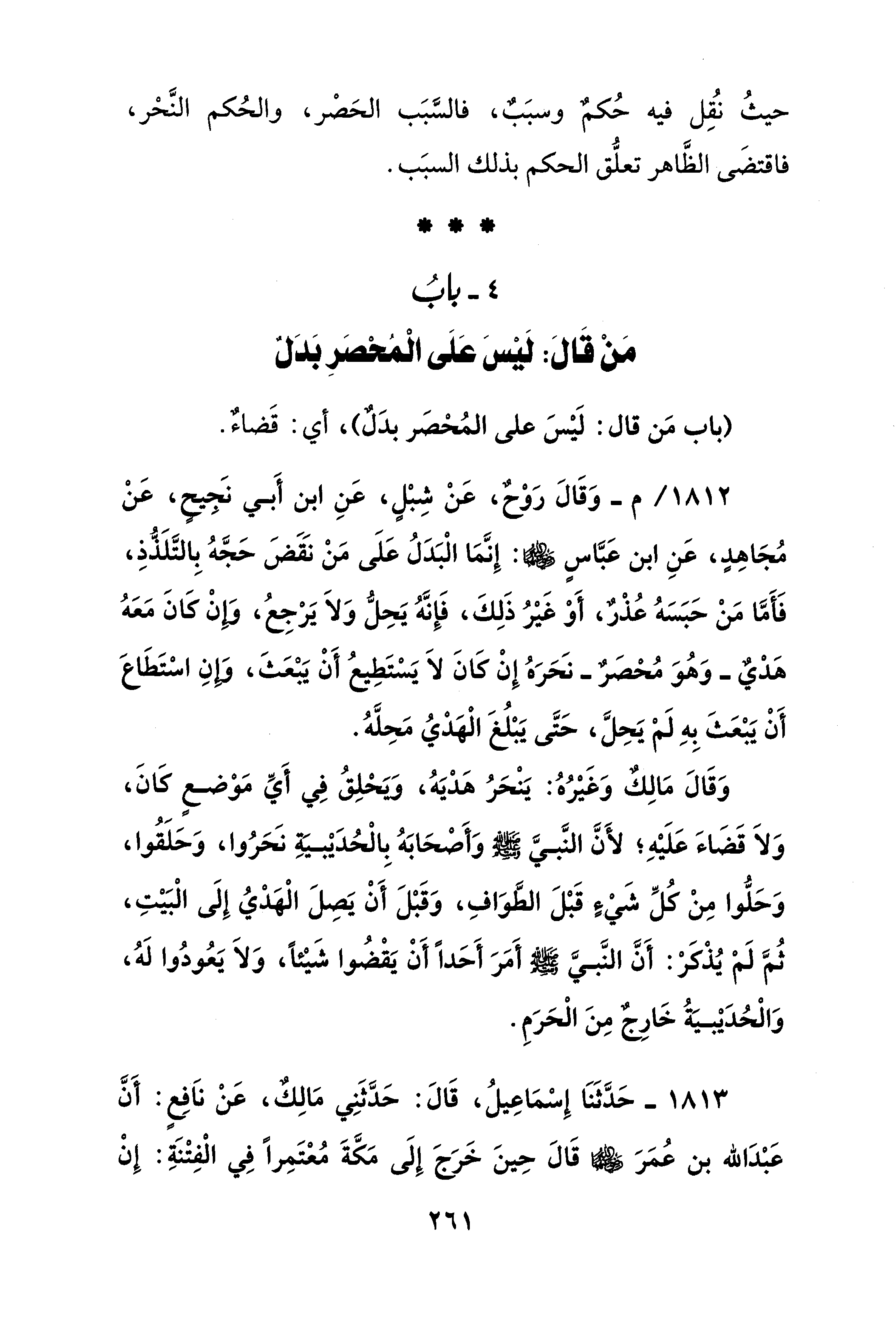 4 - بابُ مَنْ قَالَ: لَيْسَ عَلَى الْمُحْصَرِ بَدَلٌ