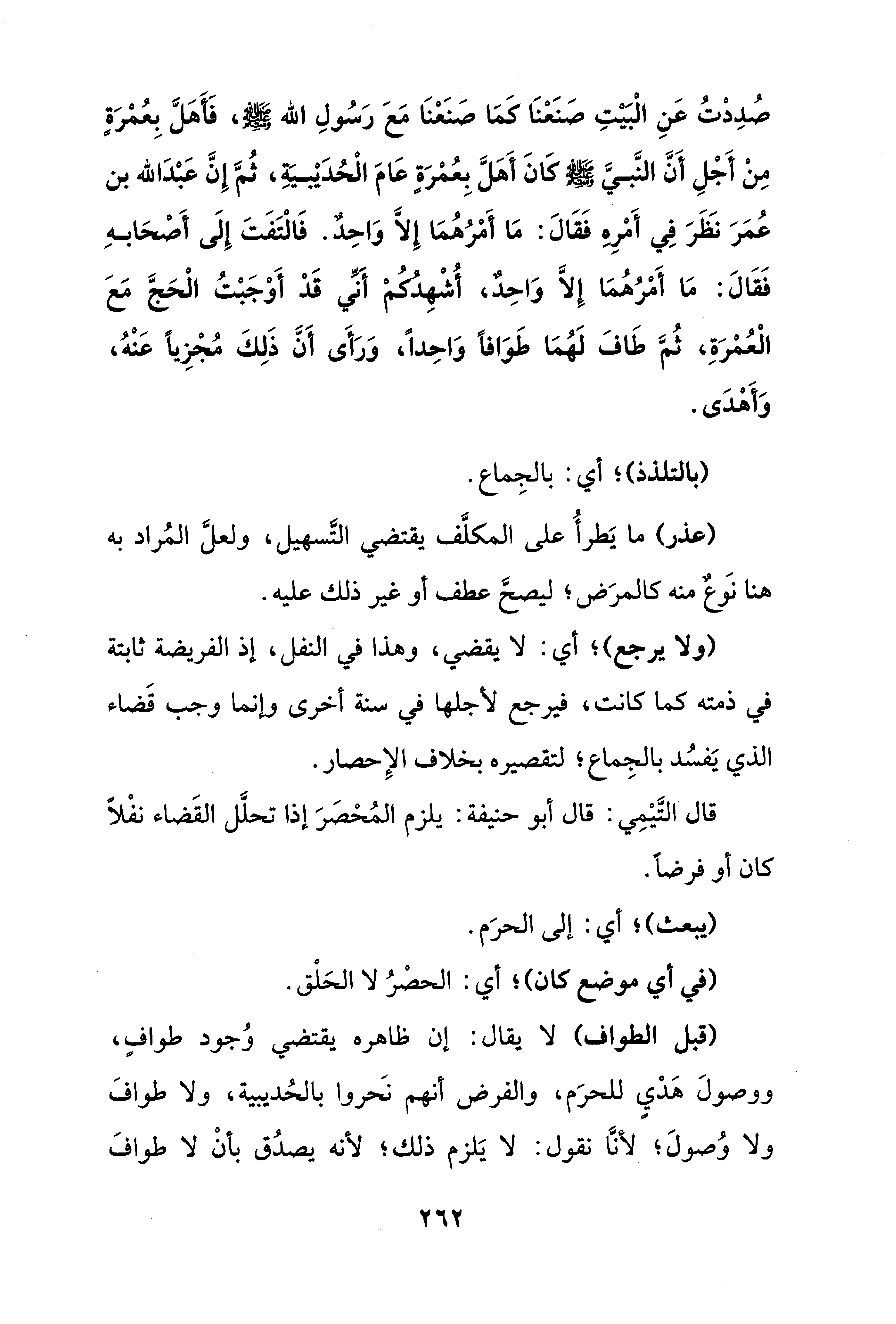 صُدِدْتُ عَنِ الْبَيْتِ صَنَعْنَا كَمَا صَنَعْنَا مَعَ رَسُولِ الله - عز وجل -، فَأهَلَّ بِعُمْرَةٍ مِنْ أَجْلِ أَنَّ النَّبيَّ - صلى الله عليه وسلم - كَانَ أَهَلَّ بِعُمْرَةٍ عَامَ الْحُدَيْبيةِ، ثُمَّ إِنَّ عَبْدَ الله بن عُمَرَ نظرَ فِي أَمْرِهِ فَقَالَ: مَا أَمْرُهُمَا إِلَّا وَاحِد. فَالْتَفَتَ إِلَى أَصحَابهِ فَقَالَ: مَا أَمْرُهُمَا إِلَّا وَاحِدٌ، أُشْهِدكمْ أنِّي قَدْ أَوْجَبْتُ الْحَجَّ مَعَ الْعُمْرَةِ، ثُمَّ طَافَ لَهُمَا طَوَافًا وَاحِدًا، وَرَأَى أَنَّ ذَلِكَ مُجْزِيًا عَنْهُ، وَأَهْدَى.