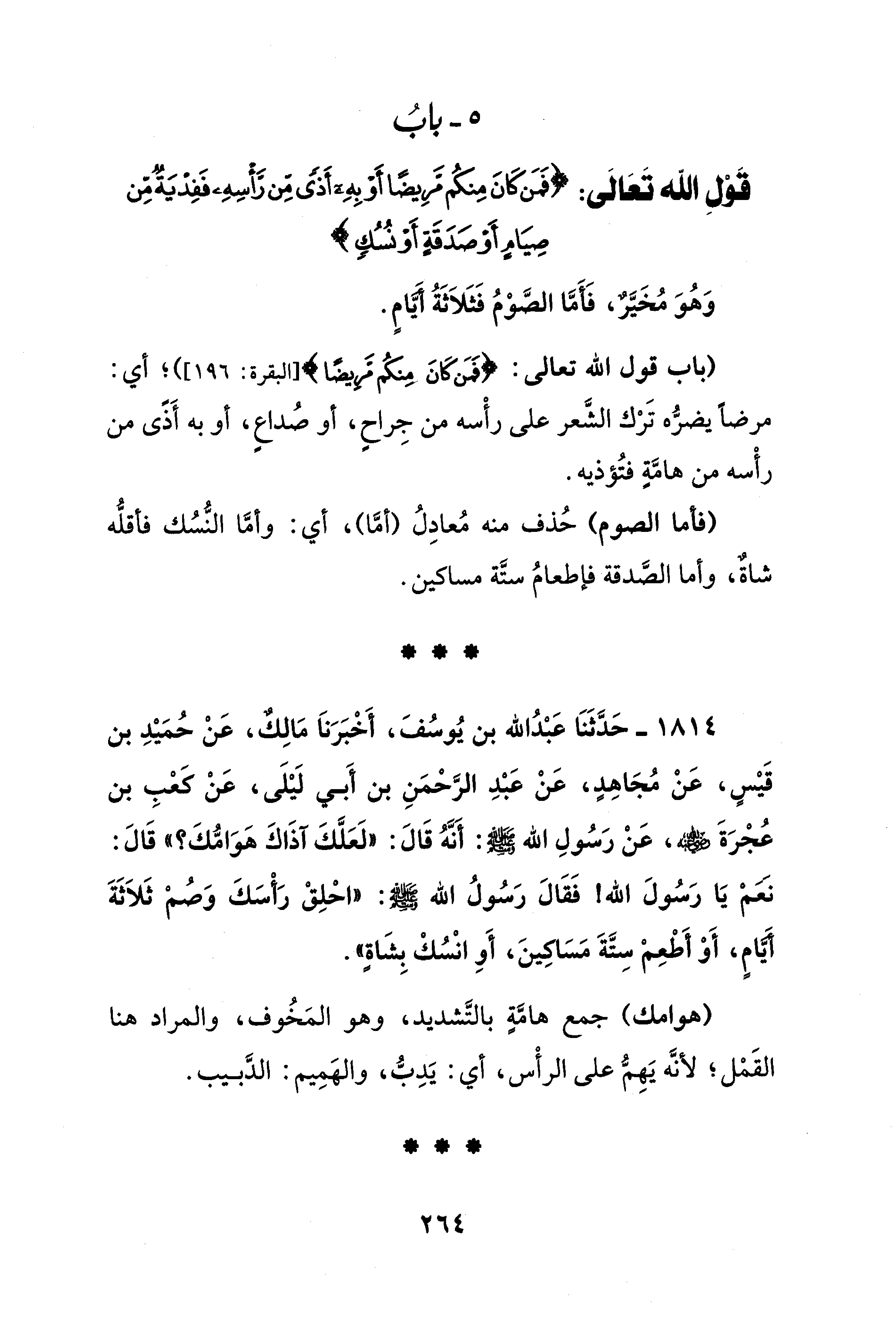 1814 - حَدَّثَنَا عَبْدُ الله بن يُوسُفَ، أَخْبَرَناَ مَالِكٌ، عَنْ حُمَيْدِ بن قَيْسٍ، عَنْ مُجَاهِدٍ، عَنْ عَبْدِ الرَّحْمَنِ بن أَبي لَيْلَى، عَنْ كَعْبِ بن عُجْرَةَ - رضي الله عنه -، عَنْ رَسُولِ الله - صلى الله عليه وسلم -: أَنَّهُ قَالَ: "لَعَلَّكَ آذَاكَ هَوَامُّكَ؟ " قَالَ: نعمْ يَا رَسُولَ الله! فَقَالَ رَسُولُ الله - عز وجل -: "احْلِقْ رَأْسَكَ وَصُمْ ثَلاَثَةَ أيَّامٍ، أَوْ أَطْعِمْ سِتَّةَ مَسَاكِينَ، أَوِ انْسُكْ بِشَاةٍ".
