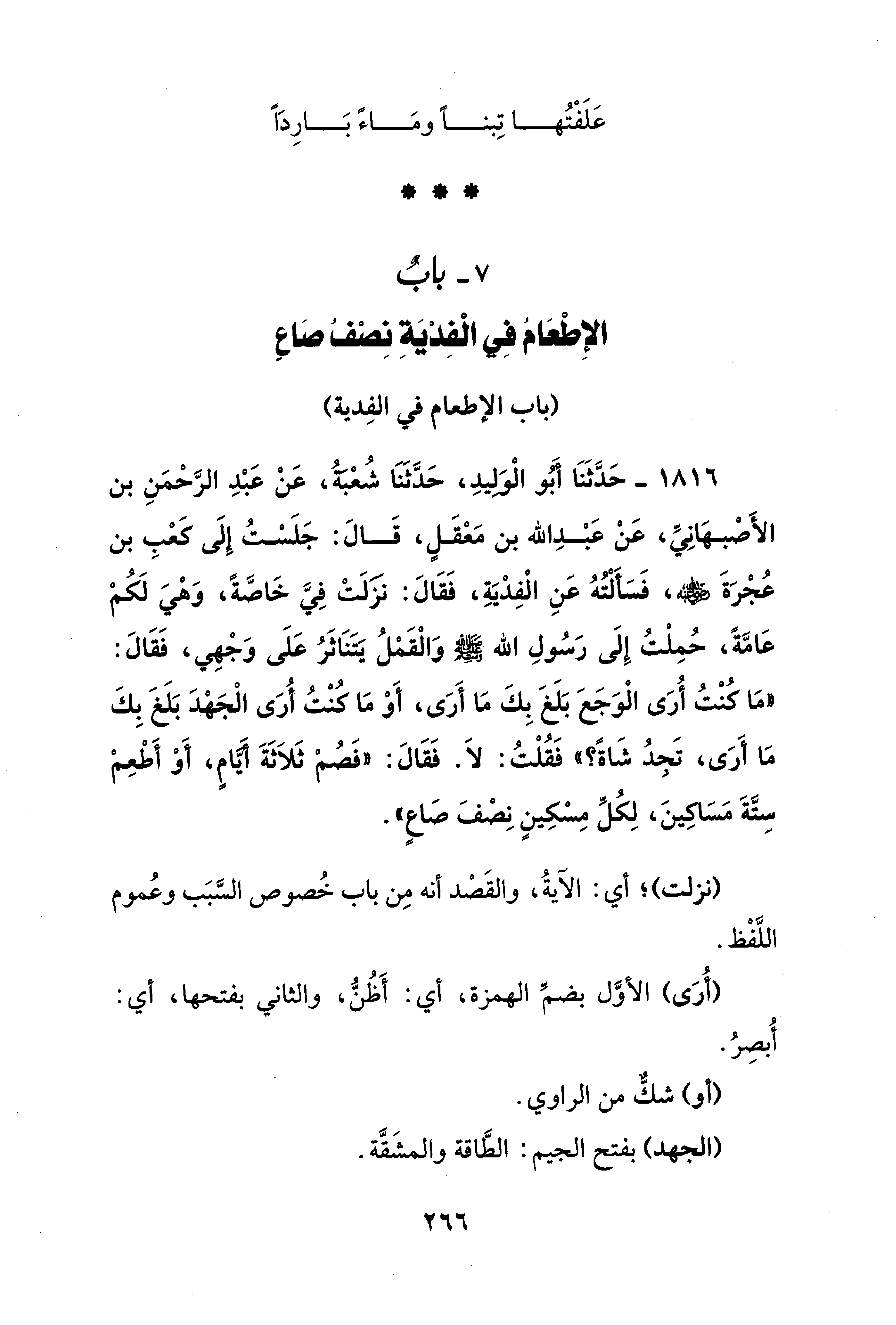 1816 - حَدَّثَنَا أَبُو الْوَليدِ، حَدَّثَنَا شُعْبةُ، عَنْ عَبْدِ الرَّحْمَنِ بن الأَصْبهَانِيِّ، عَنْ عَبْدِ الله بن مَعْقَلٍ، قَالَ: جَلَسْتُ إِلَى كعْبِ بن عُجْرَةَ - رضي الله عنه -، فَسَألْتُهُ عَنِ الْفِدْيَةِ، فَقَالَ: نزَلَتْ فِيَّ خَاصَّةً، وَهْيَ لَكُمْ عَامَّةً، حُمِلْتُ إِلَى رَسُولِ الله - صلى الله عليه وسلم - وَالْقَمْلُ يتنَاثَرُ عَلَى وَجْهِي، فَقَالَ: "مَا كنْتُ أُرَى الْوَجَعَ بَلَغَ بِكَ مَا أَرَى، أَوْ مَا كنْتُ أُرَى الْجَهْدَ بَلَغَ بِكَ مَا أَرَى، تَجِدُ شَاةً؟ " فَقُلْتُ: لاَ. فَقَالَ: "فَصُمْ ثَلاَثَةَ أيَّامٍ، أَوْ أَطْعِمْ سِتَّةَ مَسَاكينَ، لِكُلِّ مِسْكِينٍ نِصْفَ صَاعٍ".