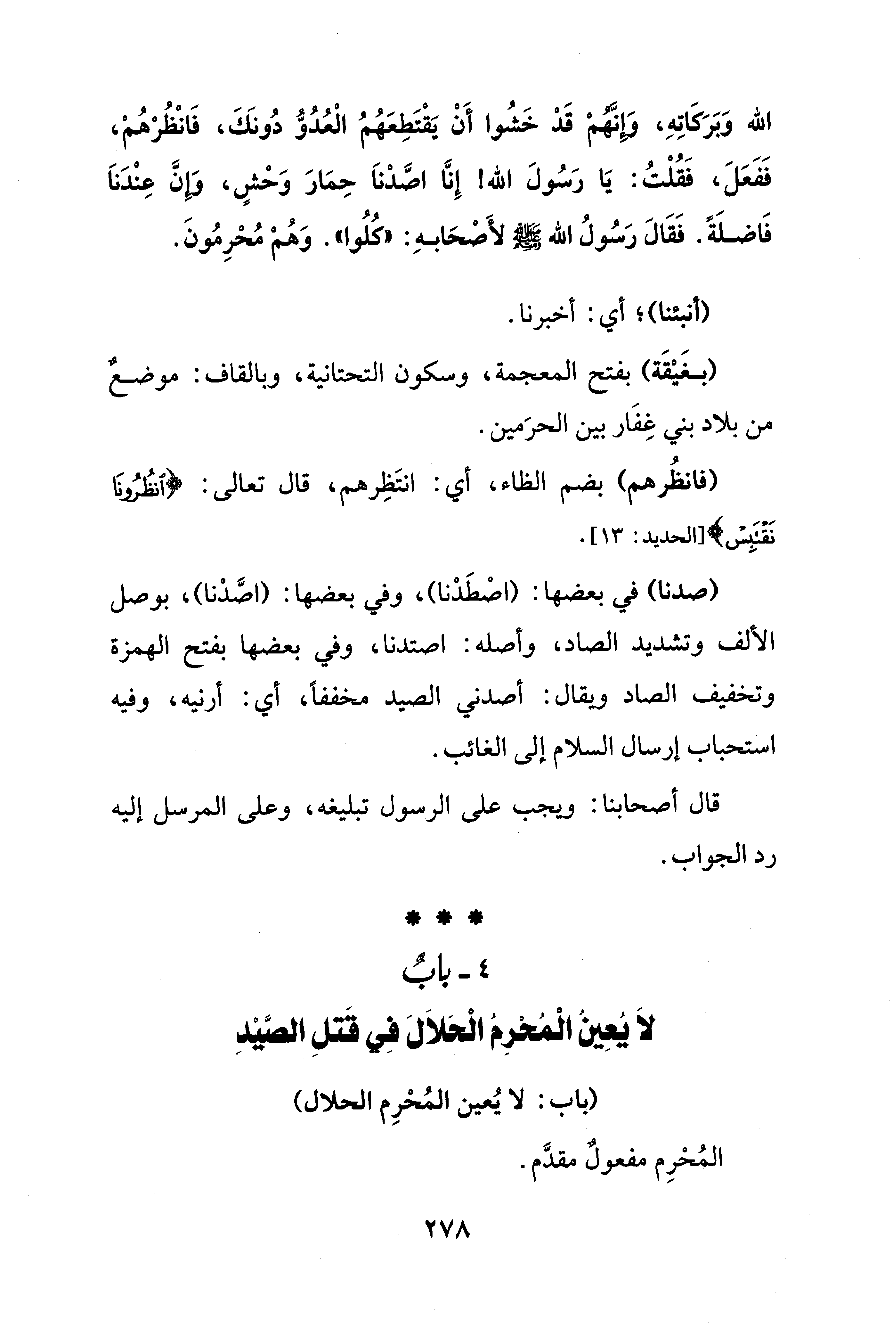 الله وَبَرَكَاتِهِ، وَإنَّهُمْ قَدْ خَشُوا أَنْ يَقْتَطِعَهُمُ الْعُدُوُّ دُونَكَ، فَانْظُرْهُمْ، فَفَعَلَ، فَقُلْتُ: يَا رَسُولَ الله! إِنَّا اصَّدْناَ حِمَارَ وَحْشٍ، وَإنَّ عِنْدَناَ فَاضلَةً. فَقَالَ رَسُولُ الله - صلى الله عليه وسلم - لأَصْحَابهِ: "كُلُوا". وَهُمْ مُحْرِمُونَ.