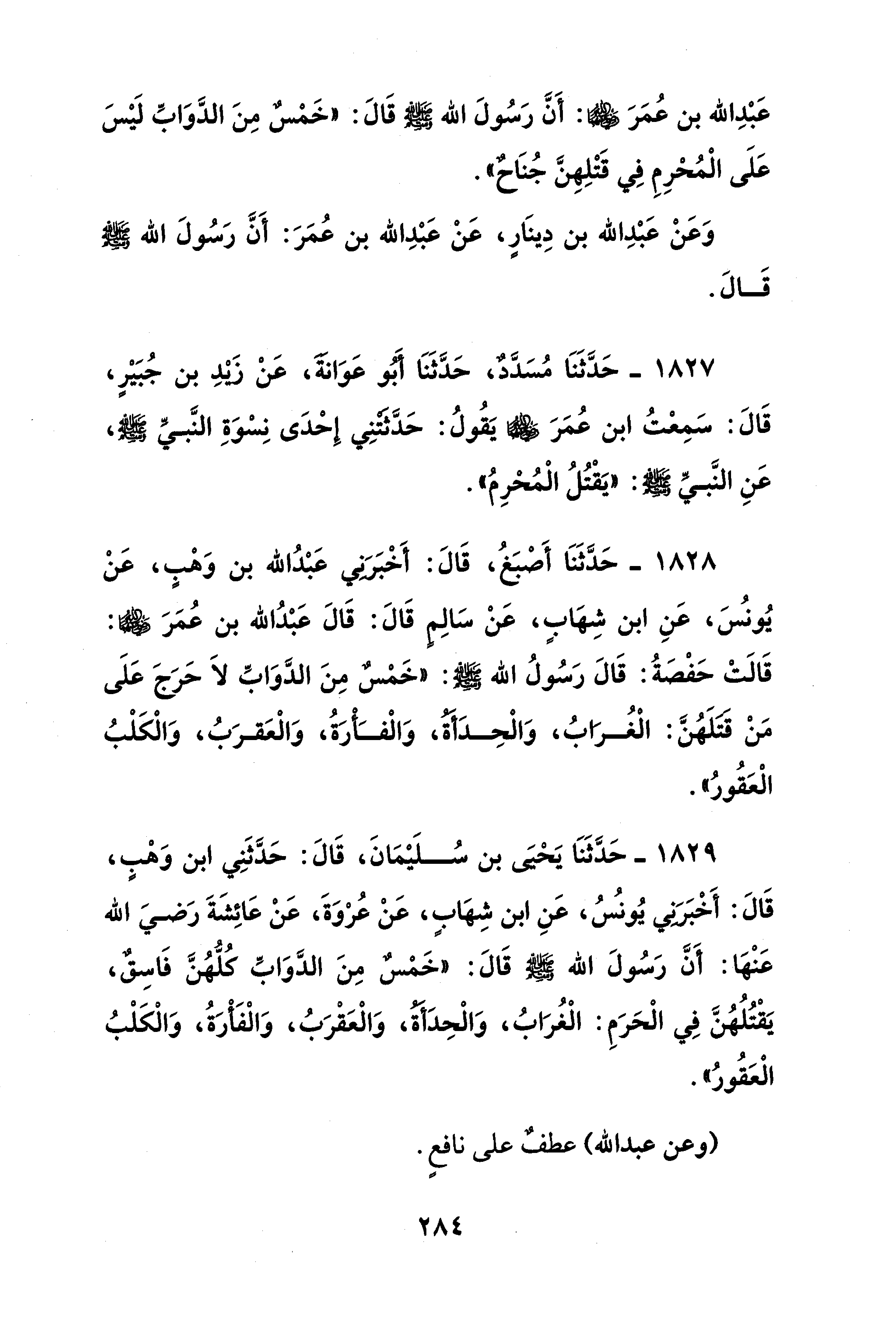 1828 - حَدَّثَنَا أَصبَغُ، قَالَ: أَخْبَرَني عَبْدُ الله بن وَهْبٍ، عَنْ يُونس، عَنِ ابن شِهَاب، عَنْ سَالِمٍ قَالَ: قَالَ عَبْدُ الله بن عُمَرَ - رضي الله عنهما -: قَالَتْ حَفْصَةُ: قَالَ رَسُولُ الله - صلى الله عليه وسلم -: "خَمسٌ مِنَ الدَّوَابِّ لاَ حَرَجَ عَلَى مَنْ قتلَهُنَّ: الْغُرَابُ، وَالْحِدَأة، وَالْفَأرَةُ، وَالْعَقرَبُ، وَالْكَلْبُ الْعَقورُ".