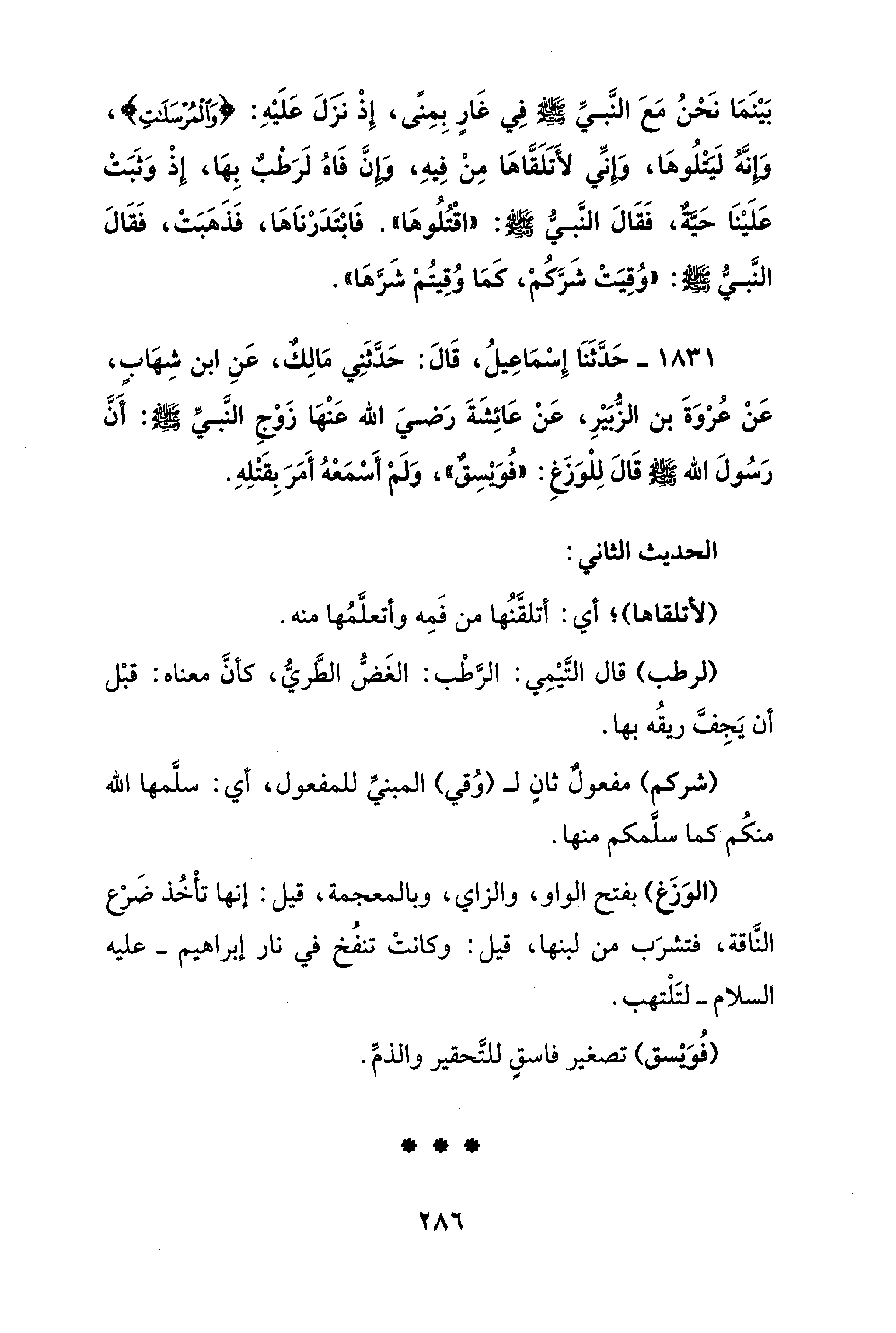 بَيْنَمَا نَحْنُ مَعَ النَّبيِّ - صلى الله عليه وسلم - فِي غَارٍ بِمِنًى، إِذْ نزَلَ عَلَيْهِ: {وَالْمُرْسَلَاتِ}، وَإِنَّهُ لَيتلُوهَا، وَإِنِّي لأَتَلَقَّاهَا مِنْ فِيهِ، وَإِنَّ فَاهُ لَرَطْبٌ بِهَا، إِذْ وَثَبَتْ عَلَيْنَا حَيَّةٌ، فَقَالَ النَّبيُّ - صلى الله عليه وسلم -: "اقْتُلُوهَا". فَابْتَدَرْناَهَا، فَذَهَبَتْ، فَقَالَ النَّبيُّ - صلى الله عليه وسلم -: "وُقِيَتْ شَرَّكُمْ، كَمَا وُقِيتُمْ شَرَّهَا".