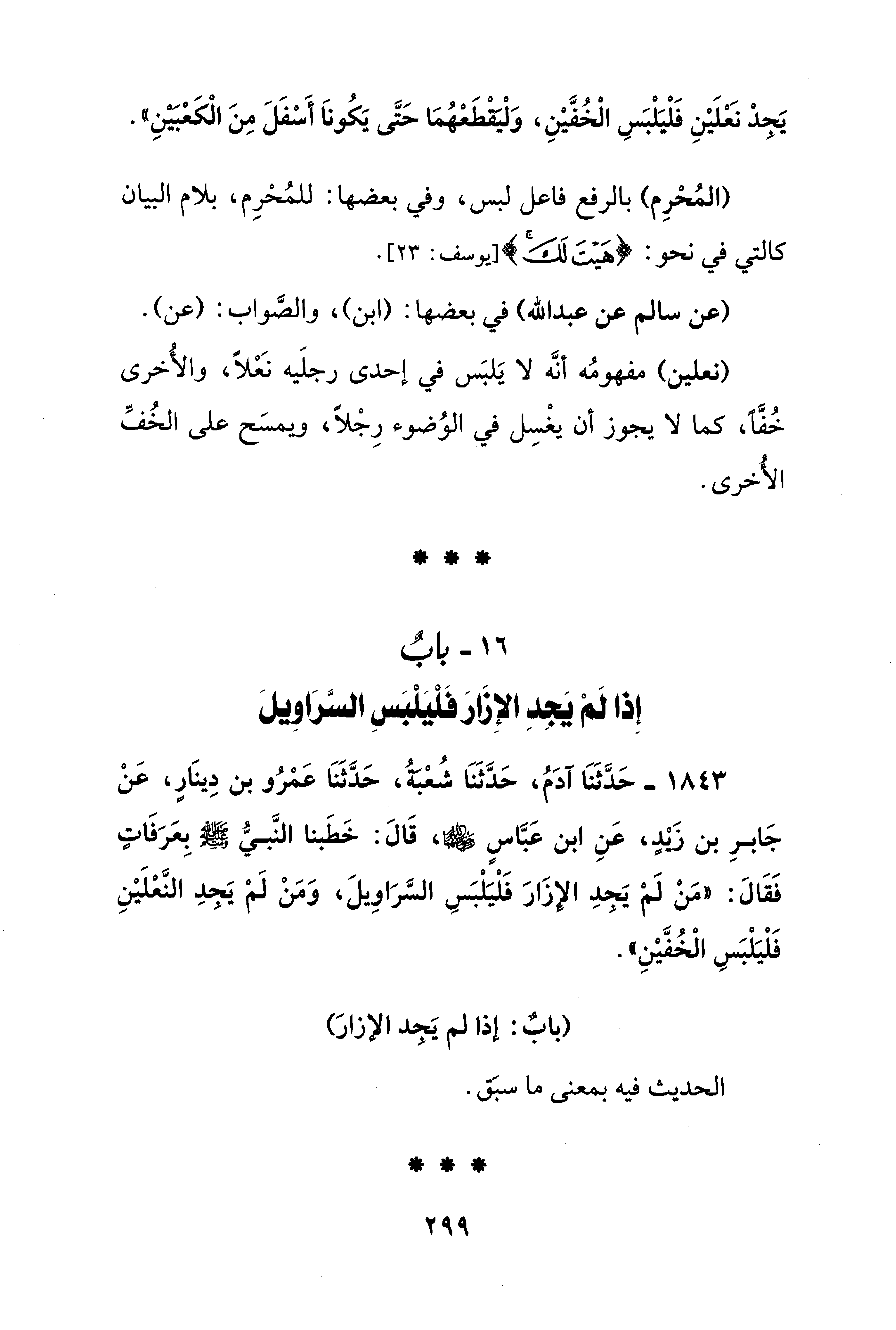 1843 - حَدَّثَنَا آدَمُ، حَدَّثَنَا شُعْبَةُ، حَدَّثَنَا عَمْرُو بن دِينَارٍ، عَنْ جَابرِ بن زَيْدٍ، عَنِ ابن عَبَّاسٍ - رضي الله عنهما -، قَالَ: خَطَبنا النَّبيُّ - صلى الله عليه وسلم - بِعَرَفَاتٍ فَقَالَ: "مَنْ لَمْ يَجدِ الإزَارَ فَلْيَلْبَسِ السَّرَاوِيلَ، وَمَنْ لَمْ يَجدِ النَّعْلَيْنِ فَلْيَلْبَس الْخُفَّيْنِ".