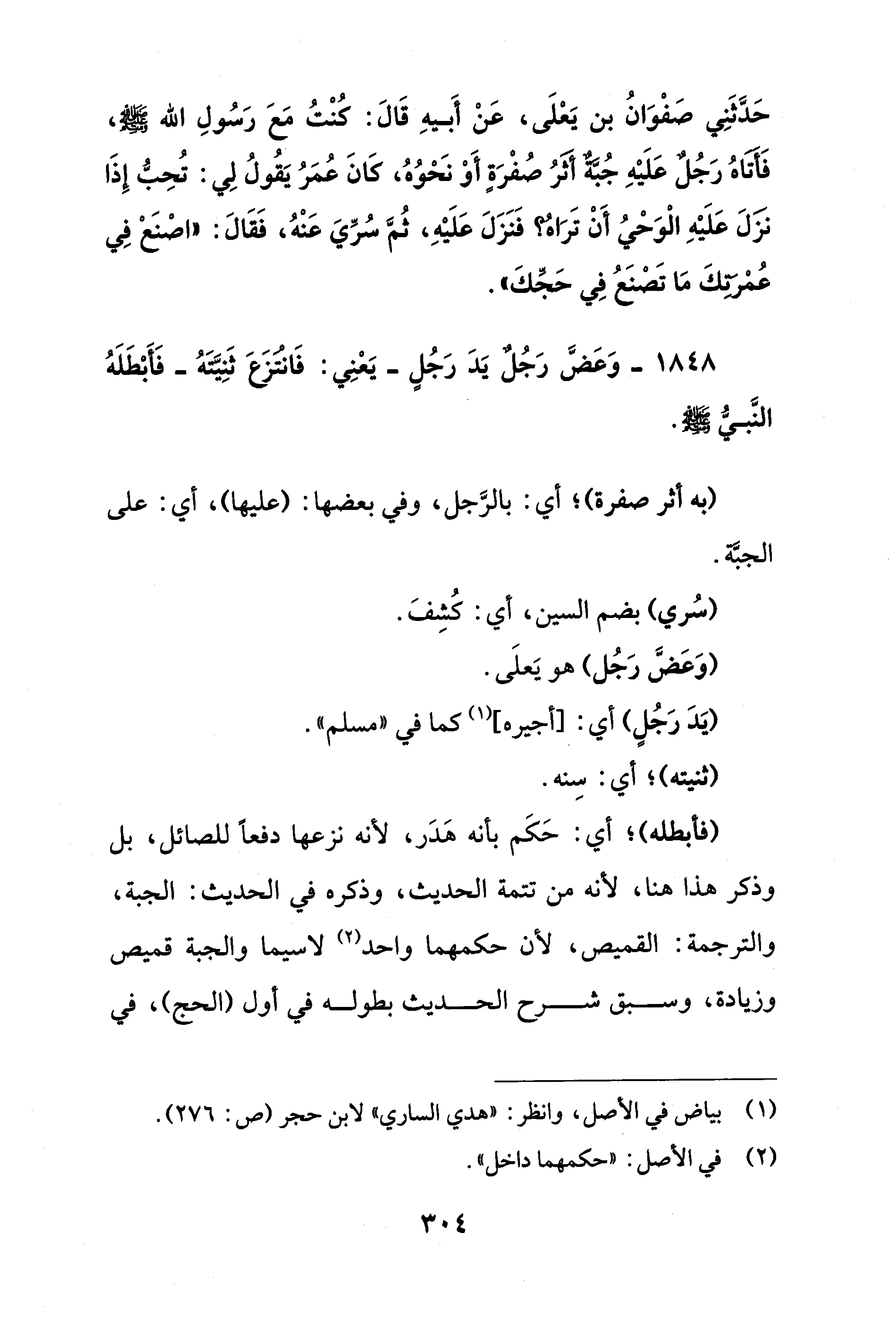 حَدَّثَنِي صَفْوَانُ بن يَعْلَى، عَنْ أَبيهِ قَالَ: كُنْتُ مَعَ رَسُولِ الله - صلى الله عليه وسلم -، فَأَتَاهُ رَجُلٌ عَلَيْهِ جُبَّةٌ أثَرُ صُفْرَةٍ أَوْ نَحْوُهُ، كَانَ عُمَرُ يَقُولُ لِي: تُحِبُّ إِذَا نزَلَ عَلَيْهِ الْوَحْيُ أَنْ تَرَاهُ؟ فَنَزَلَ عَلَيْهِ، ثُمَّ سُرِّيَ عَنْهُ، فَقَالَ: "اصْنَعْ فِي عُمْرتِكَ مَا تَصْنَعُ فِي حَجِّكَ".
