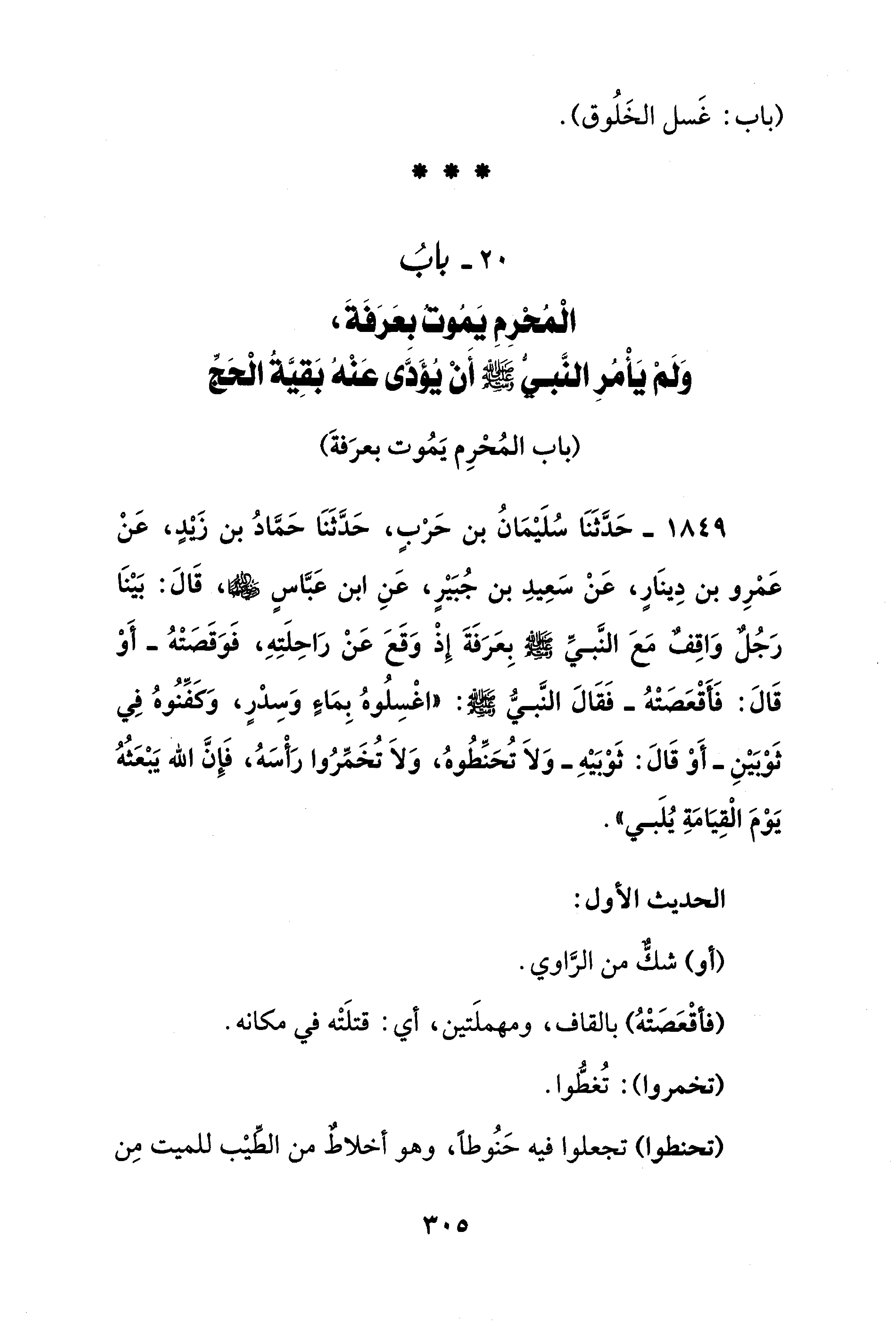 1849 - حَدَّثَنَا سُلَيْمَانُ بن حَرْبٍ، حَدَّثَنَا حَمَّادُ بن زيدٍ، عَنْ عَمْرِو بن دِينَارٍ، عَنْ سَعِيدِ بن جُبَيْرٍ، عَنِ ابن عَبَّاسٍ - رضي الله عنهما -، قَالَ: بَيْنَا رَجُلٌ وَاقِفٌ مَعَ النَّبيِّ - صلى الله عليه وسلم - بِعَرَفَةَ إِذْ وَقَعَ عَنْ رَاحِلَتِهِ، فَوَقَصَتْهُ -أَوْ قَالَ: فَأَقْعَصَتْهُ- فَقَالَ النَّبيُّ - صلى الله عليه وسلم -: "اغْسِلُوهُ بِمَاءٍ وَسِدْرٍ، وَكفِّنُوهُ فِي ثَوْبَيْنِ -أَوْ قَالَ: ثَوْبَيْهِ- وَلاَ تُحَنِّطُوهُ، وَلاَ تُخَمِّرُوا رَأْسَهُ، فَإِنَّ الله يَبْعَثُهُ يَوْمَ الْقِيَامَةِ يُلَبي".
