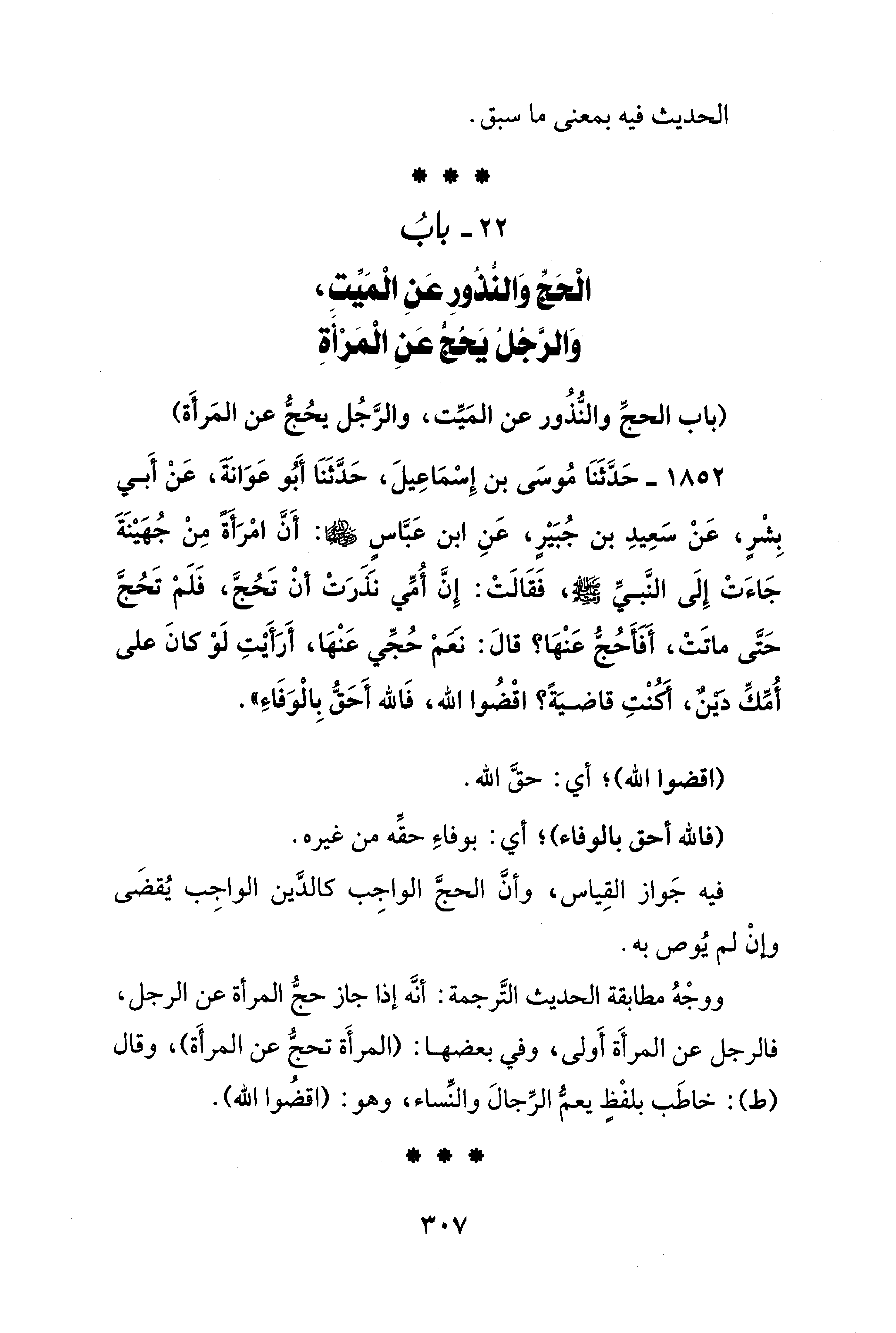 1852 - حَدَّثَنَا مُوسَى بن إِسْمَاعِيلَ، حَدَّثَنَا أَبُو عَوَانَةَ، عَنْ أَبي بِشْرٍ، عَنْ سَعِيدِ بن جُبَيْرٍ، عَنِ ابن عَبَّاسٍ - رضي الله عنهما -: أَنَّ امْرَأَةً مِنْ جُهَيْنَةَ جَاءَتْ إِلَى النَّبيِّ - صلى الله عليه وسلم -، فَقَالَتْ: إِنَّ أُمِّي نَذَرَتْ أنْ تَحُجَّ، فَلَمْ تَحُجَّ حَتَّى ماتَتْ، أفأَحُجُّ عَنْهَا؟ قالَ: نَعَمْ حُجِّي عَنْهَا، أَرَأَيْتِ لَوْ كانَ على أُمّكِّ دَيْنٌ، أكُنْتِ قاضيَةً؟ اقْضُوا الله، فَالله أَحَقُّ بِالْوَفَاءِ".