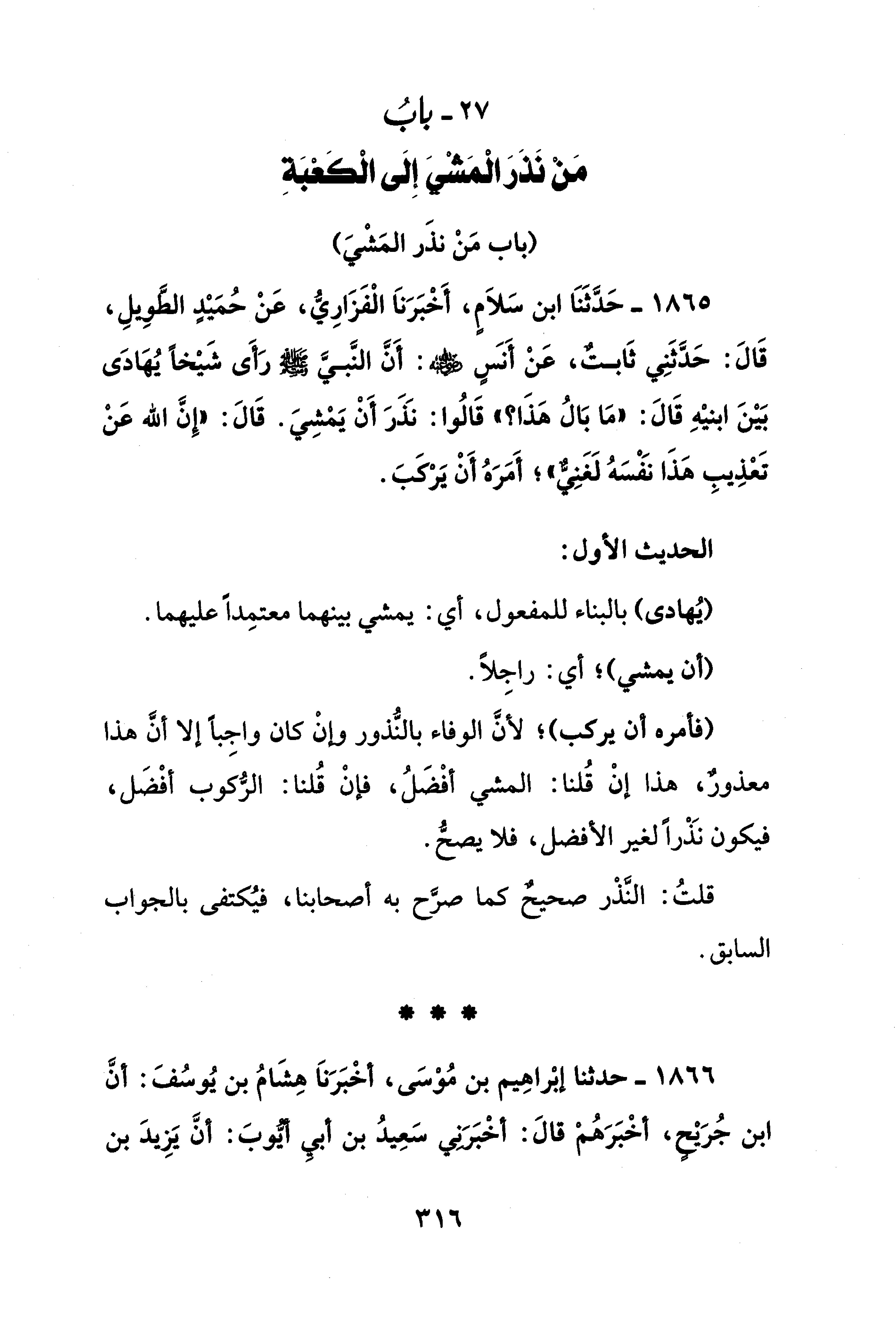 1865 - حَدَّثَنَا ابن سَلاَمٍ، أَخْبَرَناَ الْفَزَارِيُّ، عَنْ حُمَيْدٍ الطَّوِيلِ، قَالَ: حَدَّثَنِي ثَابتٌ، عَنْ أَنسٍ - رضي الله عنه -: أَنَّ النَّبيَّ - صلى الله عليه وسلم - رَأَى شَيخًا يُهَادَى بَيْنَ ابنيْهِ قَالَ: "مَا بَالُ هَذَا؟ " قَالُوا: نَذَرَ أَنْ يَمْشِيَ. قَالَ: "إِنَّ الله عَنْ تَعْذِيبِ هَذَا نَفْسَهُ لَغَنِيٌّ"؛ أَمَرَهُ أَنْ يَرْكَبَ.