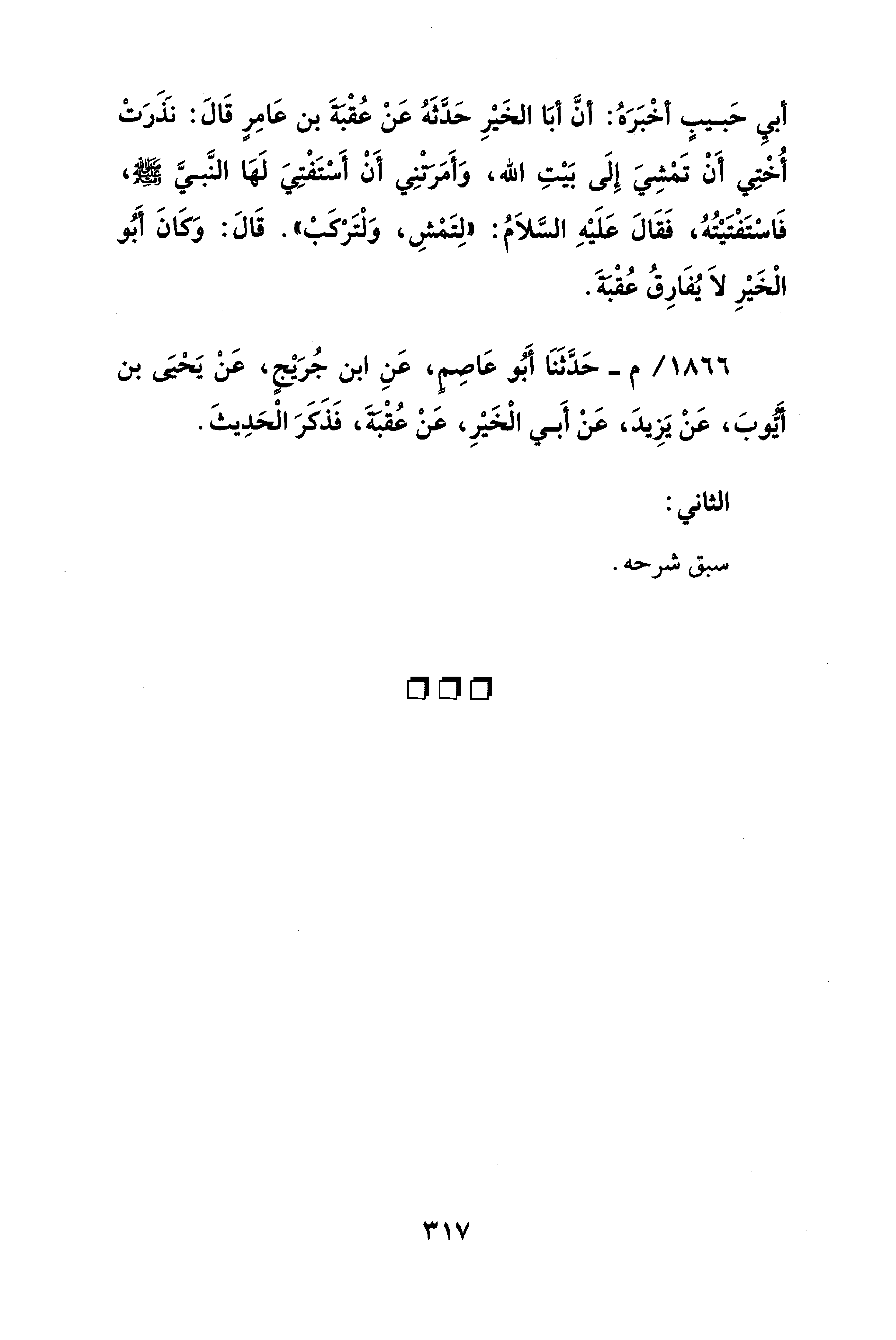 أبيِ حَبيبٍ أخْبَرَهُ: أنَّ أبَا الخَيْرِ حَدَّثَهُ عَنْ عُقْبَةَ بن عَامِرٍ قَالَ: نَذَرَتْ أُخْتِي أَنْ تَمْشِي إِلَى بَيْتِ الله، وَأَمَرتْنِي أَنْ أَسْتَفْتِيَ لَهَا النَّبيَّ - صلى الله عليه وسلم -، فَاسْتَفْتَيْتُهُ، فَقَالَ عَلَيْهِ السَّلاَمُ: "لِتَمْشِ، وَلْتَرْكَبْ". قَالَ: وَكَانَ أَبُو الْخَيْرِ لاَ يُفَارِقُ عُقْبَةَ.