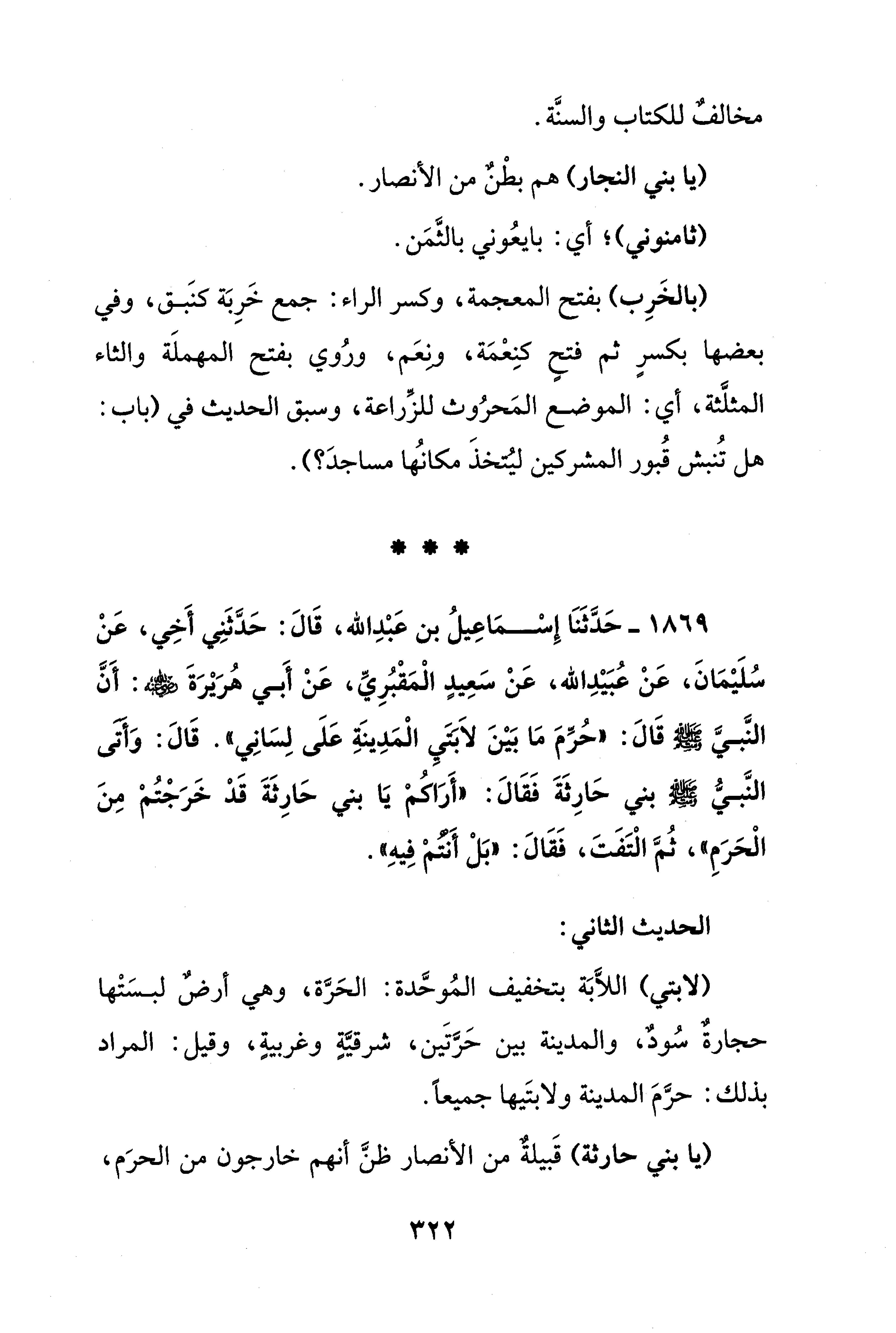 1869 - حَدَّثَنَا إِسْمَاعِيلُ بن عَبْدِ الله، قَالَ: حَدَّثَنِي أَخِي، عَنْ سُلَيْمَانَ، عَنْ عُبَيْدِ الله، عَنْ سَعِيدٍ الْمَقْبُرِيِّ، عَنْ أَبي هُرَيْرَةَ - رضي الله عنه -: أَنَّ النَّبيَّ - صلى الله عليه وسلم - قَالَ: "حُرِّمَ مَا بَيْنَ لابَتَيَ الْمَدِينَةِ عَلَى لِسَانِي". قَالَ: وَأَتَى النَّبيُّ - صلى الله عليه وسلم - بني حَارِثَةَ فَقَالَ: "أَرَاكُمْ يَا بني حَارِثَةَ قَدْ خَرَجْتُمْ مِنَ الْحَرَمِ"، ثُمَّ الْتَفَتَ، فَقَالَ: "بَلْ أَنْتُمْ فِيهِ".
