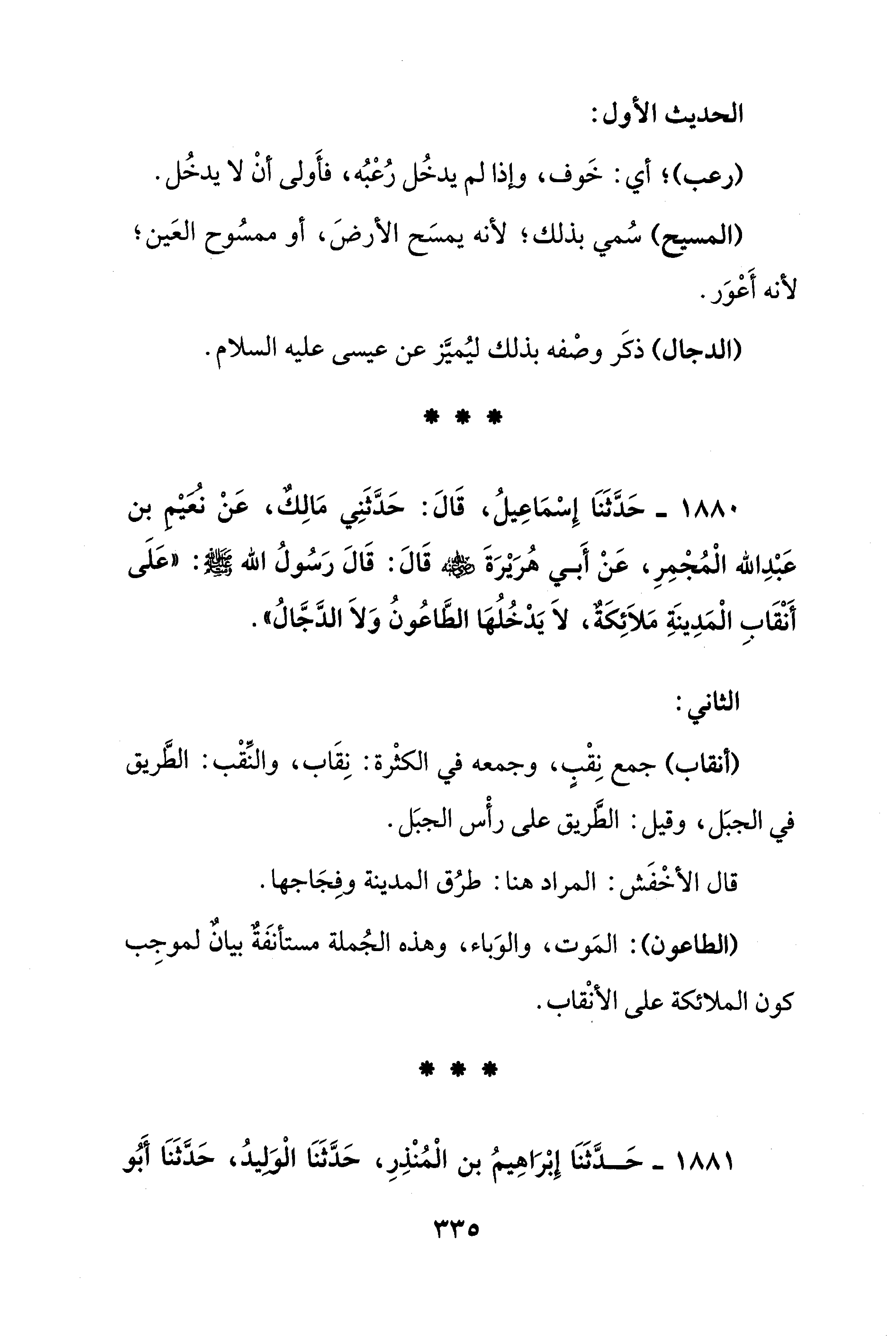 1880 - حَدَّثَنَا إِسْمَاعِيلُ، قَالَ: حَدَّثَنِي مَالِكٌ، عَنْ نُعَيْمِ بن عَبْدِ الله الْمُجْمِرِ، عَنْ أَبي هُرَيْرَةَ - رضي الله عنه - قَالَ: قَالَ رَسُولُ الله - صلى الله عليه وسلم -: "عَلَى أَنْقَابِ الْمَدِينَةِ مَلاَئِكَةٌ، لاَ يَدْخُلُهَا الطَّاعُونُ وَلاَ الدَّجَّالُ".