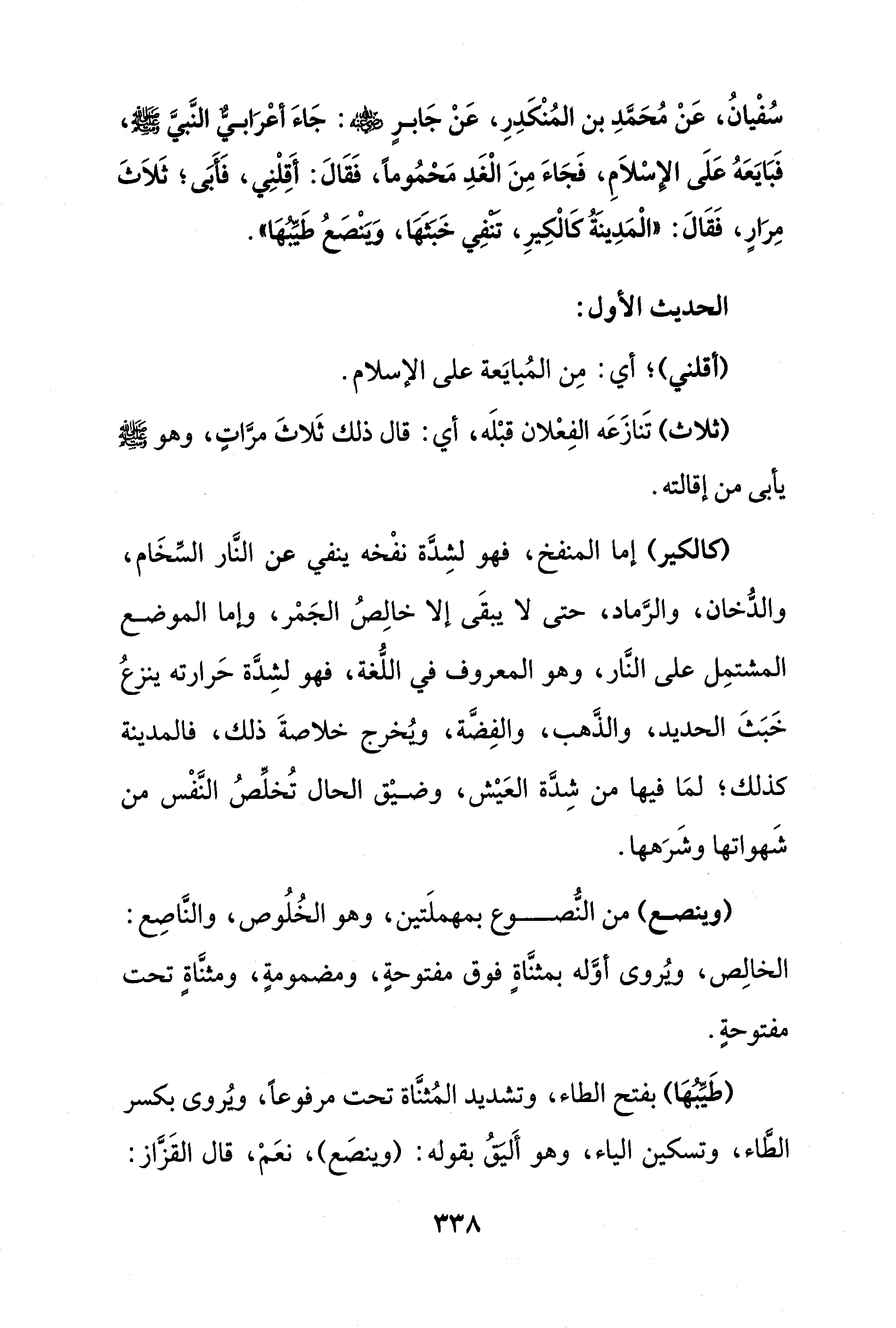 سُفْيانُ، عَنْ مُحَمَّدِ بن المُنْكَدِرِ، عَنْ جَابرٍ - رضي الله عنه -: جَاءَ أعْرَابيٌّ النَّبيَّ - صلى الله عليه وسلم -، فَبَايَعَهُ عَلَى الإسْلاَمِ، فَجَاءَ مِنَ الْغَدِ مَحْمُومًا، فَقَالَ: أَقِلْنِي، فَأَبَى؛ ثَلاَثَ مِرَارٍ، فَقَالَ: "الْمَدِينَةُ كَالْكِيرِ، تَنْفِي خَبَثَهَا، وَيَنْصَعُ طَيِّبُهَا".
