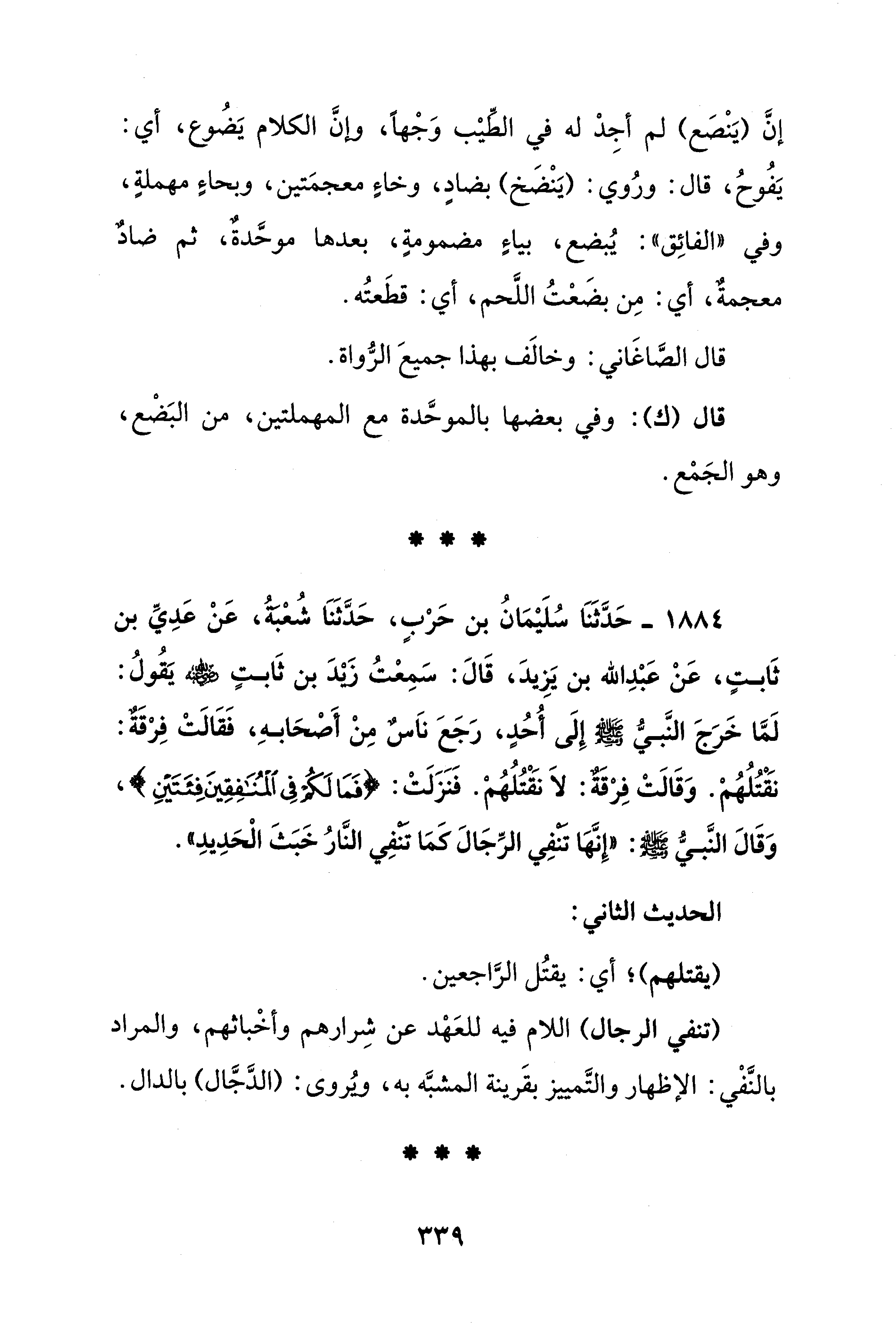 1884 - حَدَّثَنَا سُلَيْمَانُ بن حَرْبٍ، حَدَّثَنَا شُعْبَةُ، عَنْ عَدِيِّ بن ثَابتٍ، عَنْ عَبْدِ الله بن يَزِيدَ، قَالَ: سَمِعْتُ زَيْدَ بن ثَابتٍ - رضي الله عنه - يَقُولُ: لَمَّا خَرَجَ النَّبيُّ - صلى الله عليه وسلم - إِلَى أُحُدٍ، رَجَعَ ناَسٌ مِنْ أَصْحَابهِ، فَقَالَتْ فِرْقَةٌ: نقتُلُهُمْ. وَقَالَتْ فِرْقَةٌ: لاَ نَقتُلُهُمْ. فَنَزَلَتْ: {فَمَا لَكُمْ فِي الْمُنَافِقِينَ فِئَتَيْنِ}، وَقَالَ النَّبيُّ - صلى الله عليه وسلم -: "إِنَّهَا تنفِي الرِّجَالَ كَمَا تَنْفِي النَّارُ خَبَثَ الْحَدِيدِ".