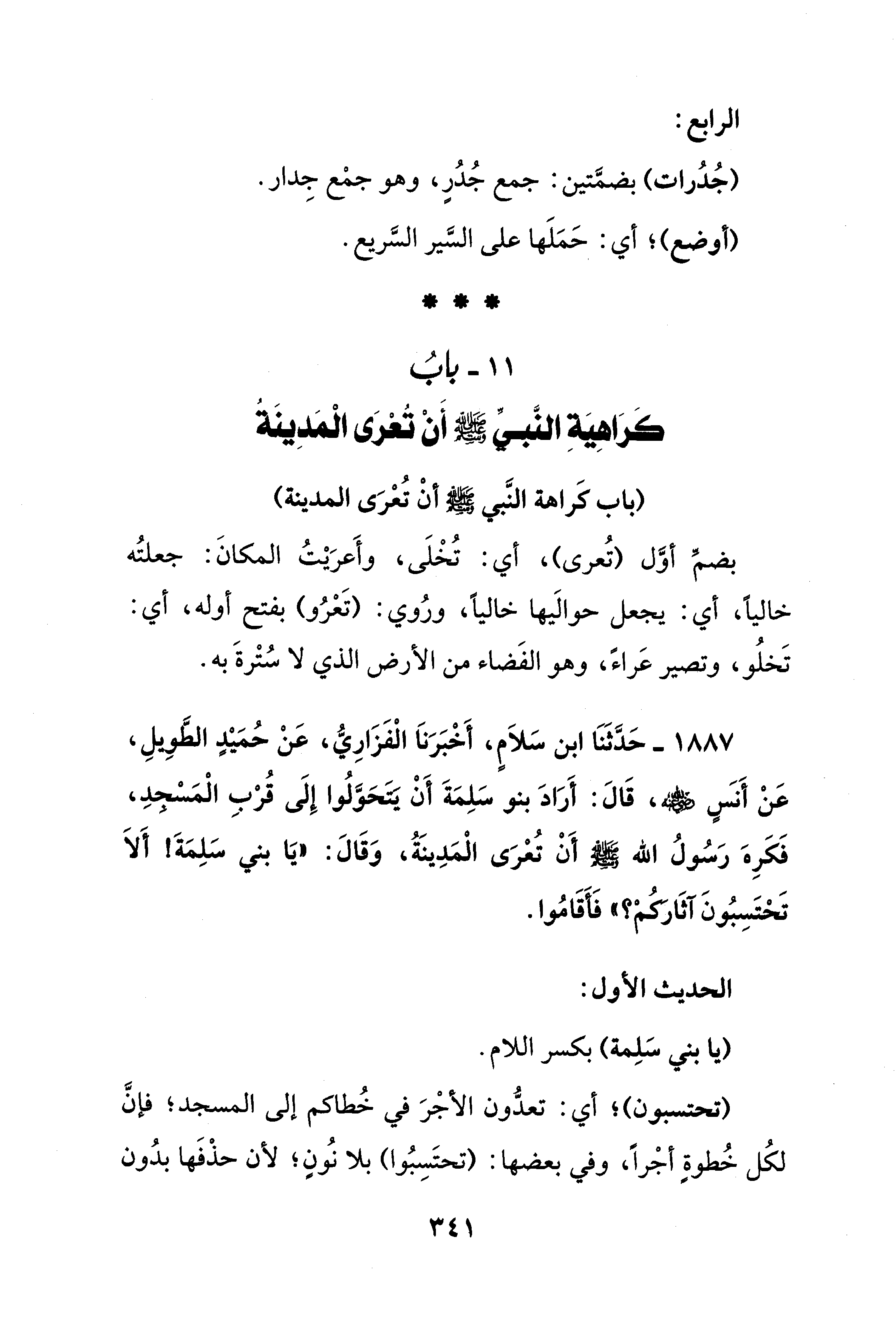 1887 - حَدَّثَنَا ابن سَلاَمٍ، أَخْبَرَنَا الْفَزَارِيُّ، عَنْ حُمَيْدٍ الطَّوِيلِ، عَنْ أَنسٍ - رضي الله عنه -، قَالَ: أَرَادَ بنو سَلِمَةَ أَنْ تتَحَوَّلُوا إِلَى قُرْبِ الْمَسْجدِ، فَكَرِهَ رَسُولُ الله - صلى الله عليه وسلم - أَنْ تُعْرَى الْمَدِينَةُ، وَقَالَ: "يَا بني سَلِمَةَ! أَلاَ تَحْتَسِبُونَ آثَارَكمْ؟ " فَأَقَامُوا.