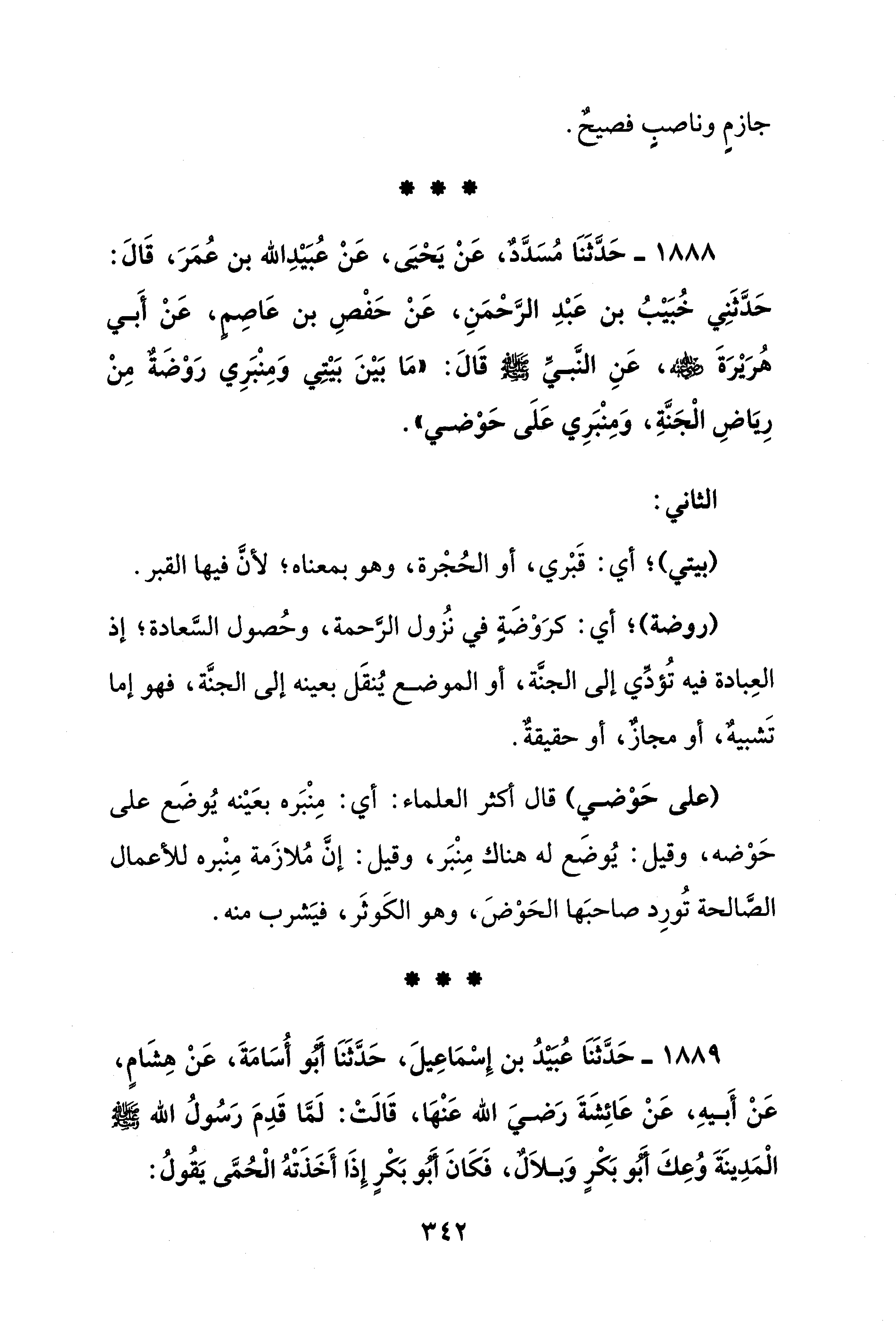 1888 - حَدَّثَنَا مُسَدَّدٌ، عَنْ يَحْيَى، عَنْ عُبَيْدِ الله بن عُمَرَ، قَالَ: حَدَّثَنِي خُبَيْبُ بن عَبْدِ الرَّحْمَنِ، عَنْ حَفْصِ بن عَاصِمٍ، عَنْ أَبي هُرَيْرَةَ - رضي الله عنه -، عَنِ النَّبيِّ - صلى الله عليه وسلم - قَالَ: "مَا بَيْنَ بَيْتِي وَمِنْبَرِي رَوْضَةٌ مِنْ رِيَاضِ الْجَنَّةِ، وَمِنْبَرِي عَلَى حَوْضي".
