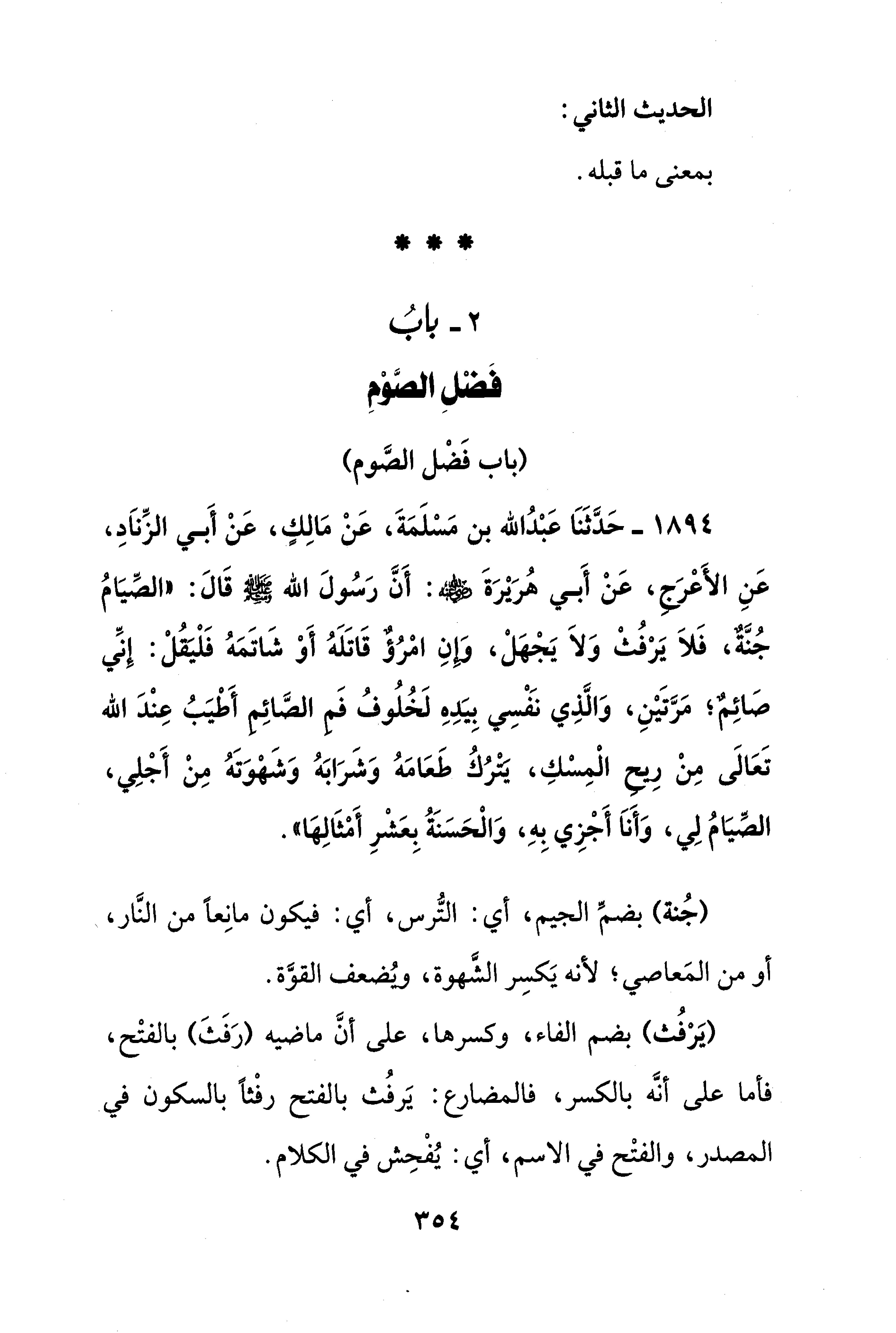1894 - حَدَّثَنَا عَبْدُ الله بن مَسْلَمَةَ، عَنْ مَالِكٍ، عَنْ أَبي الزِّناَدِ، عَنِ الأَعْرَج، عَنْ أَبي هُرَيْرَةَ - رضي الله عنه -: أَنَّ رَسُولَ الله - صلى الله عليه وسلم - قَالَ: "الصِّيَامُ جُنَّةٌ، فَلاَ يَرْفُثْ وَلاَ يَجْهَلْ، وَإِنِ امْرُؤٌ قَاتَلَهُ أَوْ شَاتَمَهُ فَلْيَقُلْ: إِنِّي صَائِمٌ؛ مَرَّتَيْنِ، وَالَّذِي نَفْسِي بِيَدِهِ لَخُلُوفُ فَمِ الصَّائِمِ أَطْيَبُ عِنْدَ الله تَعَالَى مِنْ رِيح الْمِسْكِ، يَتْرُكُ طَعَامَهُ وَشَرَابَهُ وَشَهْوَتَهُ مِنْ أَجْلِي، الصِّيَامُ لِي، وَأَناَ أَجْزِي بِهِ، وَالْحَسَنَةُ بِعَشْرِ أَمْثَالِهَا".