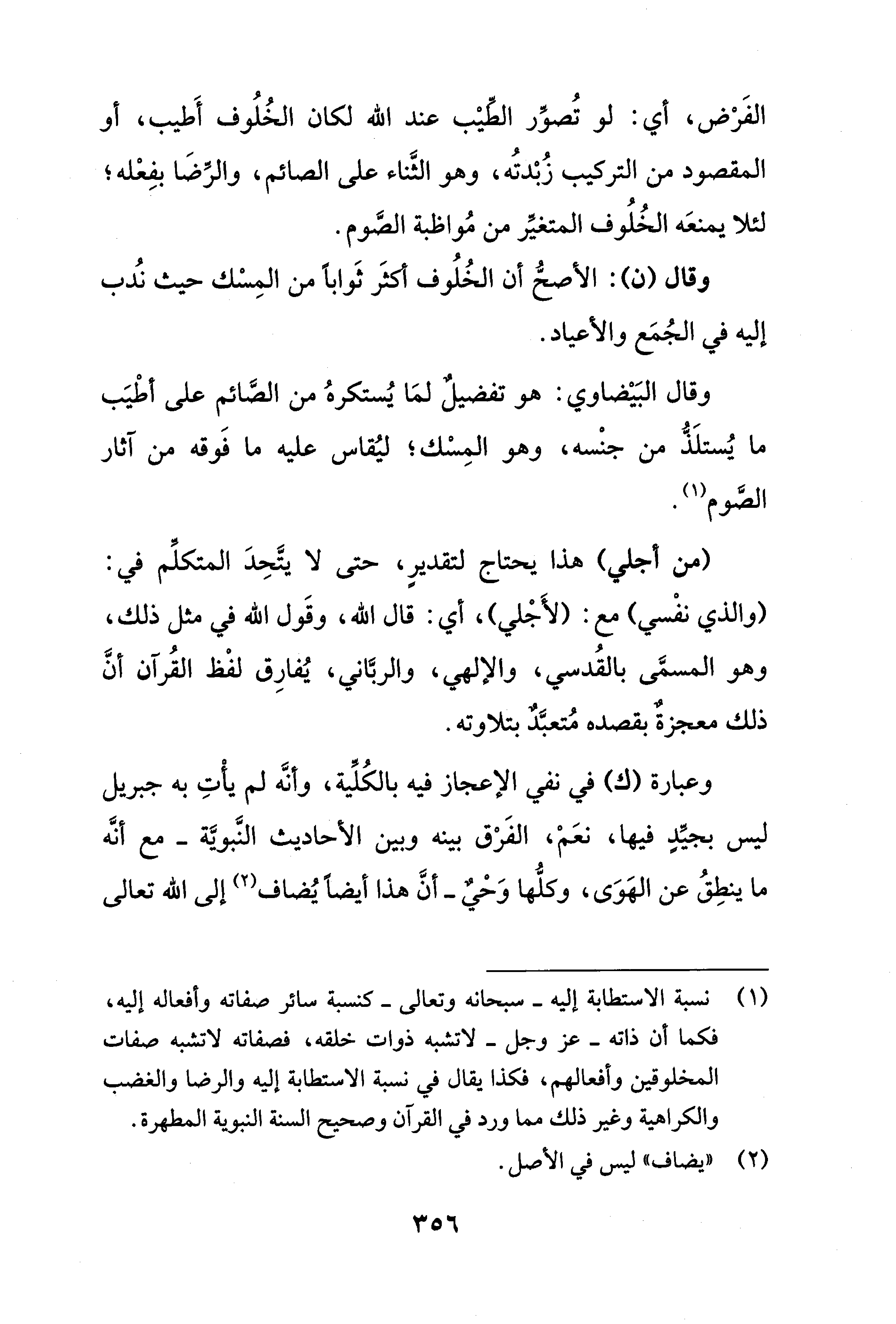 وقال البَيْضاوي: هو تفضيلٌ لمَا يُستكرهُ من الصَّائم على أطْيَب ما يُستلَذُّ من جنْسه، وهو المِسْك؛ ليُقاس عليه ما فَوقه من آثار الصَّوم (¬1).