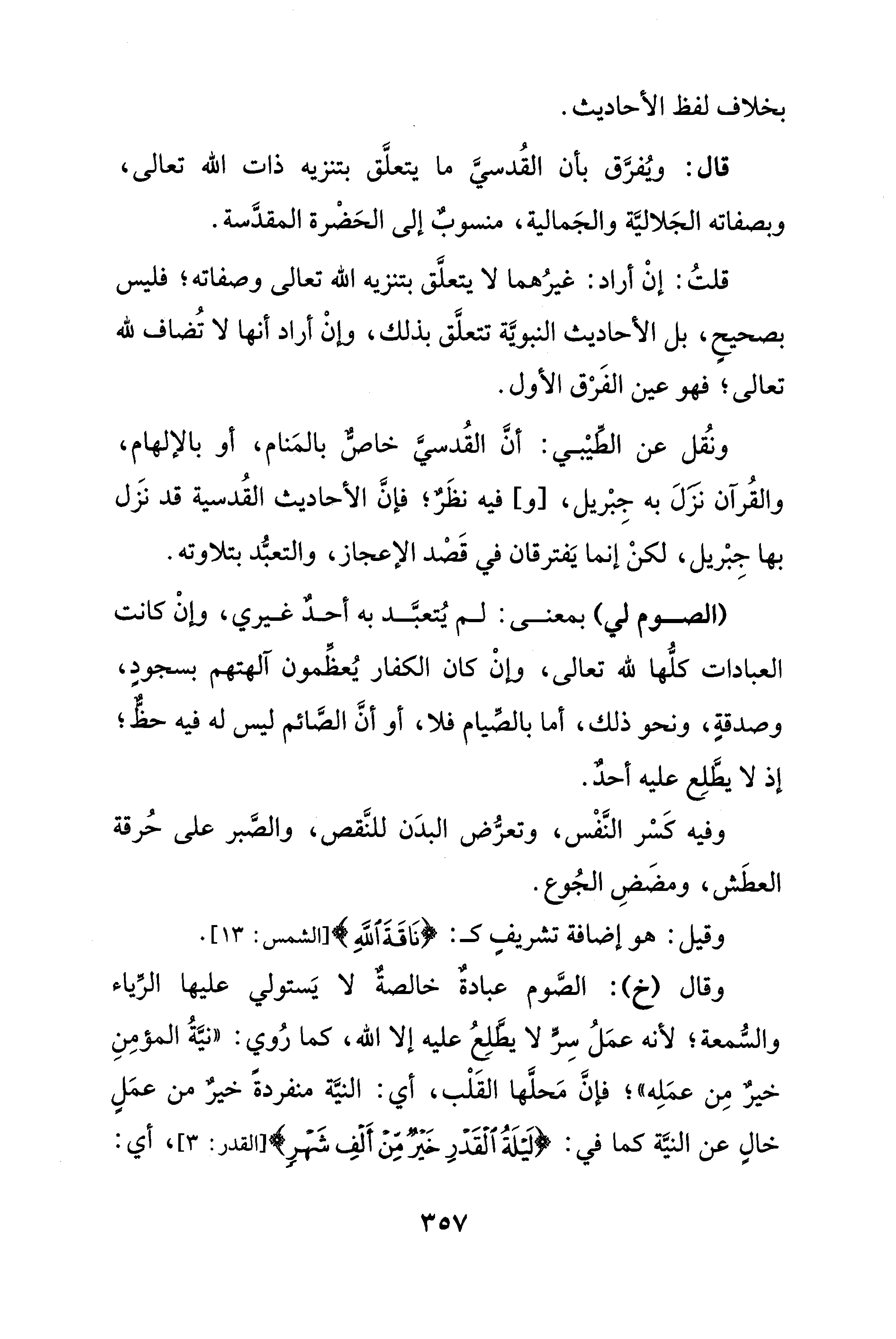 ونُقل عن الطِّيْبي: أنَّ القُدسيَّ خاصٌّ بالمَنام، أو بالإلهام، والقُرآن نزَلَ به جِبْريل، [و] فيه نظَرٌ؛ فإنَّ الأحاديث القُدسية قد نَزل بها جِبْريل، لكنْ إنما يَفترقان في قَصْد الإعجاز، والتعبُّد بتلاوته.