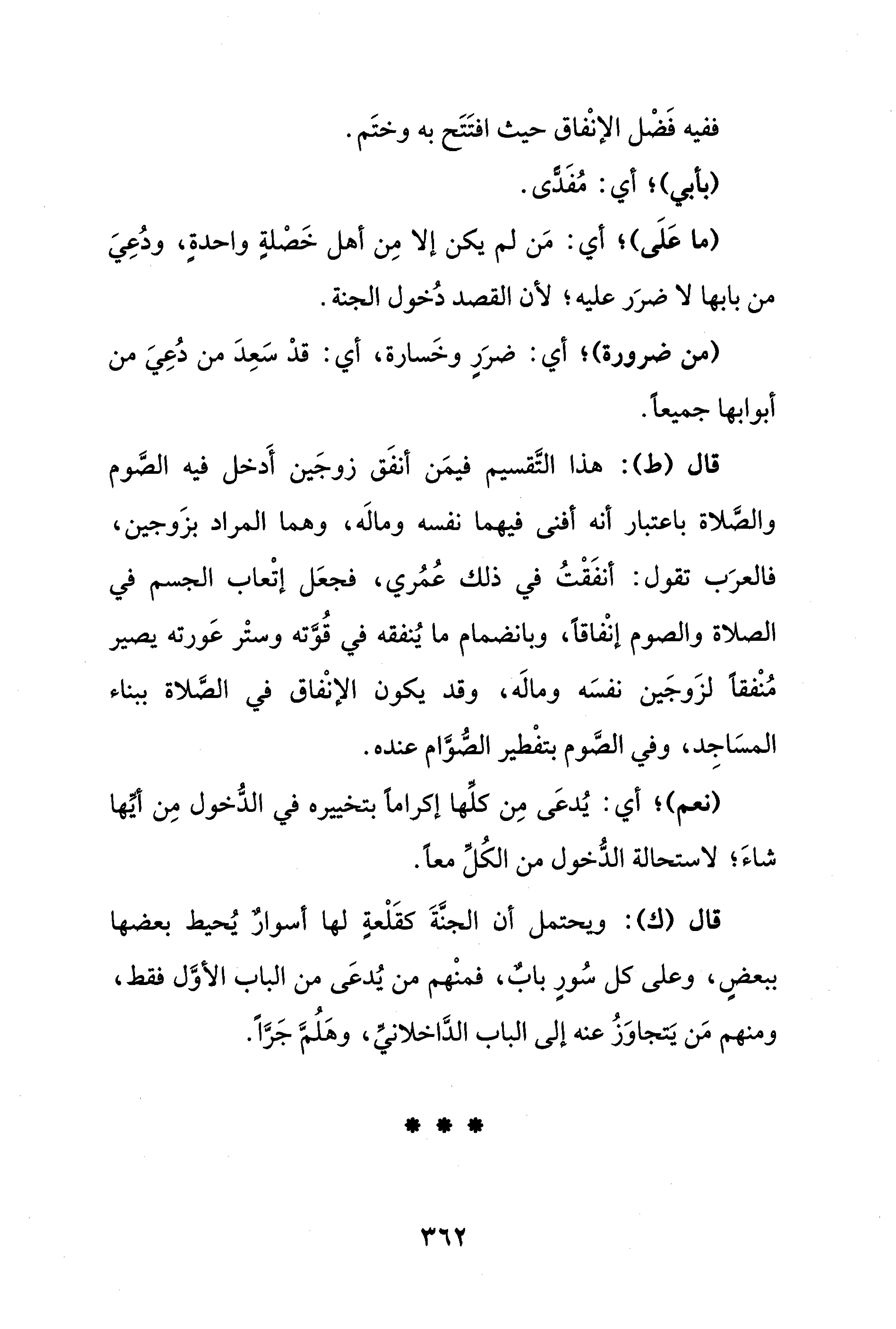 قال (ط): هذا التَّقسيم فيمَن أنفَق زوجَين أَدخل فيه الصَّوم والصَّلاة باعتبار أنه أفنى فيهما نفسه ومالَه، وهما المراد بزَوجين، فالعرَب تقول: أنفَقْتُ في ذلك عُمُري، فجعَل إتْعاب الجسم في الصلاة والصوم إنْفاقًا، وبانضمام ما يُنفقه في قُوَّته وستْر عَورته يصير مُنْفقًا لزَوجَين نفسَه ومالَه، وقد يكون الإنْفاق في الصَّلاة ببناء المسَاجِد، وفي الصَّوم بتفْطير الصُّوَّام عنده.
