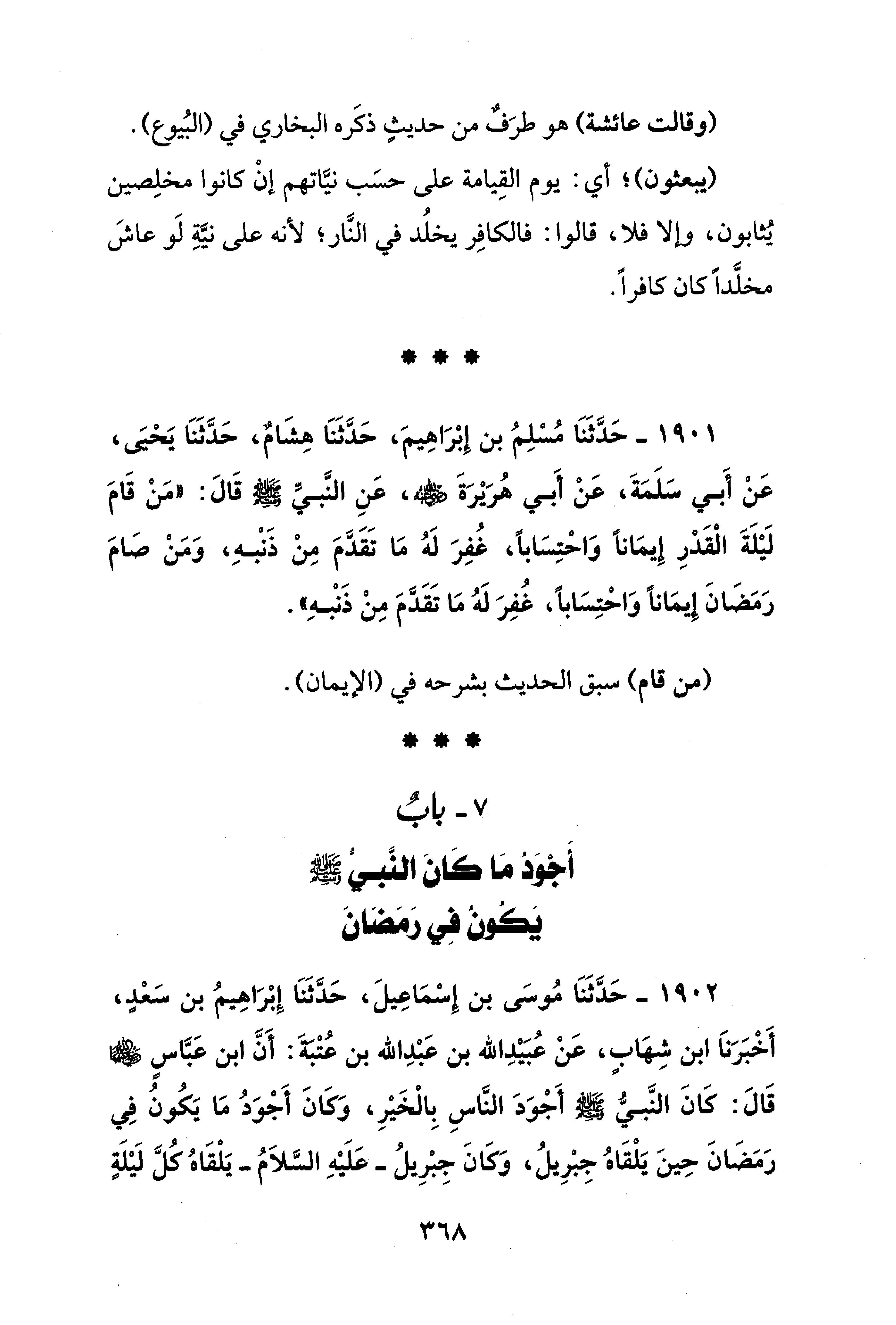 1902 - حَدَّثَنَا مُوسَى بن إِسْمَاعِيلَ، حَدَّثنَا إِبْرَاهِيمُ بن سَعْدٍ، أَخْبَرَناَ ابن شِهَابٍ، عَنْ عُبَيْدِ الله بن عَبْدِ الله بن عُتْبَةَ: أَنَّ ابن عَبَّاسٍ - رضي الله عنهما - قَالَ: كَانَ النَّبيُّ - صلى الله عليه وسلم - أَجْوَدَ النَّاسِ بِالْخَيْرِ، وَكَانَ أَجْوَدُ مَا يَكُونُ فِي رَمَضَانَ حِينَ يَلْقَاهُ جِبْرِيلُ، وَكَانَ جِبْرِيلُ - عَلَيْهِ السَّلاَمُ - يَلْقَاهُ كُلَّ لَيْلَةٍ