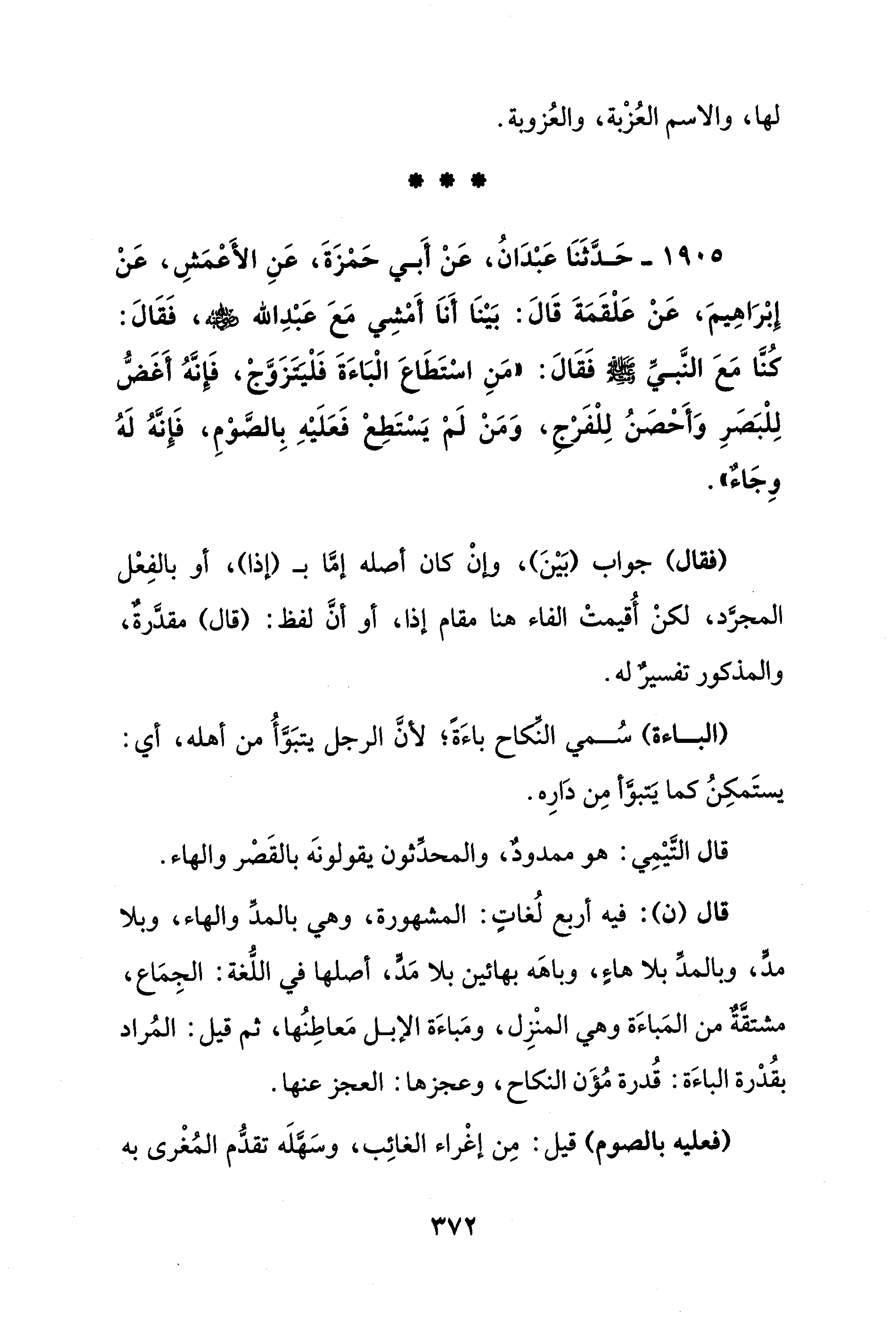 1905 - حَدَّثَنَا عَبْدَانُ، عَنْ أَبي حَمْزَةَ، عَنِ الأَعْمَشِ، عَنْ إِبْرَاهِيمَ، عَنْ عَلْقَمَةَ قَالَ: بَيْنَا أَناَ أَمْشِي مَعَ عَبْدِ الله - رضي الله عنه -، فَقَالَ: كُنَّا مَعَ النَّبيِّ - صلى الله عليه وسلم - فَقَالَ: "مَنِ اسْتَطَاعَ الْبَاءَةَ فَلْيَتَزَوَّجْ، فَإنَّهُ أَغَضُّ لِلْبَصَرِ وَأَحْصَنُ لِلْفَرْج، وَمَنْ لَمْ يَسْتَطِعْ فَعَلَيْهِ بِالصَّوْمِ، فَإنَّهُ لَهُ وِجَاءٌ".