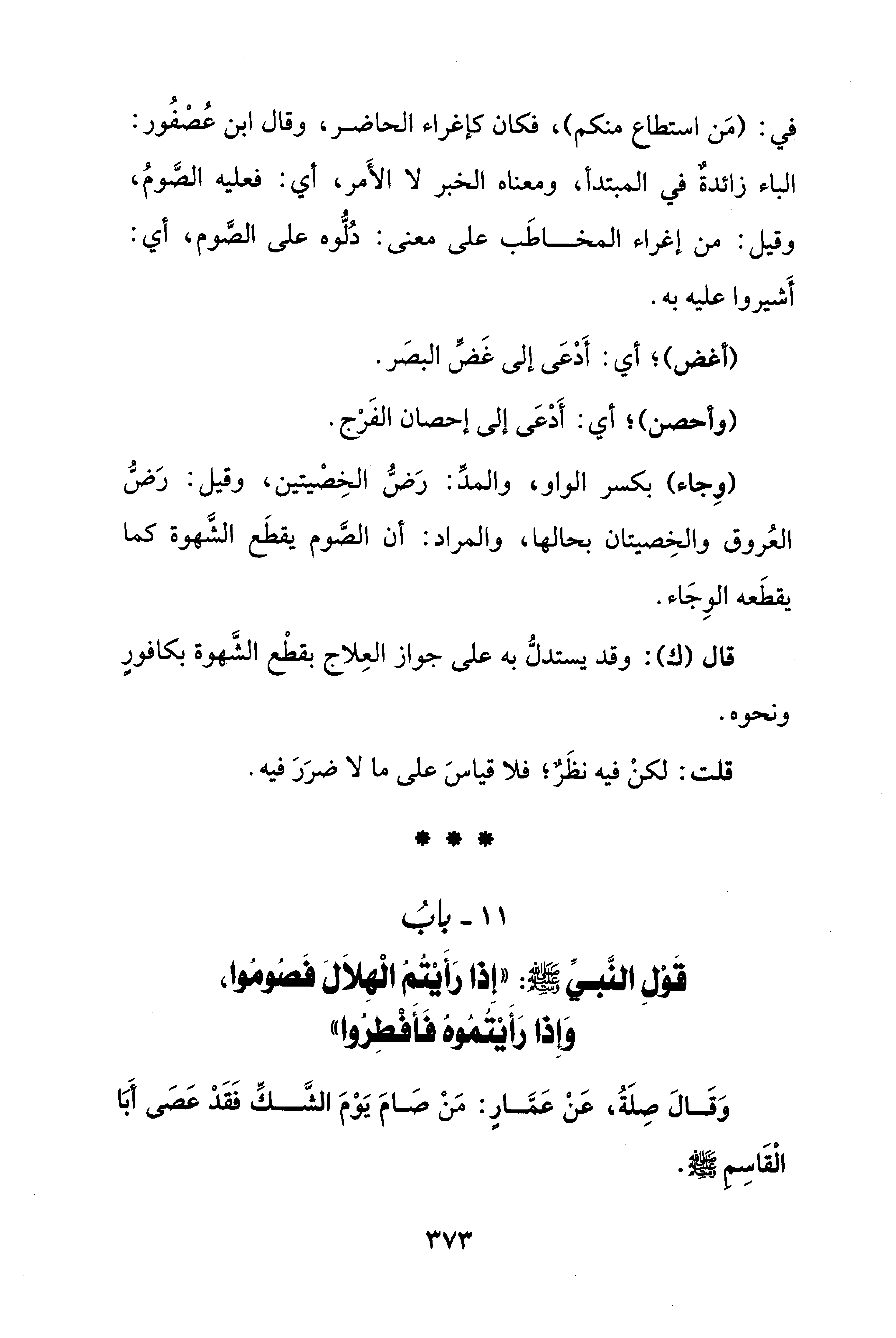 11 - بابُ قَوْلِ النَّبيِّ - صلى الله عليه وسلم -: "إِذا رَأَيْتُمُ الْهِلاَلَ فَصُومُوا، وَإِذا رَأَيْتُمُوهُ فَأَفْطِرُوا"