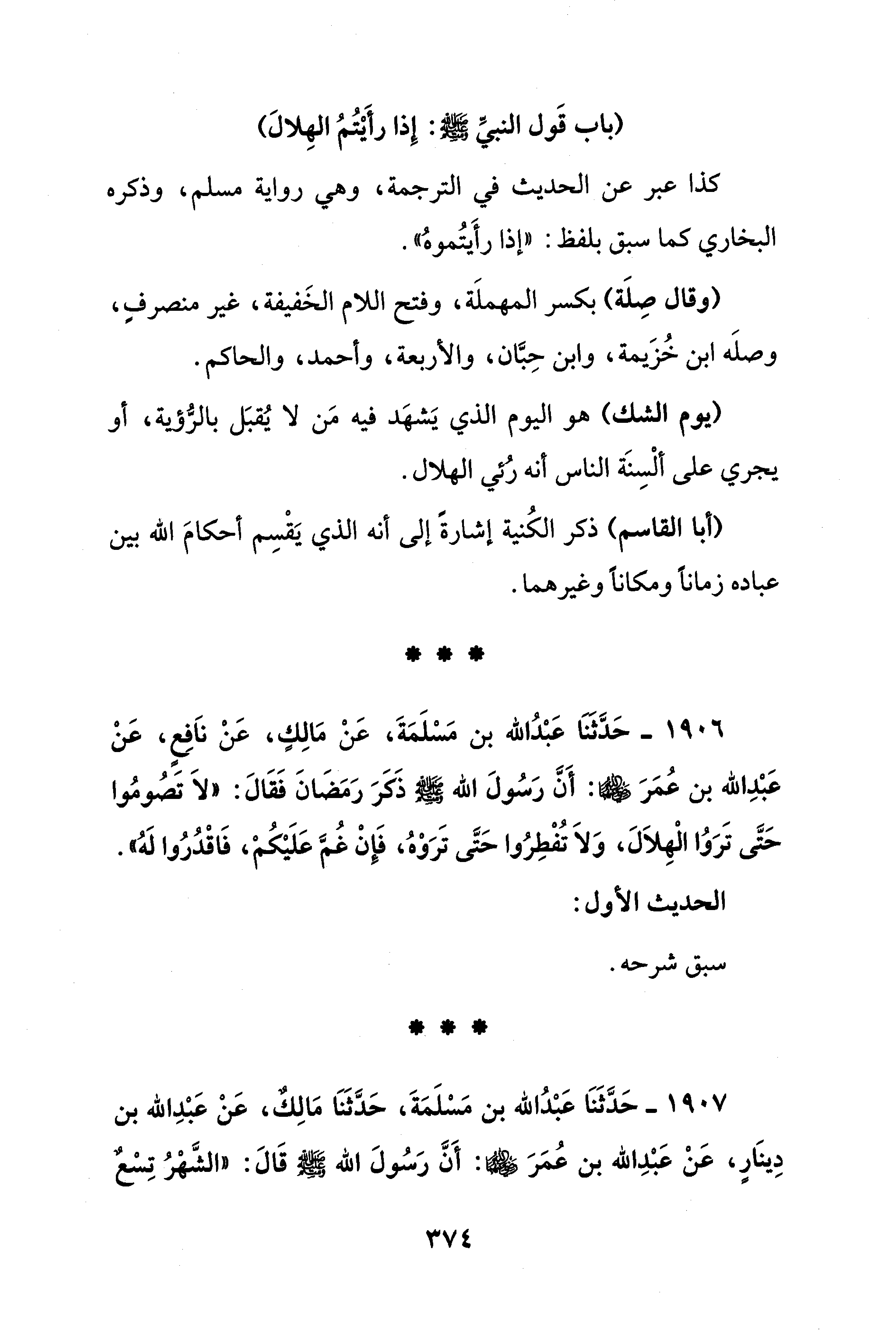 1906 - حَدَّثَنَا عَبْدُ الله بن مَسْلَمَةَ، عَنْ مَالِكٍ، عَنْ ناَفِعٍ، عَنْ عَبْدِ الله بن عُمَرَ - رضي الله عنهما -: أَنَّ رَسُولَ الله - صلى الله عليه وسلم - ذَكَرَ رَمَضَانَ فَقَالَ: "لاَ تَصُومُوا حَتَّى تَرَوُا الْهِلاَلَ، وَلاَ تُفْطِرُوا حَتَّى تَرَوْهُ، فَإِنْ غُمَّ عَلَيْكُمْ، فَاقْدُرُوا لَهُ".