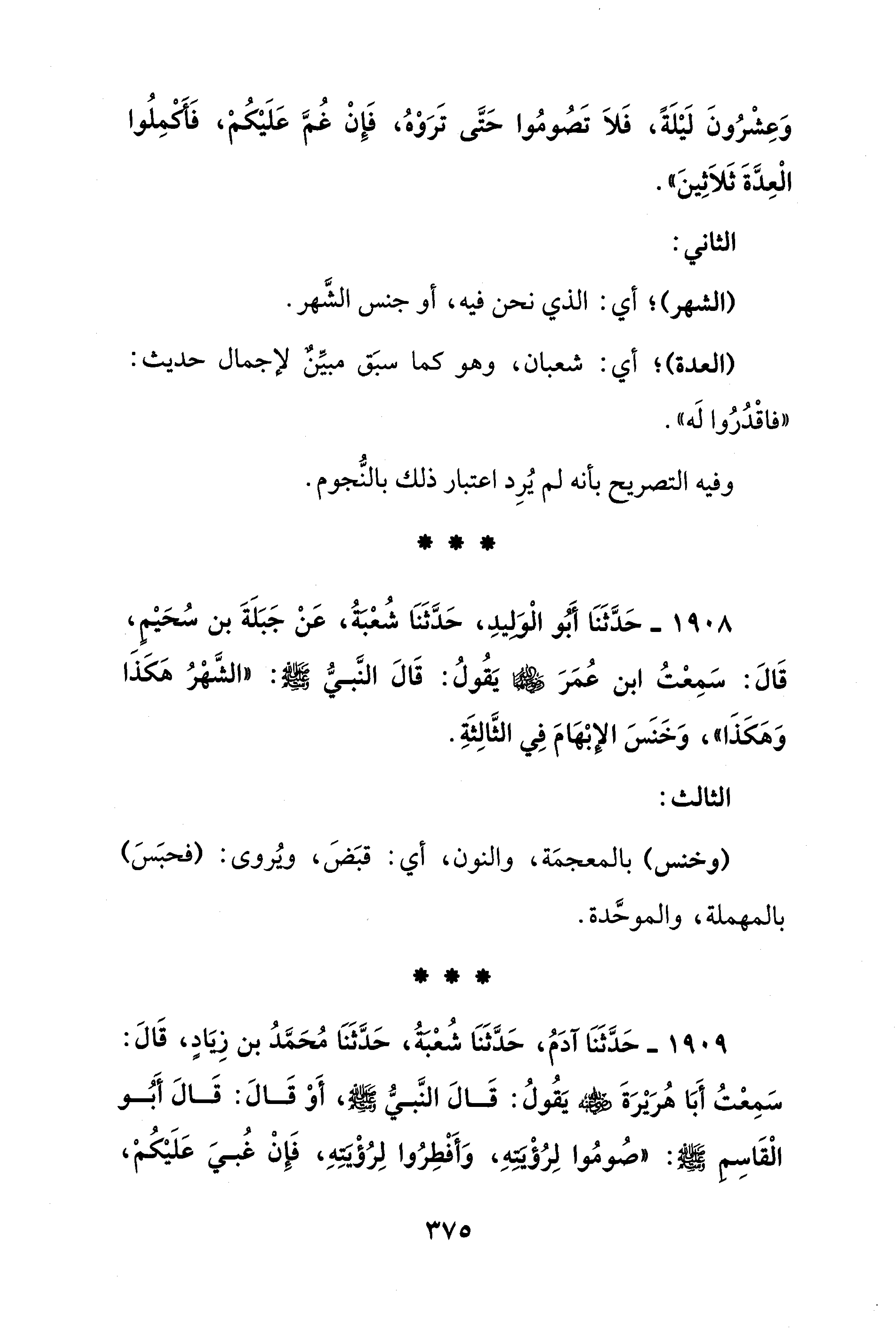 1908 - حَدَّثَنَا أَبُو الْوَليدِ، حَدَّثَنَا شُعْبَةُ، عَنْ جَبَلَةَ بن سُحَيْمٍ، قَالَ: سَمِعْتُ ابن عُمَرَ - رضي الله عنهما - يَقُولُ: قَالَ النَّبيُّ - صلى الله عليه وسلم -: "الشَّهْرُ هَكَذَا وَهَكَذَا"، وَخَنَسَ الإبْهَامَ فِي الثَّالِثَةِ.
