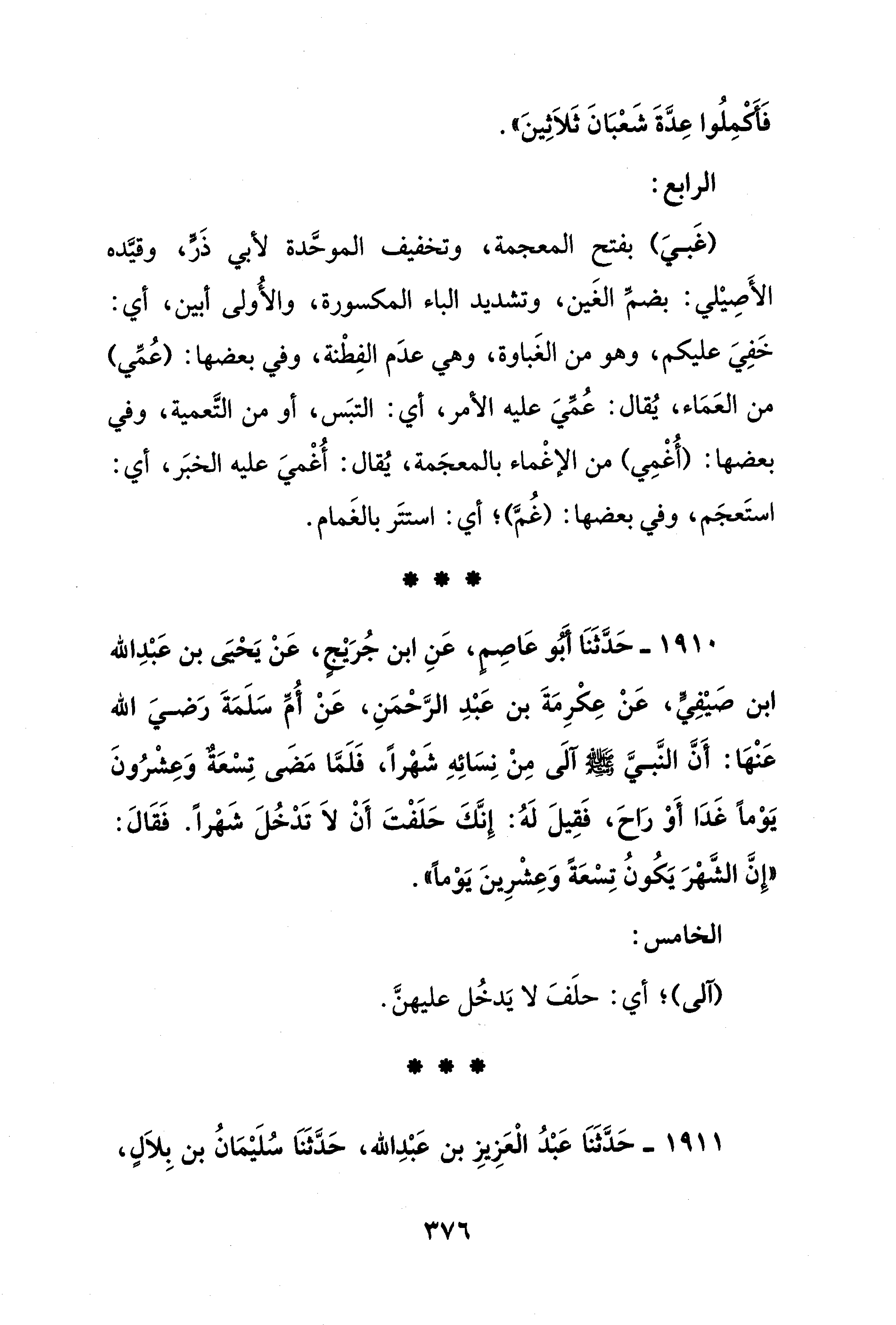 1910 - حَدَّثَنَا أَبُو عَاصِمٍ، عَنِ ابن جُرَيْجٍ، عَنْ يَحْيَى بن عَبْدِ الله ابن صَيْفِيٍّ، عَنْ عِكْرِمَةَ بن عَبْدِ الرَّحْمَنِ، عَنْ أُمِّ سَلَمَةَ رَضيَ الله عَنْهَا: أَنَّ النَّبيَّ - صلى الله عليه وسلم - آلَى مِنْ نِسَائِهِ شَهْرًا، فَلَمَّا مَضَى تِسْعَةٌ وَعِشْرُونَ يَوْمًا غَدَا أَوْ رَاحَ، فَقِيلَ لَهُ: إِنَّكَ حَلَفْتَ أَنْ لاَ تَدْخُلَ شَهْرًا. فَقَالَ: "إِنَّ الشَّهْرَ يَكُونُ تِسْعَةً وَعِشْرِينَ يَوْمًا".