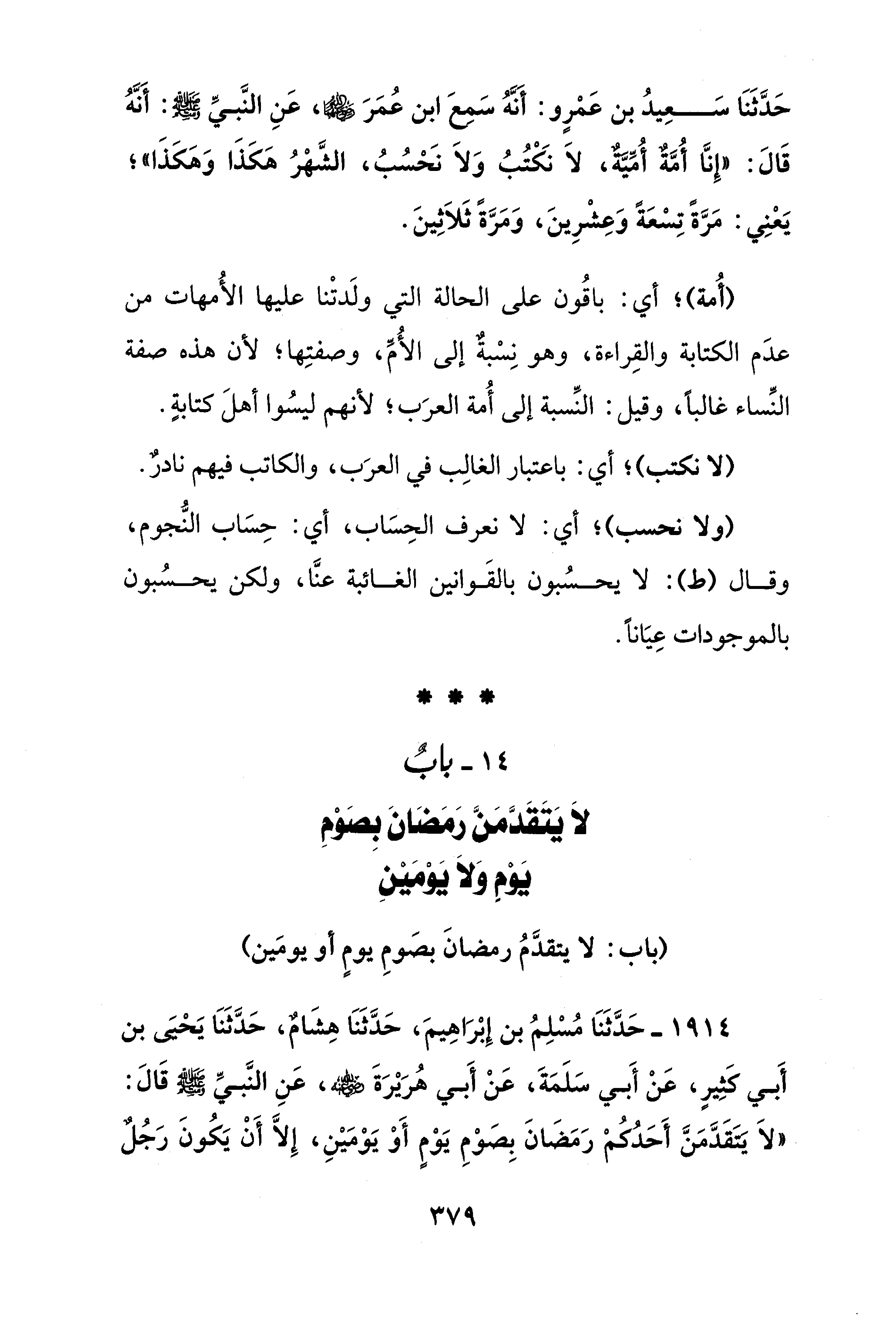 1914 - حَدَّثَنَا مُسْلِمُ بن إِبْرَاهِيمَ، حَدَّثَنَا هِشَامٌ، حَدَّثَنَا يَحْيَى بن أَبي كَثِيرٍ، عَنْ أَبي سَلَمَةَ، عَنْ أَبي هُرَيْرَةَ - رضي الله عنه -، عَنِ النَّبيِّ - صلى الله عليه وسلم - قَالَ: "لاَ يَتَقَدَّمَنَّ أَحَدُكُمْ رَمَضَانَ بِصَوْمِ يَوْمٍ أَوْ يَوْمَيْنِ، إِلَّا أَنْ يَكُونَ رَجُلٌ