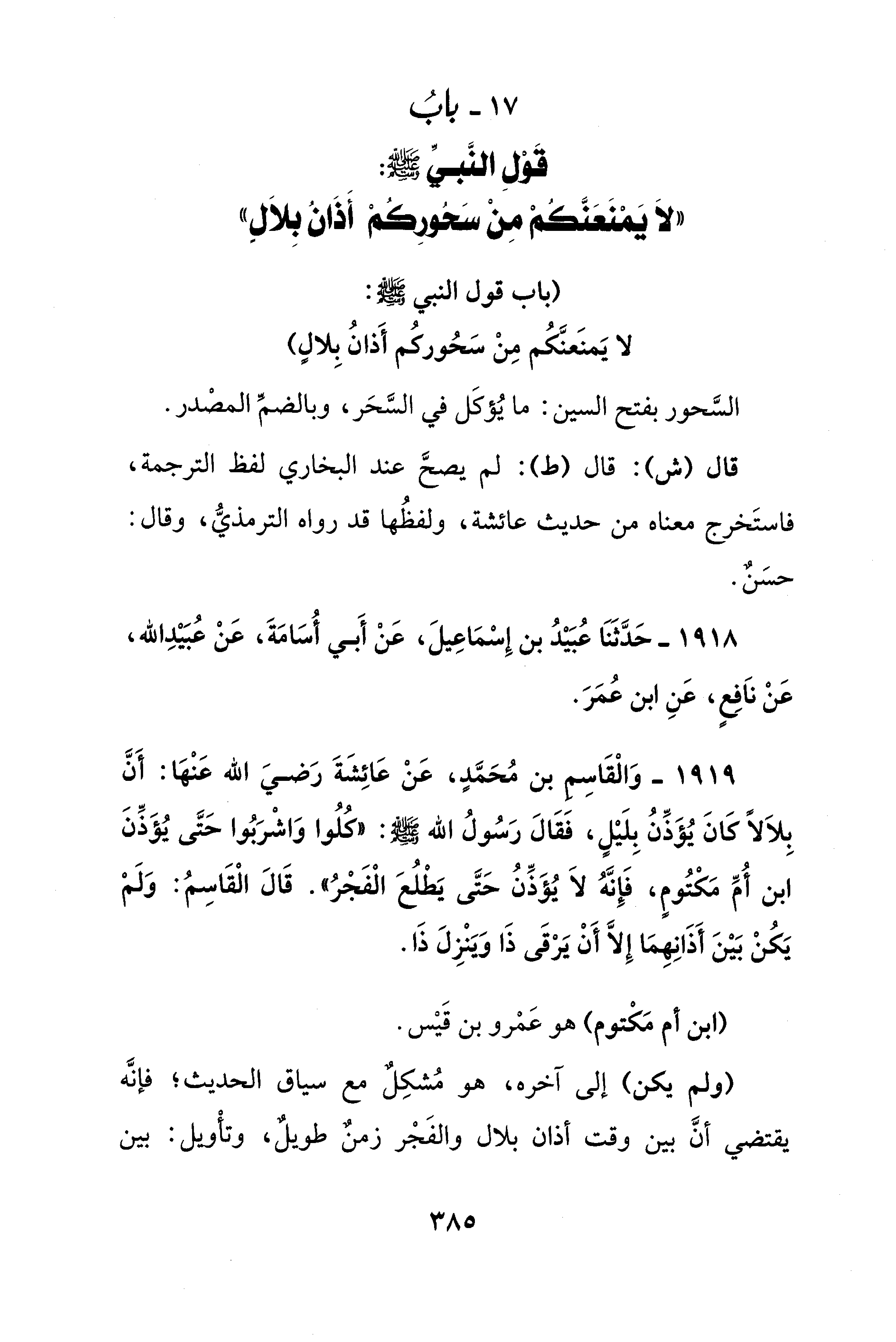 17 - بابُ قَوْلِ النَّبيِّ - صلى الله عليه وسلم -: "لاَ يَمْنَعَنَّكُمْ مِنْ سَحُورِكُمْ أَذَانُ بِلاَلِ"