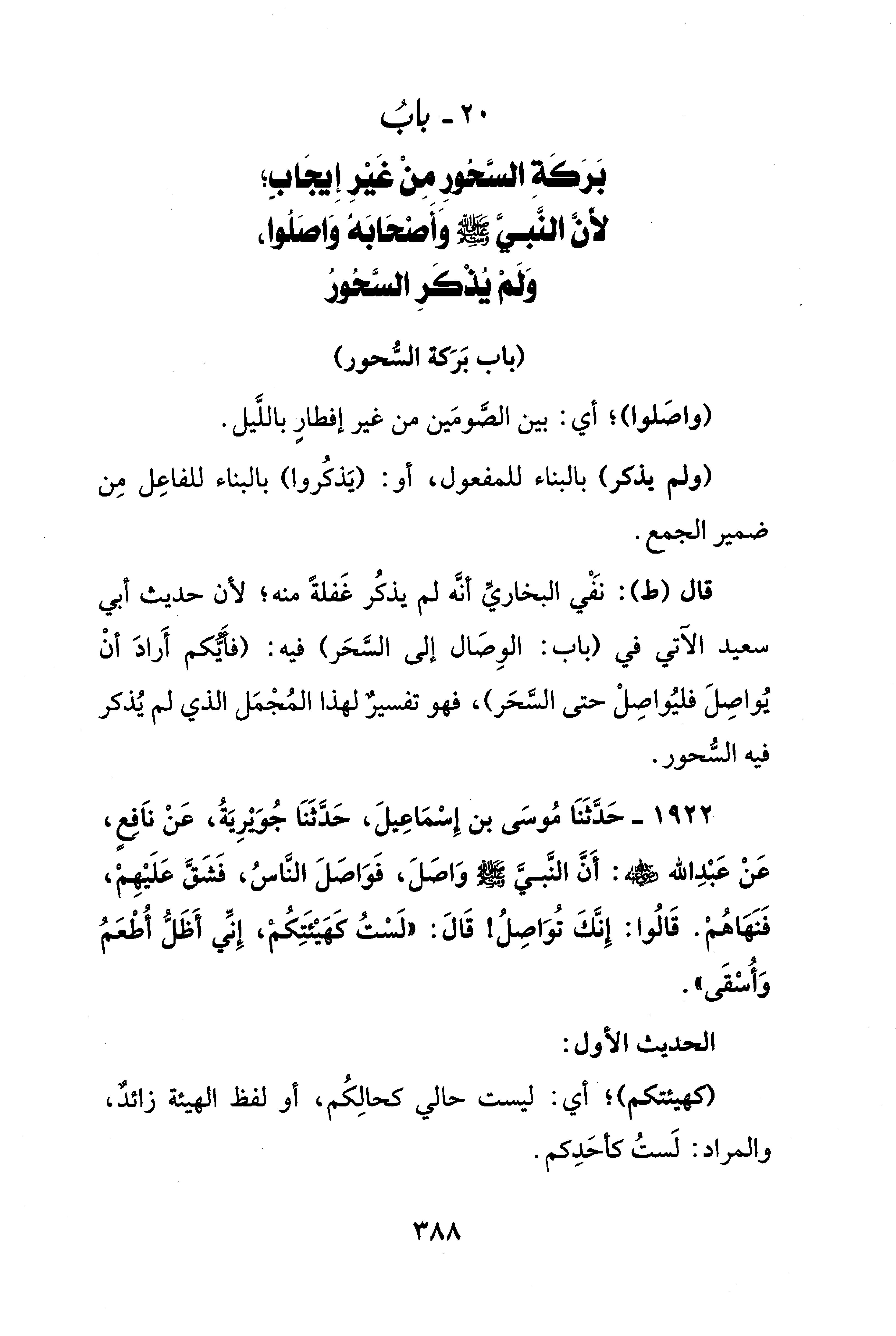 20 - بابُ بَرَكَةِ السَّحُورِ مِنْ غَيْرِ إِيجَاب؛ لأَنَّ النَّبيَّ - صلى الله عليه وسلم - وَأَصْحَابَهُ وَاصَلُوا، وَلَمْ يُذْكَرِ السَّحُورُ