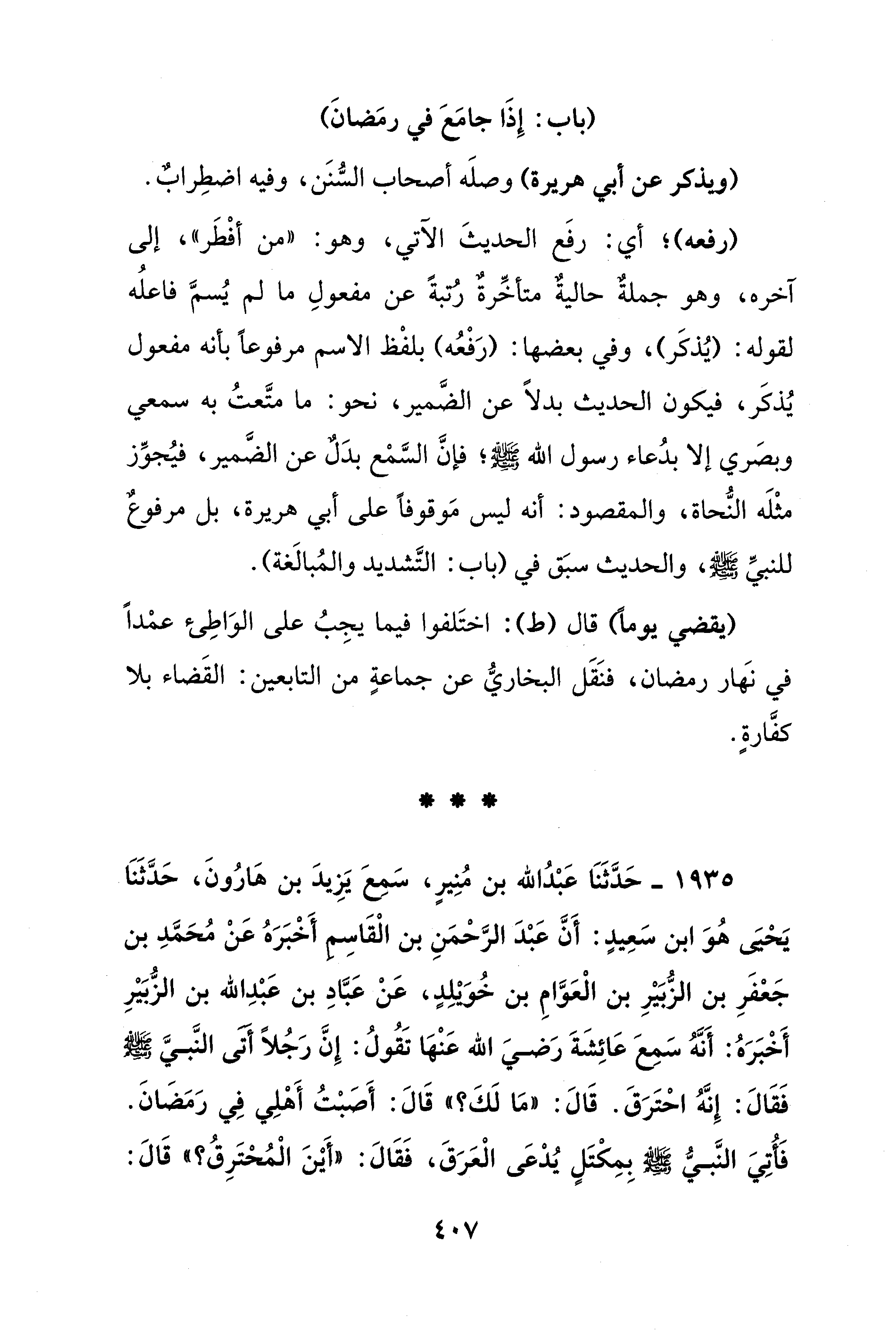 1935 - حَدَّثَنَا عَبْدُ الله بن مُنِيرٍ، سَمعَ يَزِيدَ بن هارُونَ، حَدَّثَنَا يَحيَى هُوَ ابن سَعِيدٍ: أَنَّ عَبْدَ الرَّحمَنِ بن الْقَاسِم أَخْبَرَهُ عَنْ مُحَمَّدِ بن جَعفَرِ بن الزُّبَيْرِ بن الْعَوَّامِ بن خُويلِدٍ، عَنْ عَبَّادِ بن عَبْدِ الله بن الزُّبَيْرِ أَخْبَرَهُ: أَنَّهُ سَمِعَ عَائِشَةَ رَضيَ الله عَنْها تَقُولُ: إِنَّ رَجُلًا أتى النَّبيَّ - صلى الله عليه وسلم - فَقَالَ: إِنَّهُ احْتَرَقَ. قَالَ: "مَا لَكَ؟ " قَالَ: أَصبْتُ أَهْلِي فِي رَمَضَانَ. فَأُتِيَ النَّبيُّ - صلى الله عليه وسلم - بِمِكْتَلٍ يُدْعَى الْعَرَقَ، فَقَالَ: "أَيْنَ الْمُحْتَرِقُ؟ "، قَالَ: