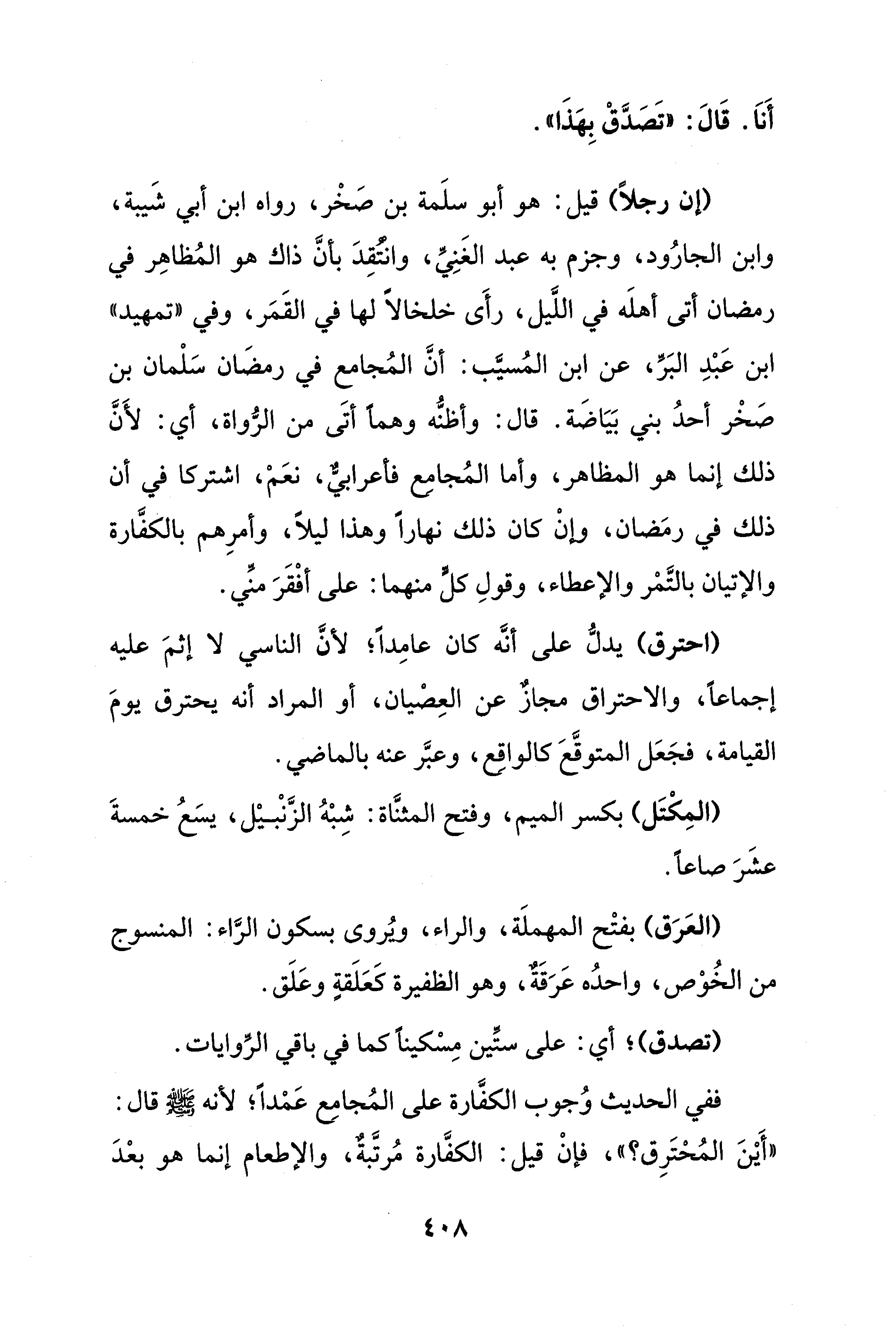 (إن رجلًا) قيل: هو أبو سلَمة بن صَخْر، رواه ابن أبي شَيبة، وابن الجارُود، وجزم به عبد الغَنِيِّ، وانتُقِدَ بأنَّ ذاك هو المُظاهِر في رمضان أتى أهلَه في اللَّيل، رأَى خلخالًا لها في القَمَر، وفي "تمهيد" ابن عَبْدِ البَرِّ، عن ابن المُسيَّب: أنَّ المُجامع في رمضَان سَلْمان بن صَخْر أحدُ بني بَيَاضَة. قال: وأظنُّه وهمًا أتَى من الرُّواة، أي: لأَنَّ ذلك إنما هو المظاهر، وأما المُجامع فأعرابيٌّ، نعَم، اشتركا في أن ذلك في رمَضان، وإنْ كان ذلك نهارًا وهذا ليلًا، وأمرِهم بالكفَّارة والإتيان بالتَّمر والإعطاء، وقولِ كل منهما: على أفْقَرَ منِّي.