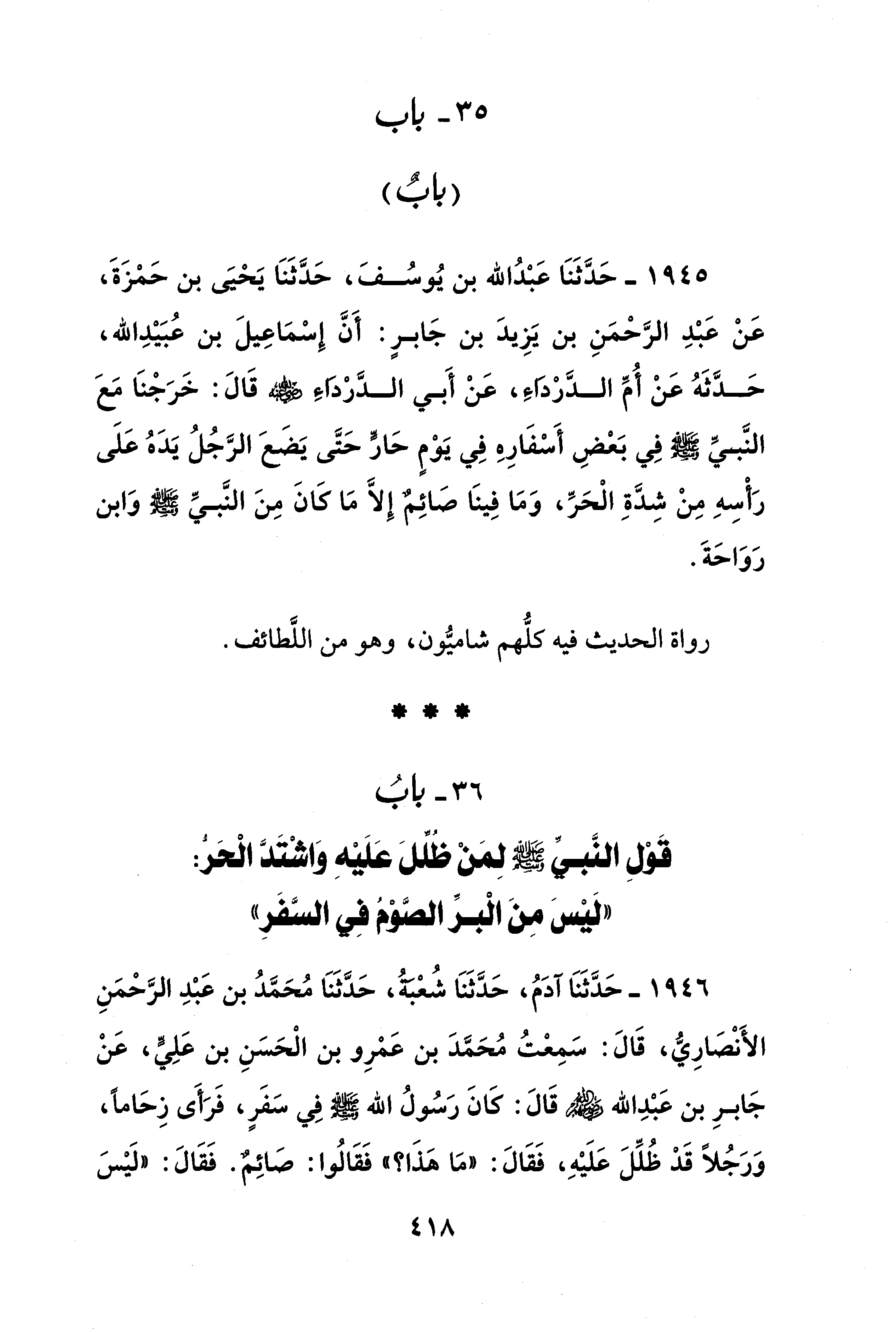 1945 - حَدَّثَنَا عَبْدُ الله بن يُوسُفَ، حَدَّثَنَا يَحيَى بن حَمزَةَ، عَنْ عَبْدِ الرَّحمَنِ بن يَزِيدَ بن جَابرٍ: أَنَّ إِسْمَاعِيلَ بن عُبَيْدِ الله، حَدَّثَهُ عَنْ أُمِّ الدَّرْداء، عَنْ أَبي الدَّرْداءِ - رضي الله عنه - قَالَ: خَرَجْنَا مَعَ النَّبيِّ - صلى الله عليه وسلم - فِي بَعْضِ أَسْفَارِهِ فِي يَومٍ حَارٍّ حَتَّى يَضَعَ الرَّجُلُ يَدَهُ عَلَى رَأْسِهِ مِنْ شِدَّةِ الْحَرِّ، وَمَا فِينَا صَائِمٌ إلَّا مَا كَانَ مِنَ النَّبيِّ - صلى الله عليه وسلم - وَابن رَوَاحَةَ.