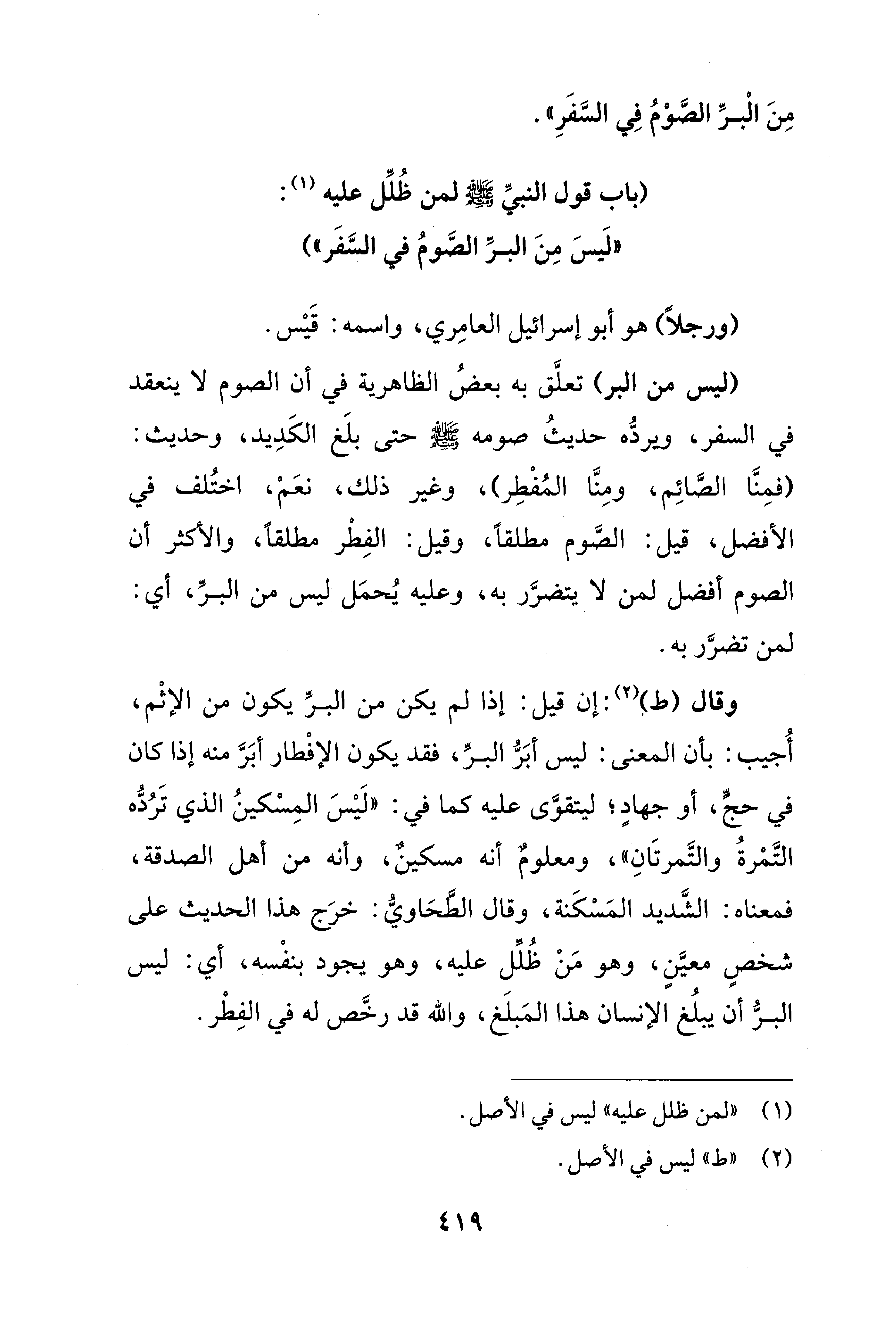 وقال (ط) (¬2): إن قيل: إذا لم يكن من البرِّ يكون من الإثْم، أُجيب: بأن المعنى: ليس أبَرُّ البرِّ، فقد يكون الإفْطار أبَرَّ منه إذا كان في حجٍّ، أو جهادٍ؛ ليتقوَّى عليه كما في: "لَيْسَ المِسْكينُ الذي تَرُدُّه التَّمرةُ والتَّمرتَانِ"، ومعلومٌ أنه مسكينٌ، وأنه من أهل الصدقة، فمعناه: الشَّديد المَسْكَنة، وقال الطَّحَاويُّ: خرَج هذا الحديث على شخصٍ معيَّنٍ، وهو مَنْ ظُلِّل عليه، وهو يجود بنفْسه، أي: ليس البرُّ أن يبلُغ الإنسان هذا المَبلَغ، والله قد رخَّص له في الفِطْر.