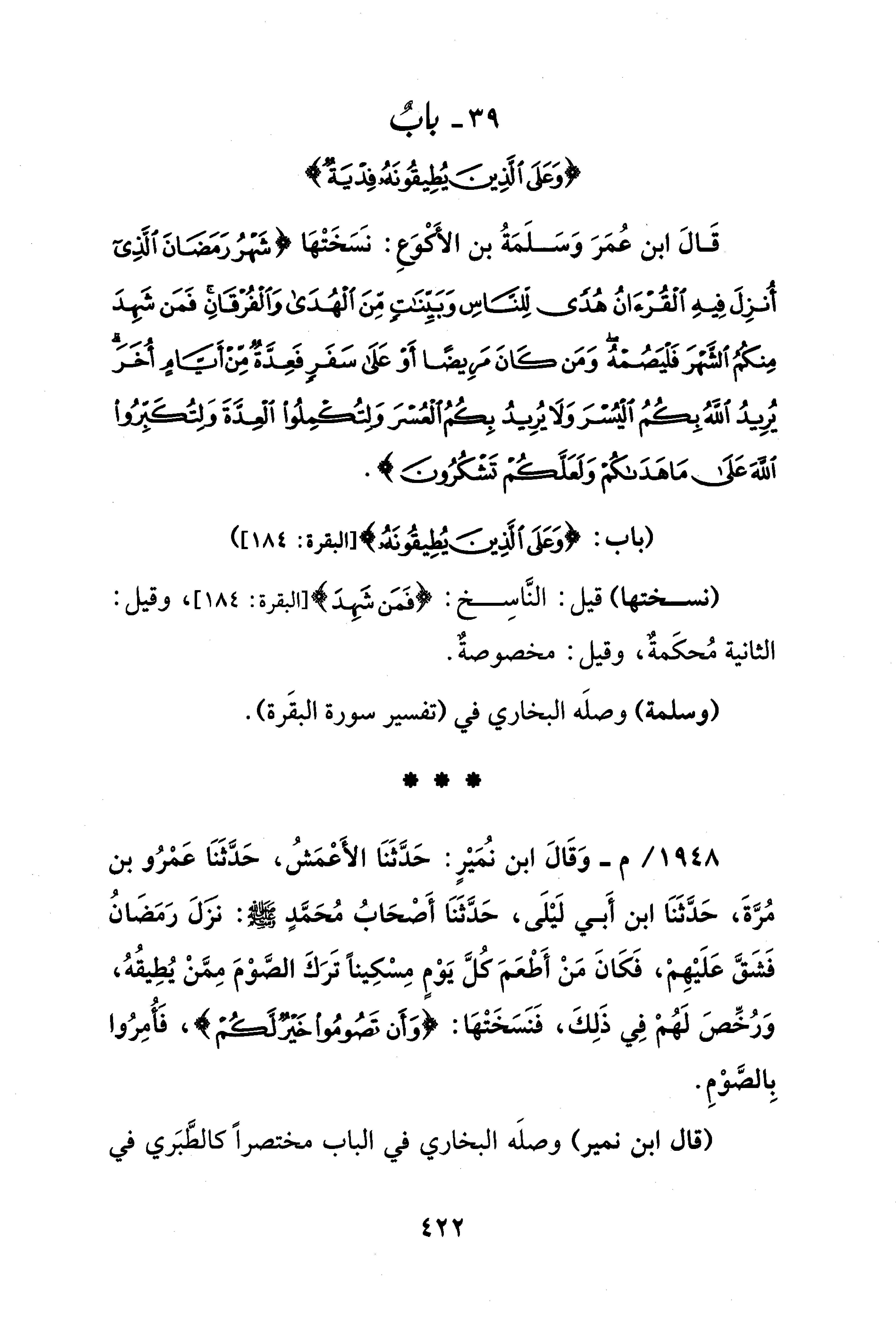 39 - بابٌ {وَعَلَى الَّذِينَ يُطِيقُونَهُ}