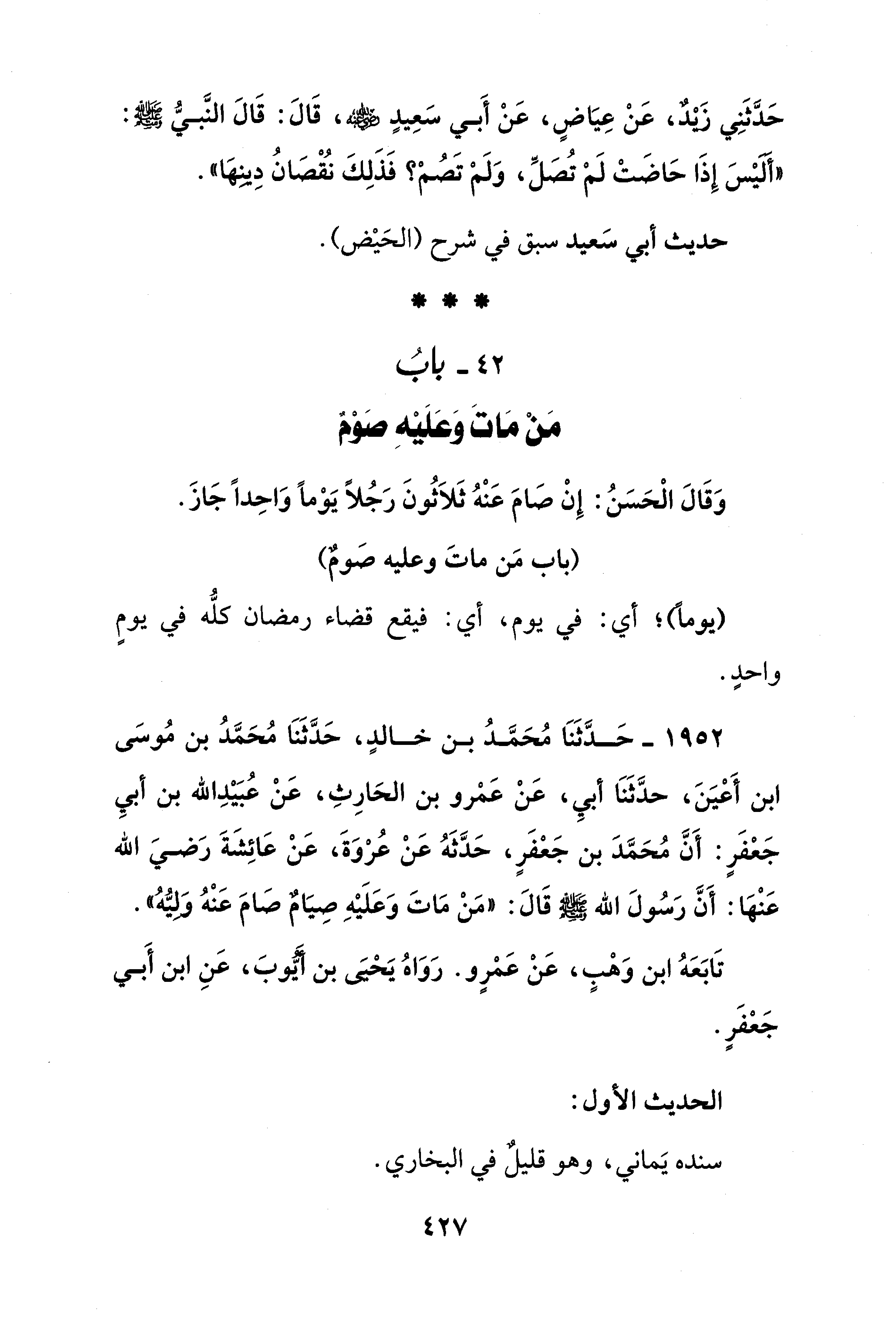 1952 - حَدَّثَنَا مُحَمَّدُ بن خالدٍ، حَدَّثَنَا مُحَمَّدُ بن مُوسَى ابن أَعْيَنَ، حدَّثَنَا أبيِ، عَنْ عمرو بن الحَارِثِ، عَنْ عُبَيْدِ الله بن أبيِ جَعْفَرٍ: أَنَّ مُحَمَّدَ بن جَعْفَرٍ، حَدَّثَهُ عَنْ عُرْوَةَ، عَنْ عَائِشَةَ رَضيَ الله عَنْها: أَنَّ رَسُولَ الله - صلى الله عليه وسلم - قَالَ: "مَنْ مَاتَ وَعَلَيْهِ صيَامٌ صَامَ عَنْهُ وَليُّهُ".