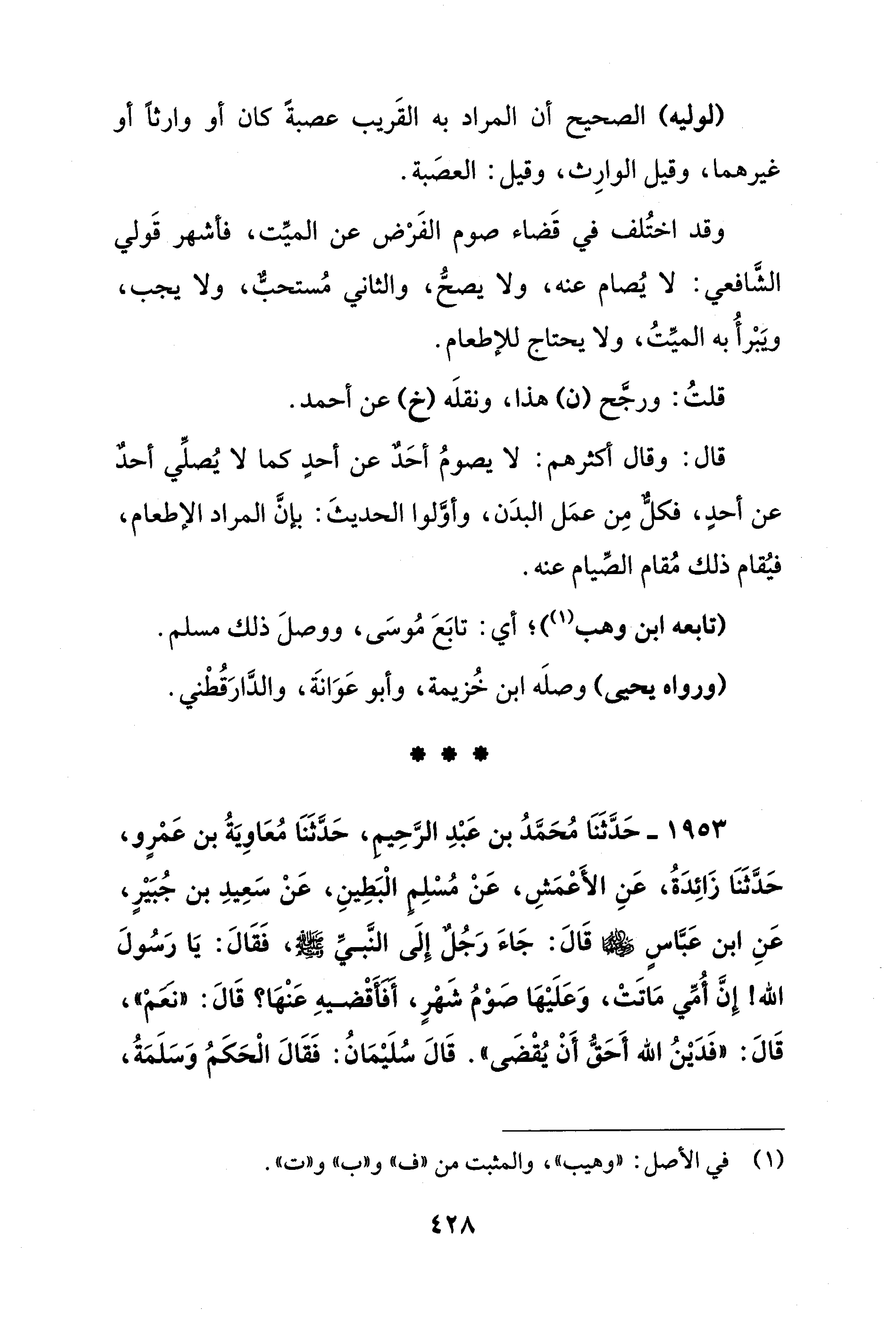 1953 - حَدَّثَنَا مُحَمَّدُ بن عَبْدِ الرَّحِيم، حَدَّثَنَا مُعَاوِيَةُ بن عَمرٍو، حَدَّثَنَا زَائِدَةُ، عَنِ الأعْمَشِ، عَنْ مُسْلِمٍ الْبَطِينِ، عَنْ سَعِيدِ بن جُبَيْرٍ، عَنِ ابن عَبَّاسٍ - رضي الله عنهما - قَالَ: جَاءَ رَجلٌ إِلَى النَّبيِّ - صلى الله عليه وسلم -، فَقَالَ: يَا رَسُولَ الله! إِنَّ أُمِّي مَاتَتْ، وَعَلَيْهَا صَوْمُ شَهْرٍ، أفأقْضيهِ عَنْها؟ قَالَ: "نعم"، قَالَ: "فَدَيْنُ الله أَحَقُّ أَنْ يُقْضَى". قَالَ سُلَيْمَانُ: فَقَالَ الْحَكَمُ وَسَلَمَةُ،