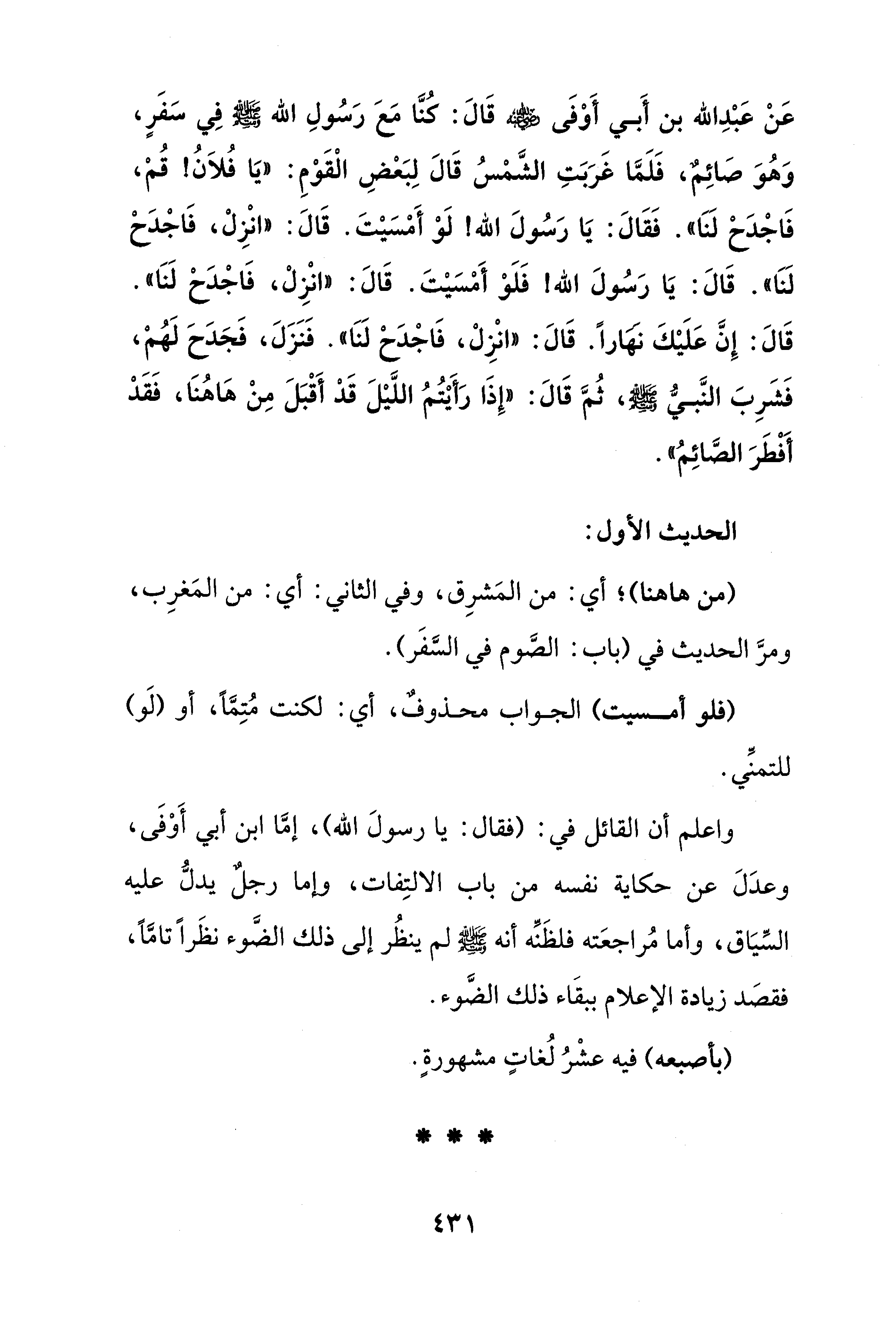 عَنْ عَبْدِ الله بن أَبي أَوْفَى - رضي الله عنه - قَالَ: كنَّا مَعَ رَسُولِ الله - صلى الله عليه وسلم - فِي سَفَرٍ، وَهُوَ صَائِمٌ، فَلَمَّا غَرَبَتِ الشَّمسُ قَالَ لِبَعْضِ الْقَوْمِ: "يَا فُلاَنٌ! قُمْ، فَاجْدحْ لنا". فَقَالَ: يَا رَسُولَ الله! لَوْ أَمسَيْتَ. قَالَ: "انْزِلْ، فَاجْدَحْ لَنَا". قَالَ: يَا رَسُولَ الله! فَلَوْ أَمْسَيْتَ. قَالَ: "انْزِلْ، فَاجْدحْ لَنَا". قَالَ: إِنَّ عَلَيْكَ نهارًا. قَالَ: "انْزِلْ، فَاجْدَح لنا". فَنَزَلَ، فَجَدَحَ لَهُم، فَشَرِبَ النَّبيُّ - صلى الله عليه وسلم -، ثُمَّ قالَ: "إِذَا رَأَيْتُمُ اللَّيْلَ قَد أَقْبَلَ مِنْ هاهُنَا، فَقَد أَفْطَرَ الصَّائِمُ".