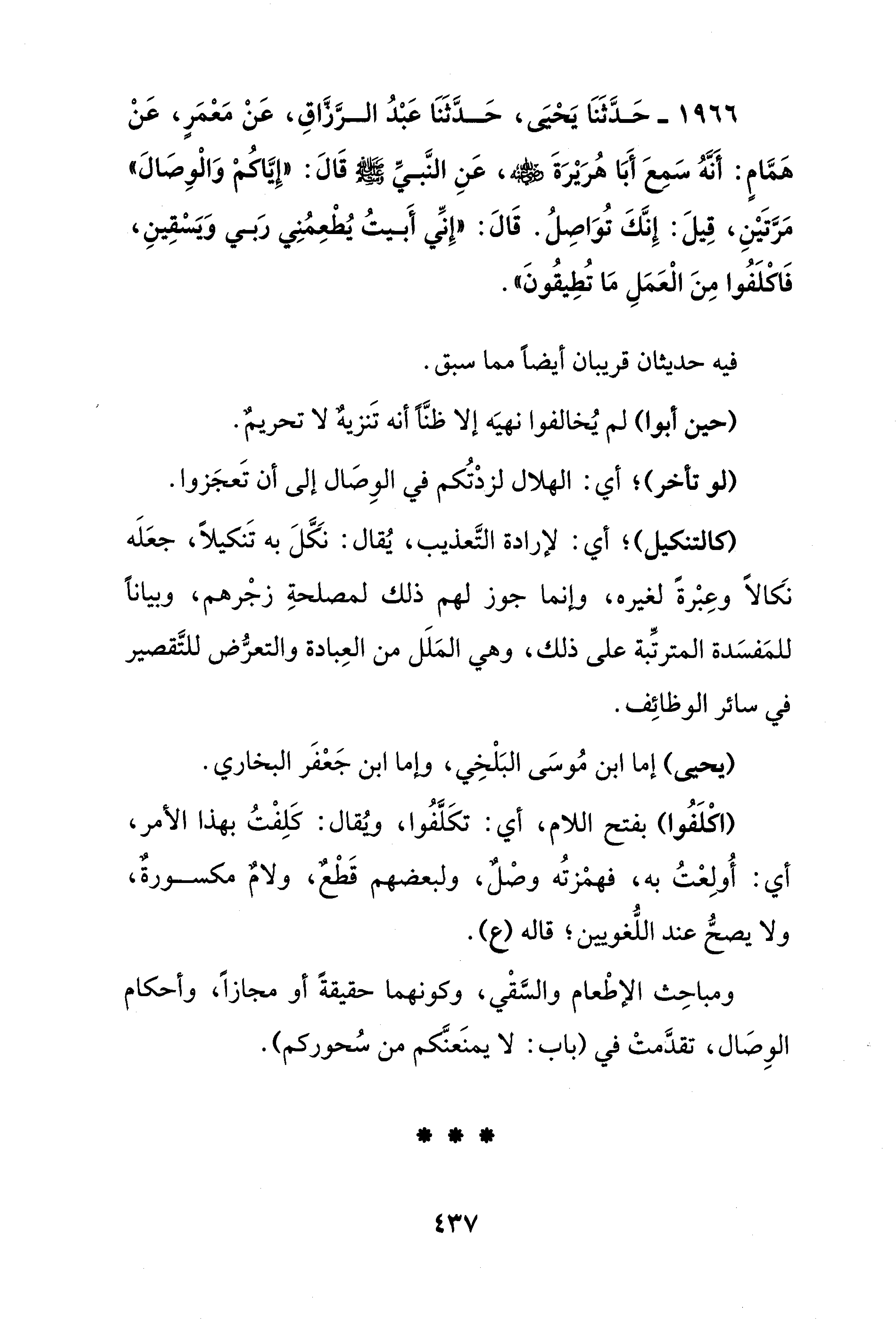 1966 - حَدَّثَنَا يحيَى، حَدَّثَنَا عَبْدُ الرَّزَاقِ، عَنْ مَعمَرٍ، عَنْ همَّامٍ: أَنَّهُ سَمِعَ أَبَا هُرَيْرَةَ - رضي الله عنه -، عَنِ النَّبيِّ - صلى الله عليه وسلم - قَالَ: "إِيَّاكُم وَالْوِصالَ" مَرَّتَيْنِ، قِيلَ: إِنَّكَ تُوَاصِلُ. قَالَ: "إِنِّي أَبيتُ يُطْعِمُنِي رَبي وَيَسْقِينِ، فَاكلَفُوا مِنَ الْعَمَلِ مَا تُطِيقُونَ".