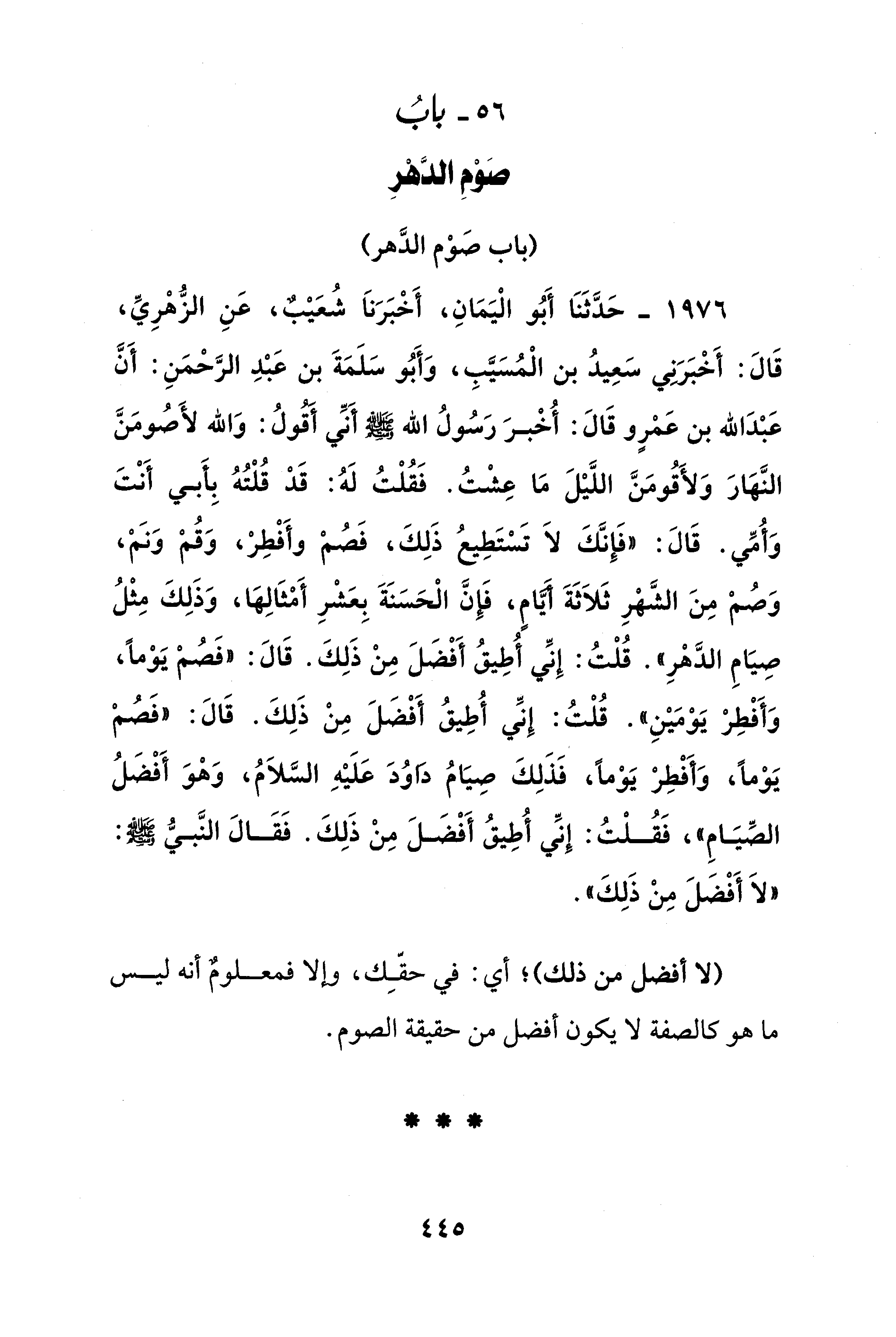 1976 - حَدَّثَنَا أَبُو الْيَمَانِ، أَخْبَرَناَ شُعَيبٌ، عَنِ الزُّهْرِيِّ، قَالَ: أَخْبَرَني سَعِيدُ بن الْمُسَيَّبِ، وَأَبُو سَلَمَةَ بن عَبْدِ الرَّحمَنِ: أَنَّ عَبْدَ الله بن عَمرٍو قَالَ: أُخْبرَ رَسُولُ الله - صلى الله عليه وسلم - أَنِّي أقولُ: وَالله لأَصُومَنَّ النَّهارَ وَلأَقُومَنَّ اللَّيْلَ مَا عِشْتُ. فَقُلْتُ لَهُ: قَد قُلْتُهُ بأَبي أَنْتَ وَأُمِّي. قَالَ: "فَإِنَّكَ لاَ تَسْتَطِيعُ ذَلِكَ، فَصُم وأَفْطِرْ، وَقُم وَنَم، وَأمي مِنَ الشَّهْرِ ثَلاَثَةَ أيامٍ، فَإنَّ الْحَسَنَةَ بِعَشْرِ أَمثَالِها، وَذَلِكَ مِثْلُ صيَامِ الدَّهْرِ". قُلْتُ: إِنِّي أُطِيقُ أَفْضَلَ مِنْ ذَلِكَ. قَالَ: "فَصُم يَوْمًا، وَأَفْطِرْ يَوْمَيْنِ". قُلْتُ: إِنِّي أُطِيقُ أَفْضَلَ مِنْ ذَلِكَ. قَالَ: "فَصُم يَوْمًا، وَأَفْطِرْ يَوْمًا، فَذَلِكَ صيَامُ داوُدَ عَلَيْهِ السَّلاَمُ، وَهْوَ أَفْضَلُ الصِّيَام"، فَقُلْتُ: إِنِّي أُطِيقُ أَفْضَلَ مِنْ ذَلِكَ. فَقَالَ النَّبيُّ - صلى الله عليه وسلم -: "لاَ أَفْضَلَ مِنْ ذَلِكَ".