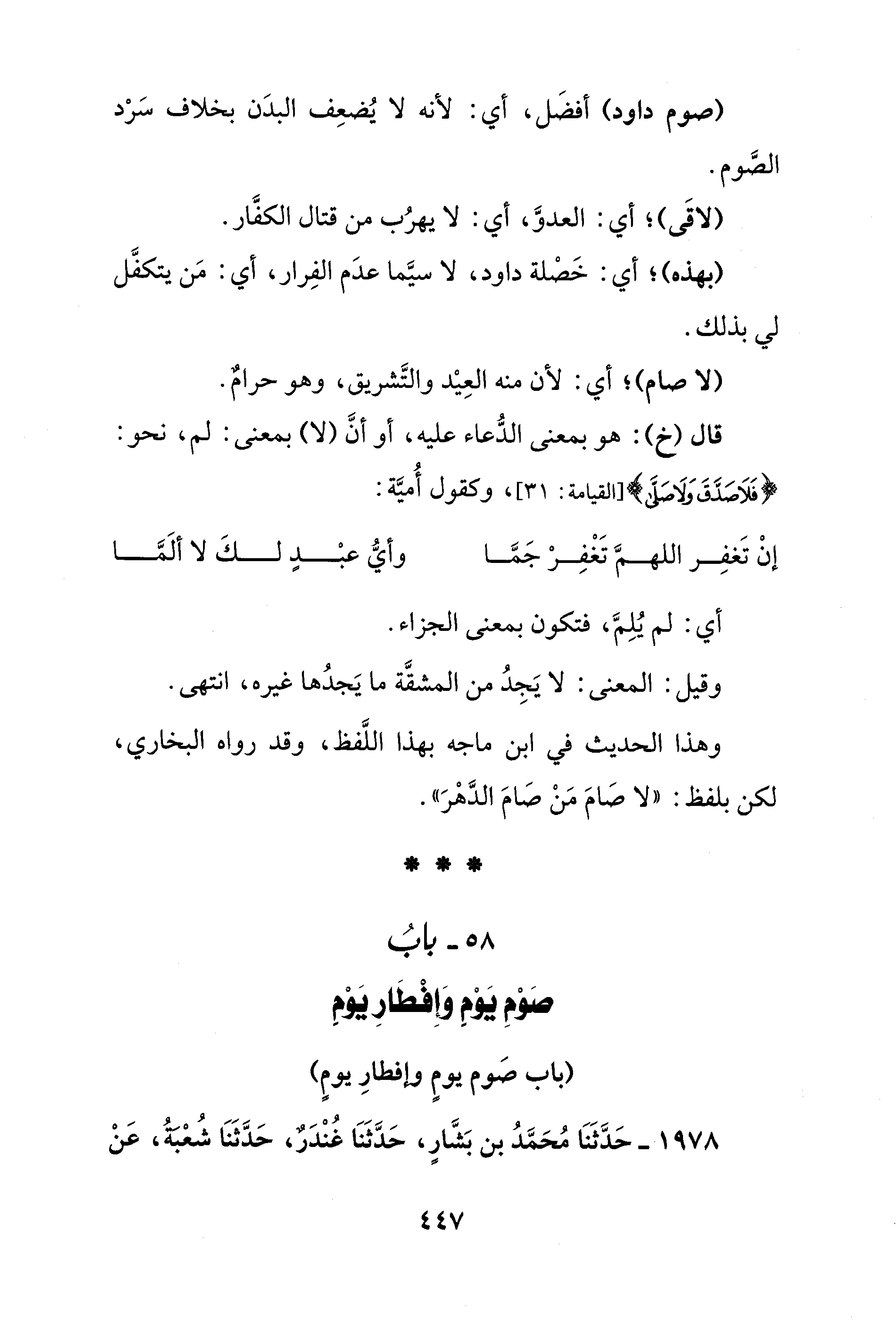 وهذا الحديث في ابن ماجه بهذا اللَّفظ، وقد رواه البخاري، لكن بلفظ: "لا صَامَ مَنْ صَامَ الدَّهْرَ".