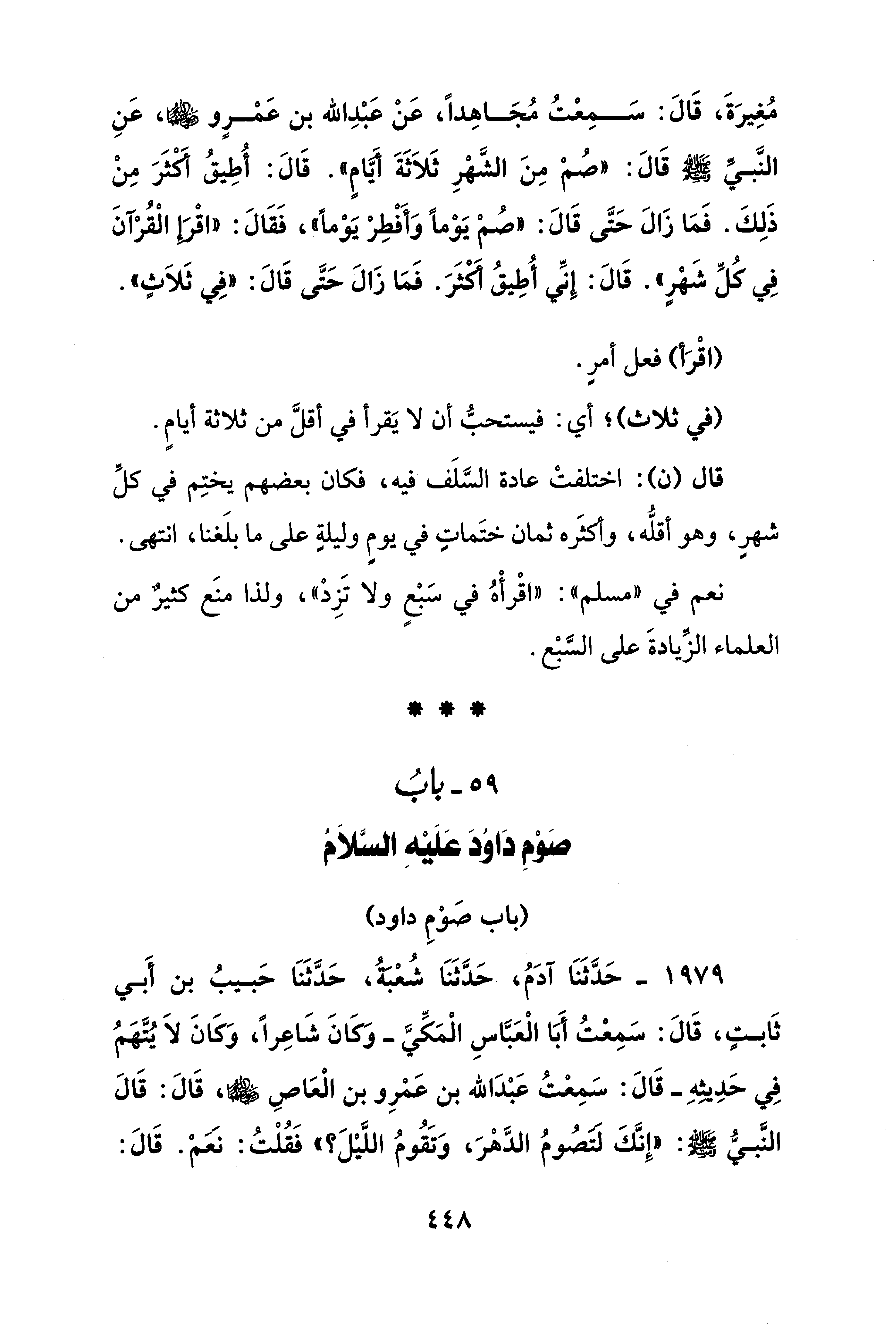 مُغِيرَةَ، قَالَ: سَمِعتُ مُجَاهِدًا، عَنْ عَبْدِ الله بن عَمرٍو - رضي الله عنها -، عَنِ النَّبيِّ - صلى الله عليه وسلم - قَالَ: "صُمْ مِنَ الشَّهْرِ ثَلاَثَةَ أيَّامٍ". قَالَ: أُطِيقُ أكثَرَ مِنْ ذَلِكَ. فَمَا زَالَ حَتَّى قَالَ: "صُم يَوْمًا وَأَفْطِرْ يَوْمًا"، فَقَالَ: "اقْرَإ الْقُرآنَ فِي كُلِّ شَهْرٍ". قَالَ: إِنِّي أُطِيقُ أكثَرَ. فَمَا زَالَ حَتَّى قَالَ: "فِي ثَلاَثٍ".