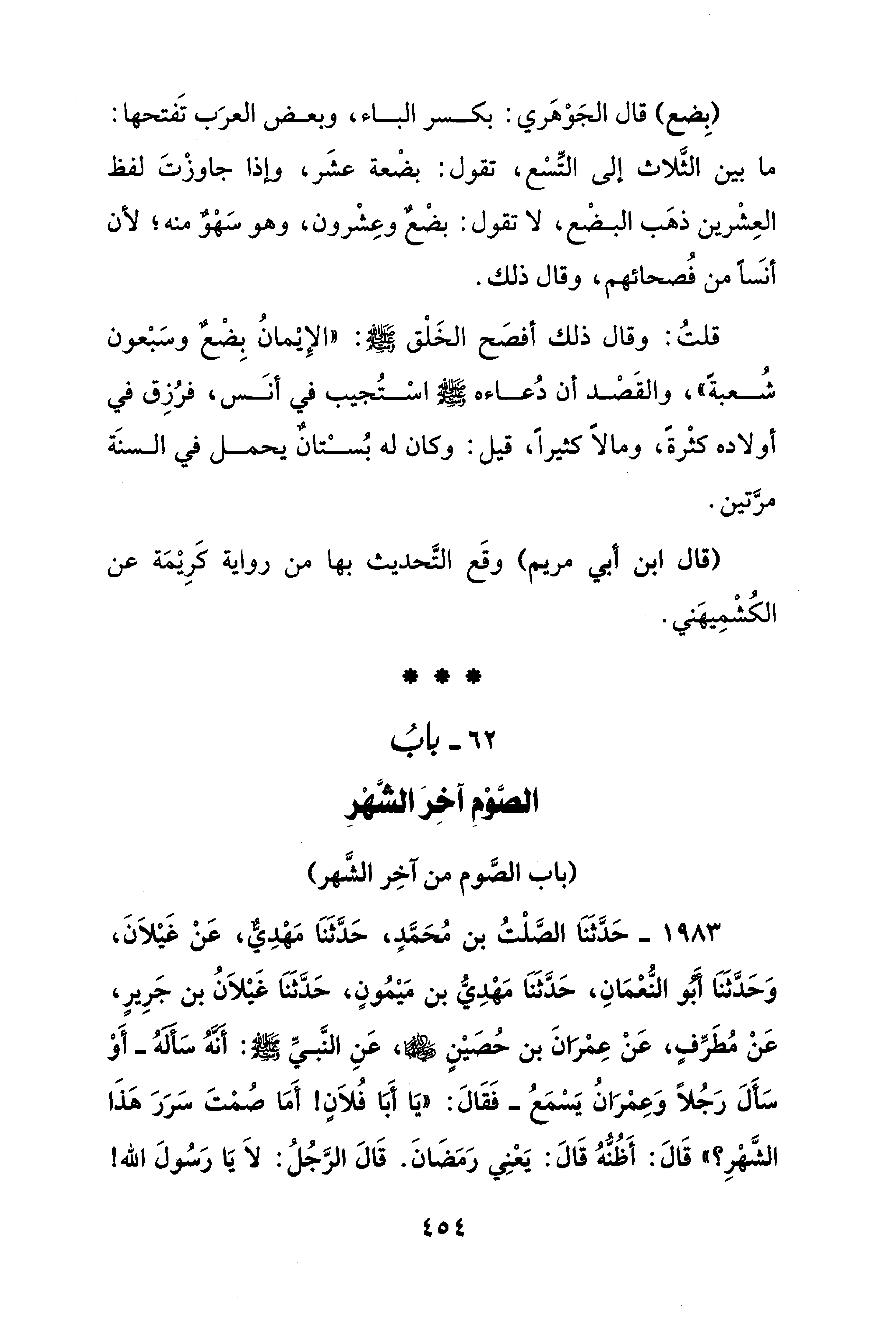 (بِضع) قال الجَوهري: بكسر الباء، وبعض العرَب تَفتحها: ما بين الثَّلاث إلى التِّسْع، تقول: بضْعة عشَر، وإذا جاوزْتَ لفظ العِشْرين ذهب البضْع، لا تقول: بضْعٌ وعِشْرون، وهو سَهْوٌ منه؛ لأن أنسًا من فُصحائهم، وقال ذلك.