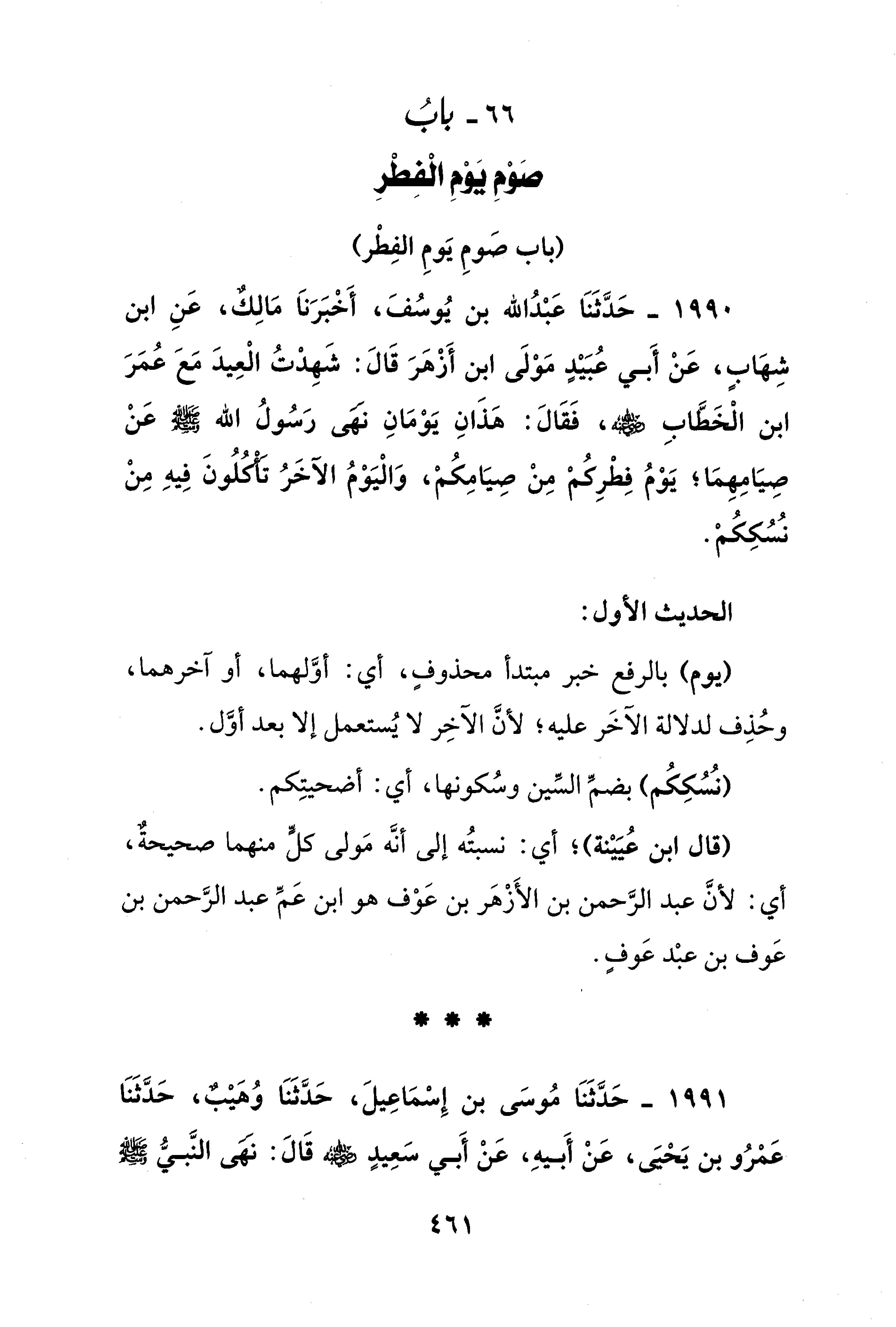 1990 - حَدَّثَنَا عَبْدُ الله بن يُوسُفَ، أَخْبَرَناَ مَالكٌ، عَنِ ابن شِهاب، عَنْ أَبي عُبَيْدٍ مَوْلَى ابن أَزْهرَ قَالَ: شَهدتُ الْعِيدَ مَعَ عُمَرَ ابن الْخَطَّابِ - رضي الله عنه -، فَقَالَ: هذَانِ يَوْمَانِ نهى رَسُولُ الله - صلى الله عليه وسلم - عَنْ صيَامِهِمَا؛ يَوْمُ فِطْرِكُم مِنْ صيَامِكُم، وَالْيَوْمُ الآخَرُ تأكلُونَ فِيهِ مِنْ نُسُكِكُم.