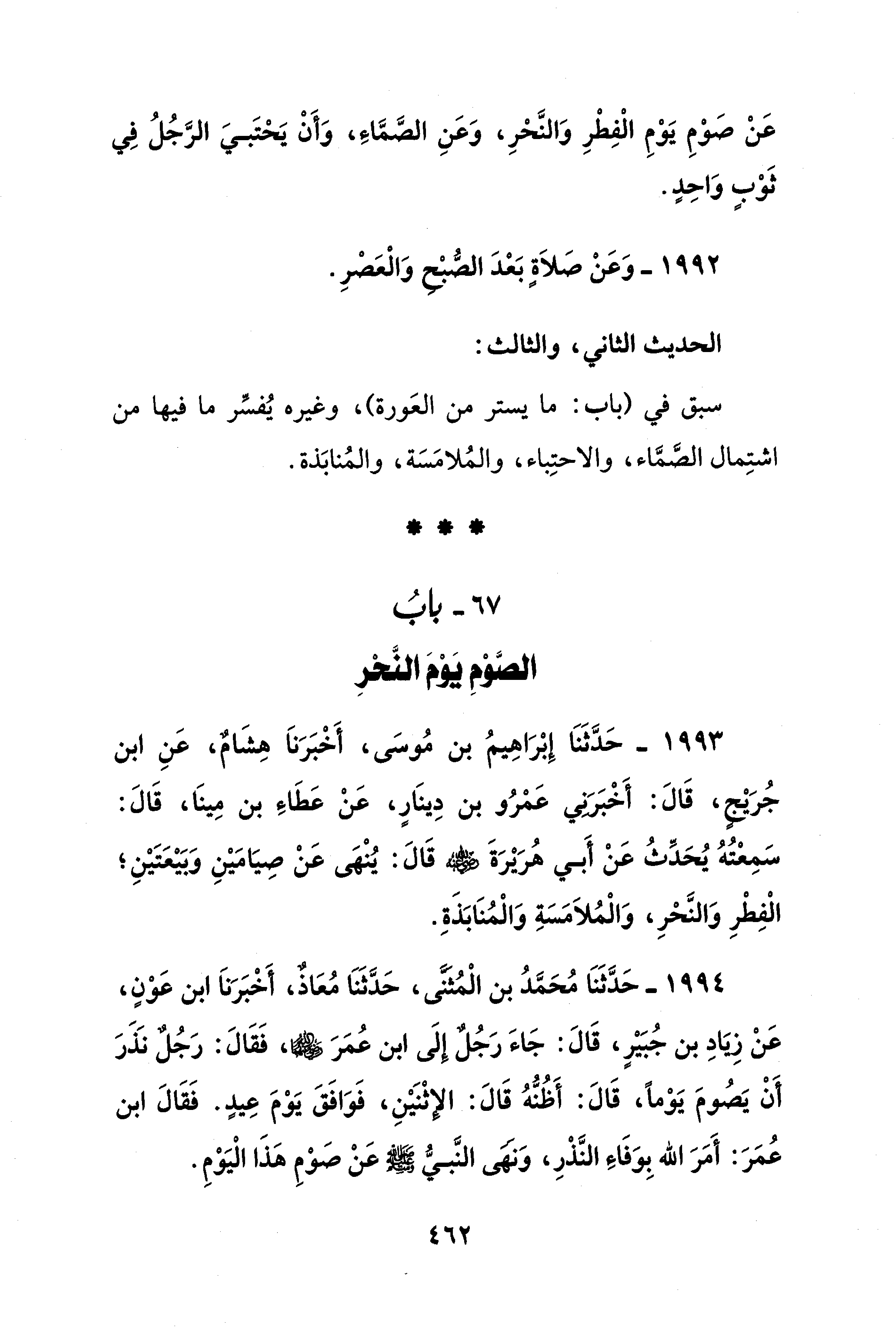 1993 - حَدَّثَنَا إِبْرَاهِيمُ بن مُوسَى، أَخْبَرَناَ هِشَامٌ، عَنِ ابن جُرَيْجٍ، قَالَ: أَخْبَرَني عَمرُو بن دِينَارٍ، عَنْ عَطَاء بن مِينَا، قَالَ: سَمِعْتُهُ يُحَدِّثُ عَنْ أَبي هُرَيْرَة - رضي الله عنه - قَالَ: يُنْهى عَنْ صِيَامَيْنِ وَبَيْعَتَيْنِ؛ الْفِطْرِ وَالنَّحرِ، وَالْمُلاَمَسَةِ وَالْمُنَابَذَةِ.