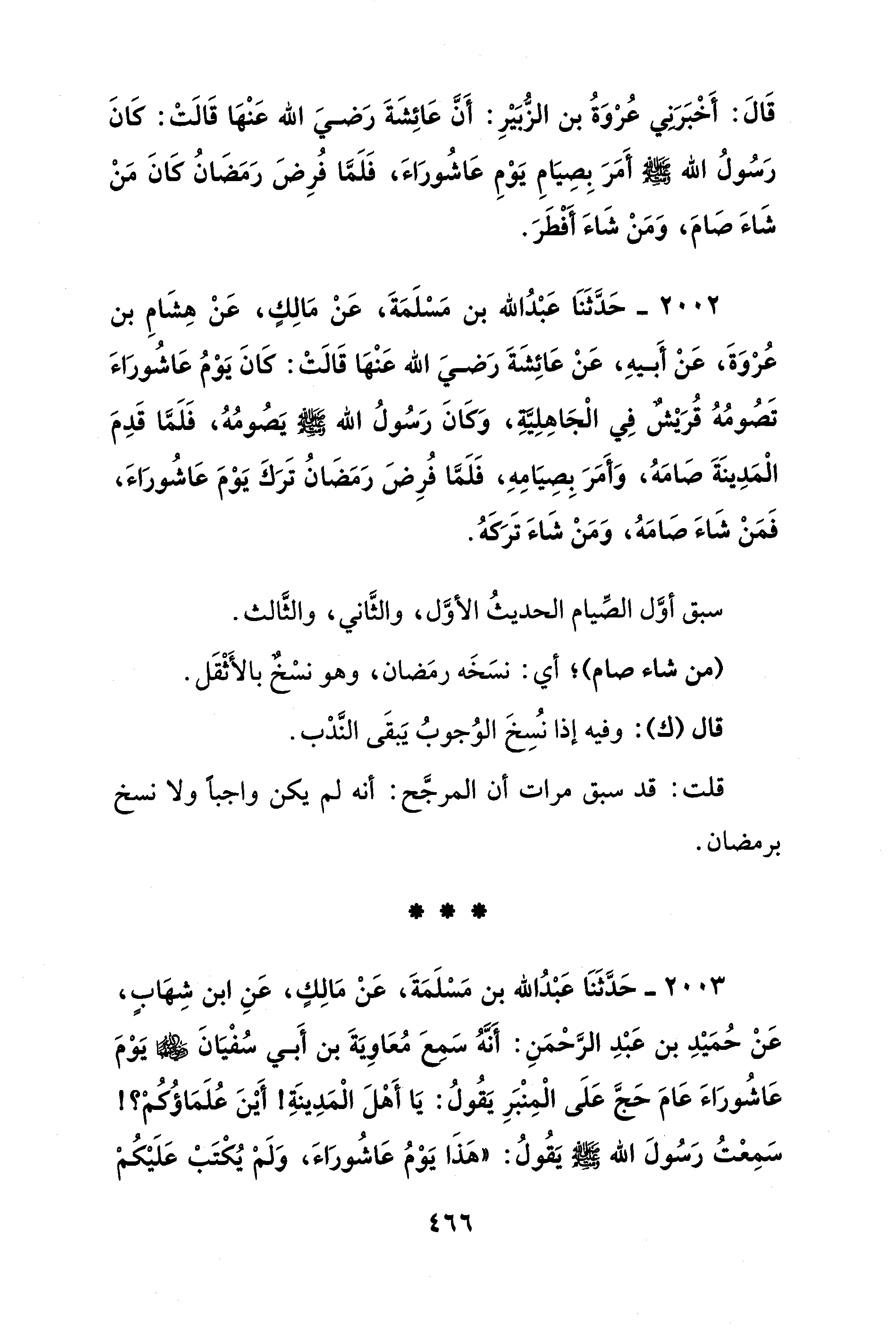 2002 - حَدَّثَنَا عَبْدُ الله بن مَسْلَمَةَ، عَنْ مَالِكٍ، عَنْ هِشَامِ بن عُرْوَةَ، عَنْ أَبيهِ، عَنْ عَائِشَةَ رَضيَ الله عَنْها قَالَتْ: كَانَ يَوْمُ عَاشُورَاءَ تَصُومُهُ قُرَيْشٌ فِي الْجَاهِلِيَّةِ، وَكَانَ رَسُولُ الله - صلى الله عليه وسلم - يَصُومُهُ، فَلَمَّا قَدِمَ الْمَدِينَةَ صَامَهُ، وَأَمَرَ بِصِيَامِهِ، فَلَمَّا فُرِضَ رَمَضَانُ تَرَكَ يَوْمَ عَاشُورَاءَ، فَمَنْ شَاءَ صَامَهُ، وَمَنْ شَاء تَرَكَهُ.