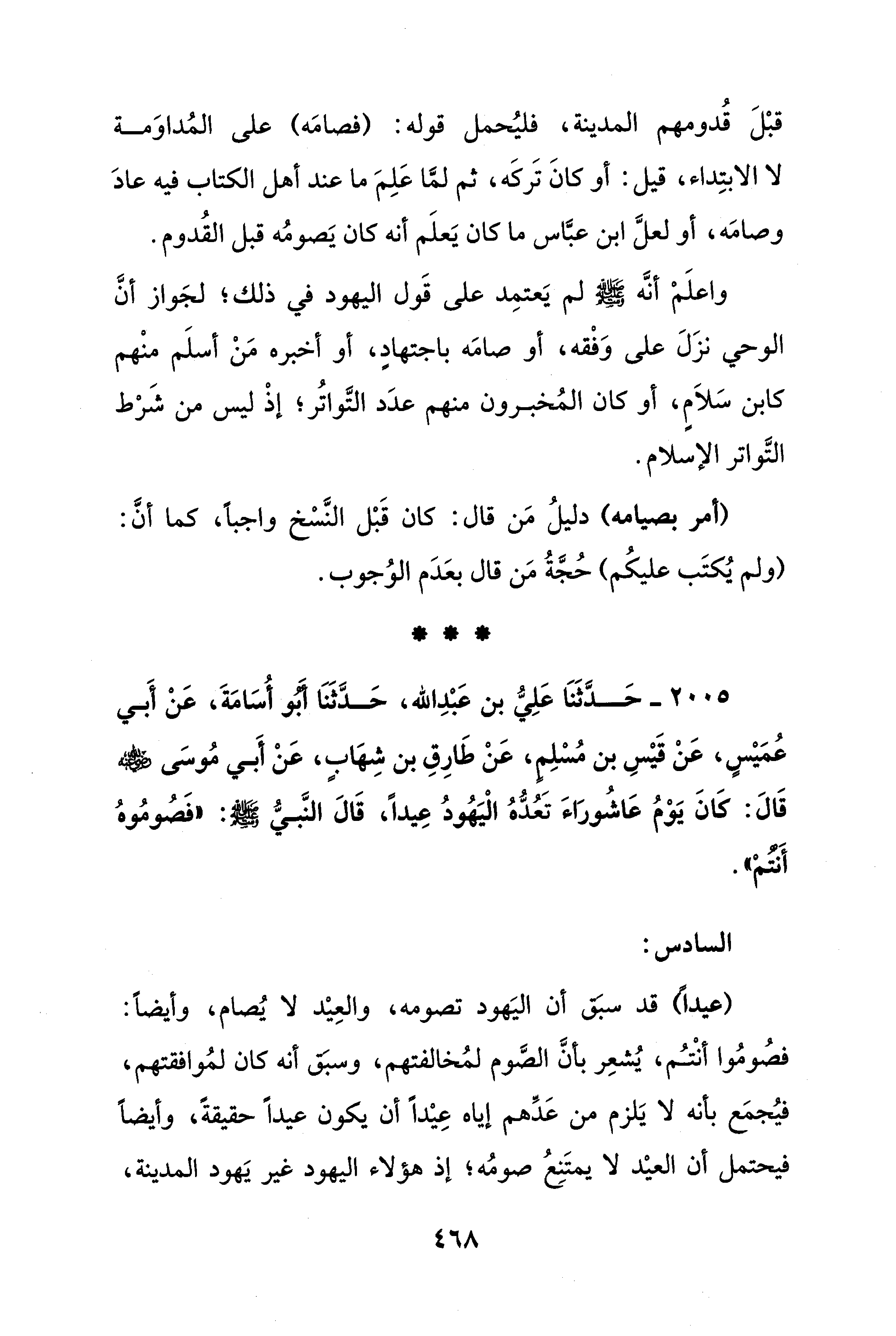 2005 - حَدَّثَنَا عَلِيُّ بن عَبْدِ الله، حَدَّثنا أبو أُسَامَةَ، عَنْ أَبي عُمَيْسٍ، عَنْ قَيْسِ بن مُسْلِمٍ، عَنْ طَارِقِ بن شِهابٍ، عَنْ أَبي مُوسَى - رضي الله عنه - قَالَ: كَانَ يَوْمُ عَاشُوراءَ تَعُدُّهُ الْيَهُودُ عِيدًا، قَالَ النَّبيُّ - صلى الله عليه وسلم -: "فَصُومُوهُ أنتمْ".