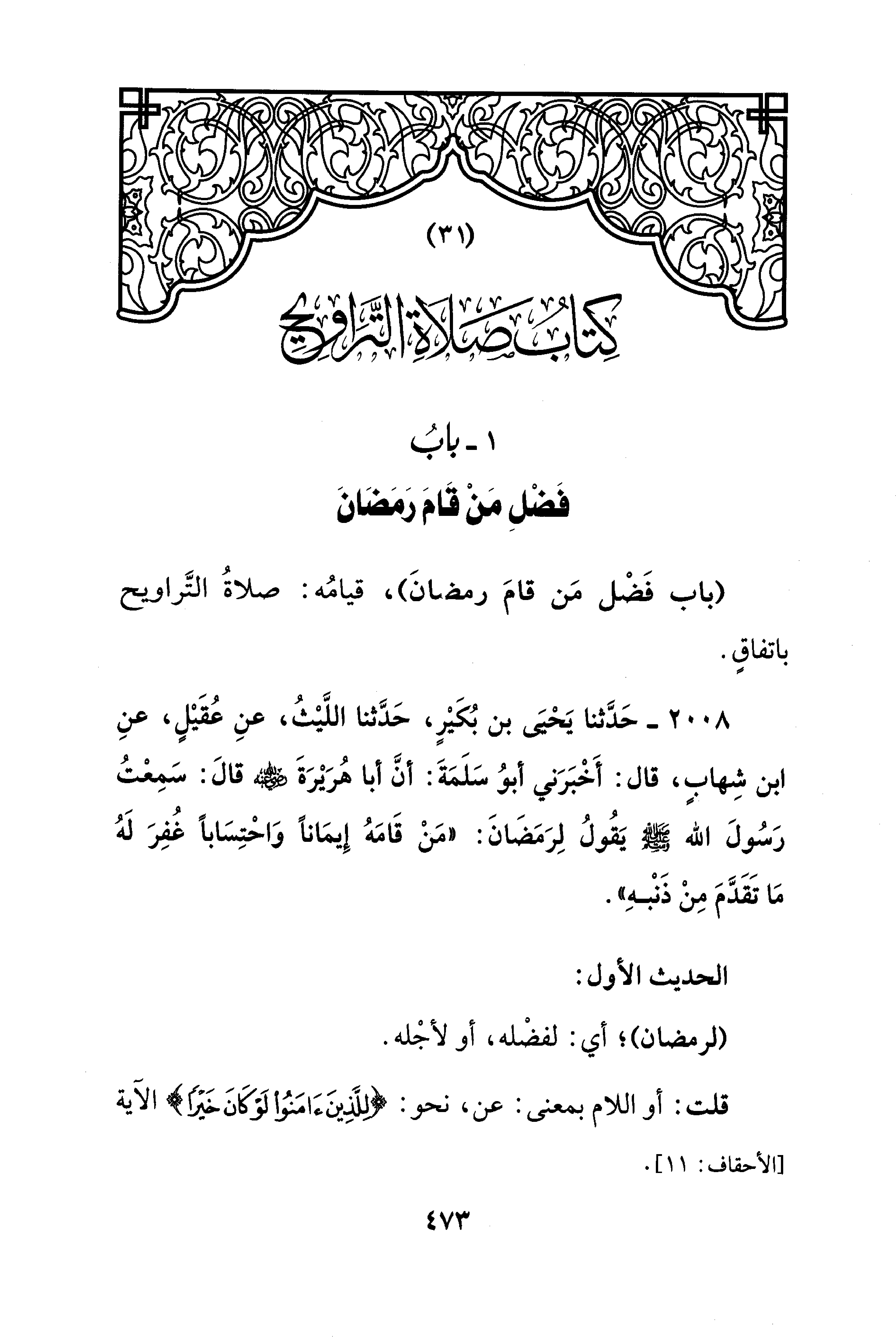 2008 - حَدَّثنا يَحْيَى بن بُكَيْرٍ، حَدَّثنا اللَّيْثُ، عنِ عُقَيْلٍ، عنِ ابن شِهابٍ، قال: أَخْبَرَني أبُو سَلَمَةَ: أنَّ أبا هُرَيْرَة - رضي الله عنه - قالَ: سَمِعتُ رَسُولَ الله - صلى الله عليه وسلم - يَقُولُ لِرَمَضَانَ: "مَنْ قَامَهُ إِيمَانًا وَاحْتِسَابًا غُفِرَ لَهُ مَا تَقَدَّمَ مِنْ ذَنْبهِ".